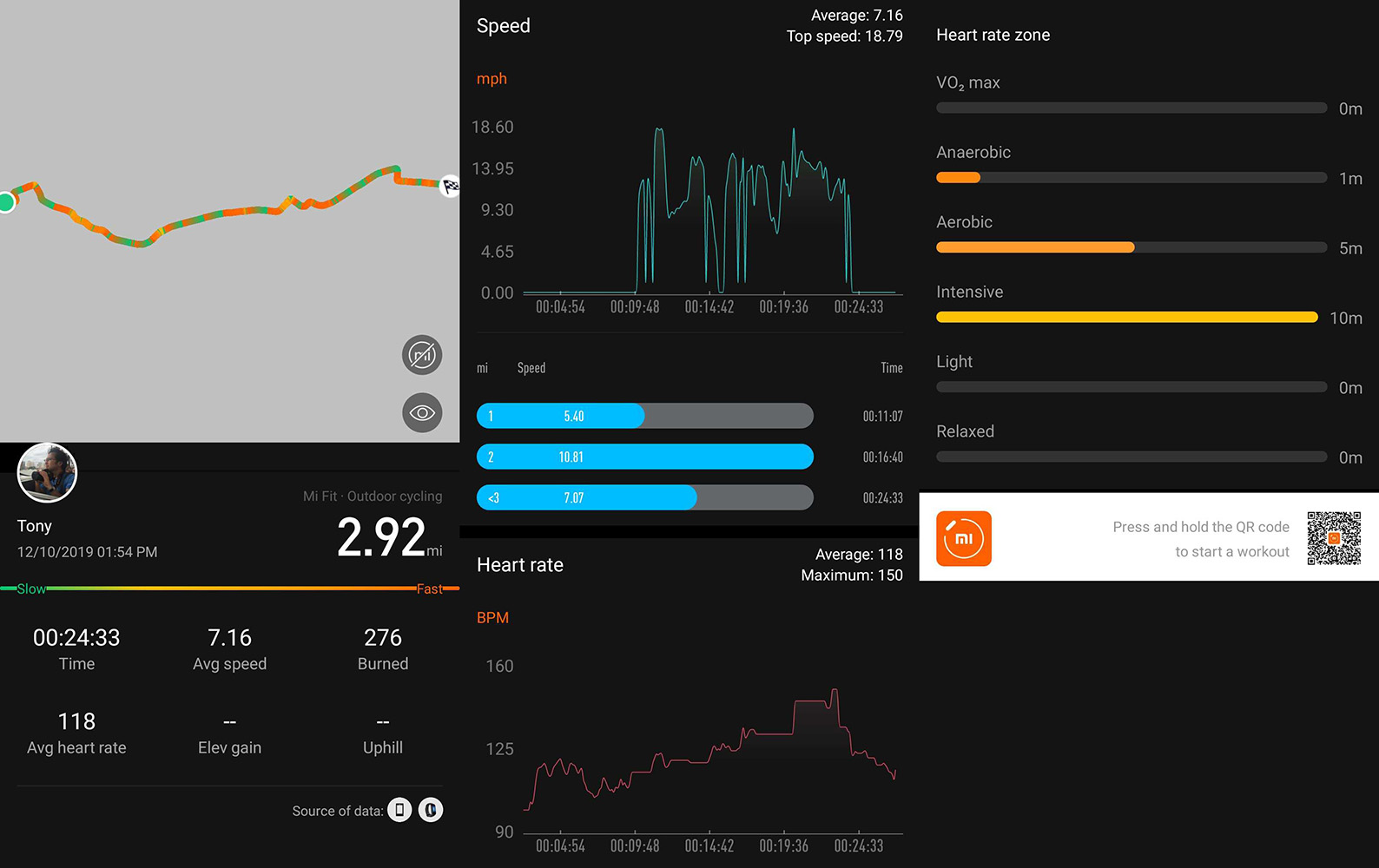 i tried using the bicycling syncing feature of the mi band 4. i couldn't really find any good instructions online, so i initiated cycle tracking by activating both the mi band and phone app, which worked great, very accurate tracking, but i ended up with two sets of the same data. next time i around i'll try it with just the mi band activated. it collected some interesting data, like where on my route i was traveling either slow or fast, my heart beat for the entire duration of the ride, and speed over time.