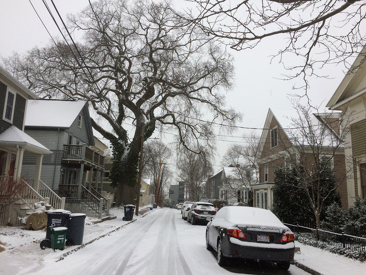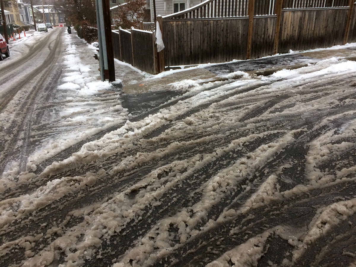 i ended up driving us back to the cafe. once we arrived, i drove the car to belmont to primarily clean the snow-covered solar panels but also to shovel the sidewalk (shovel task no.4) since my parents didn't do it this morning when they left for work. the roads were a dirty slushy slippery mess, like a battle zone. i drove slowly, occasionally feeling the anti-lock brakes engaging. by this point the snow has transitioned into a mix, sometimes ice crystals, sometimes snow hail, sometimes just pure rain. it was not the most pleasant working condition, especially up on a ladder.