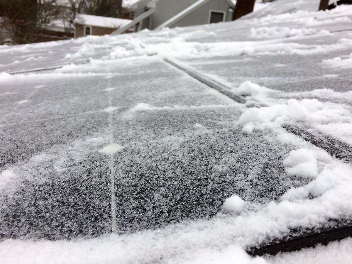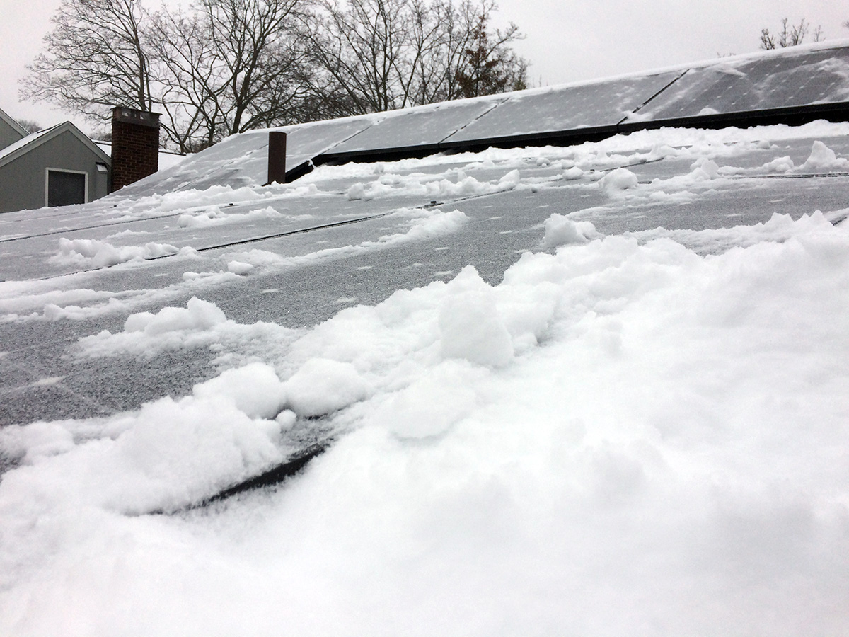fortunately the rain made the panels slippery enough so the snow came off more easily, but just as soon as i cleared a panel, a fresh coating of sleet would quickly cover it back up. i started from the sunroom first, clearing the bottom edge of the roof and lower panels from the step ladder. i then moved to the west side of the house, cleared the panels including 3 panels in the middle of the main roof, before clearing the sun room panels. the snow wasn't very thick (half of inch of slushy snow) and i could simply push clean those panels by standing with one leg on the room and another on top of the ladder. i made sure i pushed the extension ladder close to the side of the house, so i could brace myself. once that was done, i moved the extension ladder to the east side and cleaned off the 3 panels there. there was a 4th panel that was already clean when i arrived, but was covered in an icy layer of semi-transparent frozen snow.