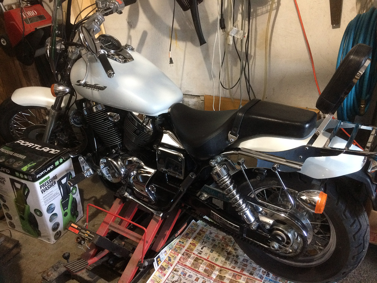 we waited for the engine to quietly quit on its own. usually it takes several minutes, but this time around it died much sooner. i tried starting the engine on its own but it wouldn't start, so i had to use the jumper battery again. i did this a few more times, wanting to make sure there was no more fuel left in the carburetor. once that was done, i removed the battery to be trickle-charged indoors. finally, i put down some newspaper and got the chain wax spray to lubricate the chain before final storage. while my father spun the rear wheel, i sprayed the chain. however, eventual it stopped spraying even though the canister still felt full. i bought this chain lube 10 years ago, it's probably gone bad now, the wax having precipitates out of the mixture. in fact, it should've sprayed on as a white foam, but all that came out was just oil. i'll need to get a new can and spray again. i also noticed one of the chain link looked like it was kinked. i've never really taken any effort to clean the chain, i wonder now if the chain is okay or needs replacing come springtime. it's probably not something i can do on my own and need to take it into the shop again.