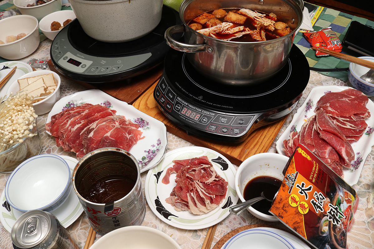 my sister came home because she wanted to eat hot pot. i've been trying to get my mother to agree to hot pot for years, but she's always refused, but when my sister brings it up, we have it immediately. because it was so impromptu, and all the supermarkets were closed, we only had a limited amount of ingredients. i also wasn't mentally ready for hot pot. we had some sichuan hot pot soup base but it wasn't very good, made the broth turn nearly black and wasn't spicy nor numbing, the hallmark of good sichuan hot pot. i was also worried that the house would reek of hot pot (which ended up being the case). since my sister can't eat spicy, she had her own induction cooker with her own pot. her broth was taking forever to heat up while ours was already boiling. she discovered she didn't turn on the cooker, then had to wait nearly half an hour for her broth to come to a boil, by which point we were already done eating.
