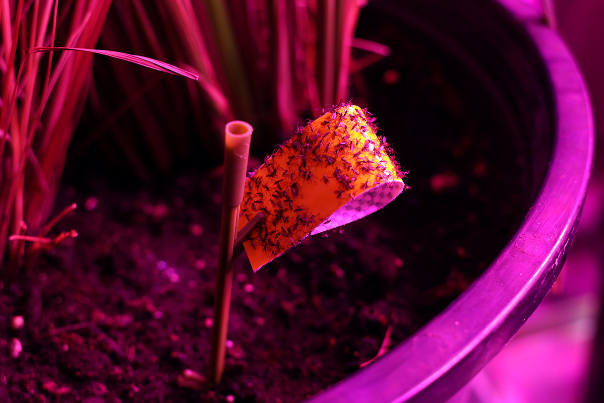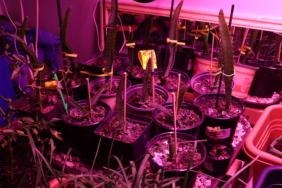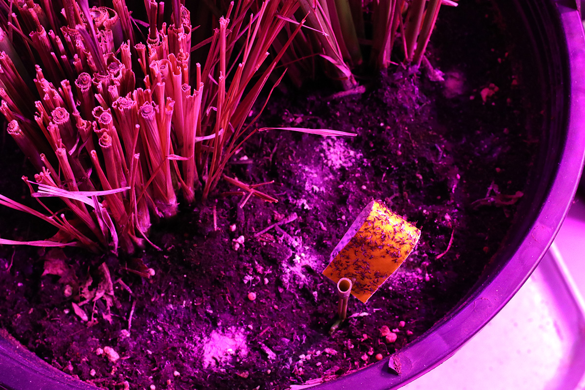 i also went to the grow house to stake a few cactuses. sunday i added a bunch more yellow sticky traps to keep the fungus gnats in check (i also ordered some more traps off of ebay last night); less than 48 hours later, a few of those traps are now covered in bugs! especially the lemongrass soil, that must be infested with gnat larvae. i only have a few more traps left before my resupply arrives. i ended up dusting some of the dirt with diatomaceous earth powder. it works slowly, such that i wonder if it even works at all. in the meantime, i'm going with my strategy of only watering the plants once a week, to let the top of the soil dry, since the worms can't survive when it's not wet.