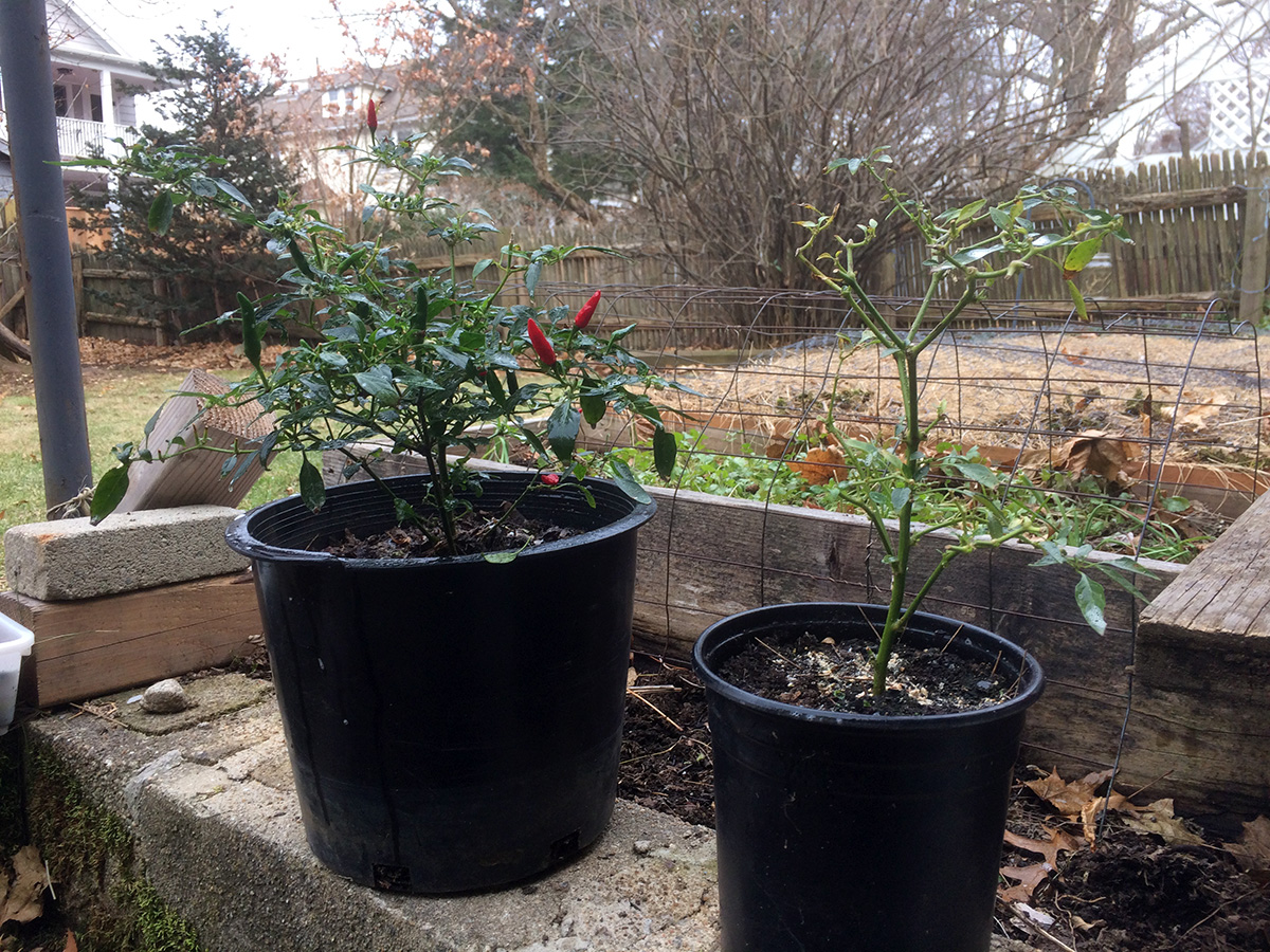 as it wasn't too cold, i took the pepper plants outside to spray them with insecticidal soap. what amazes me about the thai chili pepper plant is it continues to produce hot peppers even during the winter.