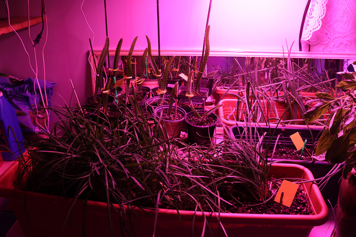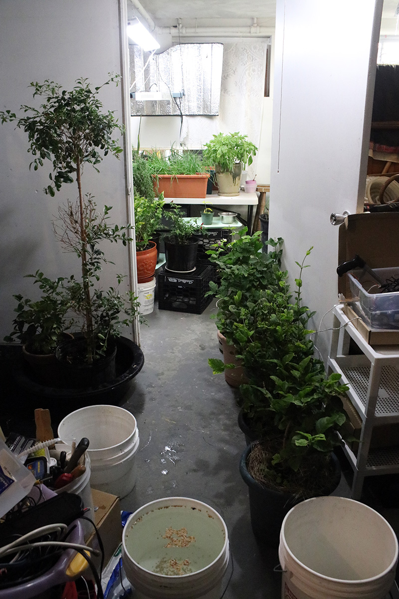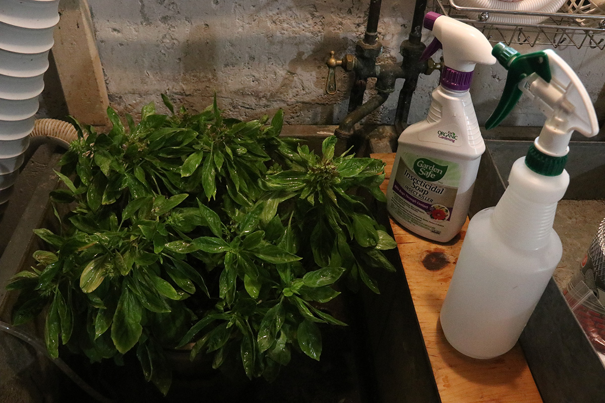 it wasn't difficult to soil drench all the plants. the hardest part was just moving them in and out, and not getting water on the floor. every once in a while i also had to stop and refill the buckets and add more mosquito bits. even the orchid pots i watered, then poured the water back out (orchid pots have no holes, uses fibrous wood chunks as growing medium). i went through 3 buckets of water. i filled a 4th bucket but i ended up not needing it; i'll leave it for the next watering, but don't know if i'll actually use it as i probably want to use a fresh batch (though old Bti-infused water might contain even more bacteria). i left the water outside of the grow room, just to keep it safe from UV sterilization. i sprayed insecticidal soap on the thai bail and the hot pepper. thai basil is kind of funny, it sort of resembles marijuana and has a similar smell. i snipped off the flowers to induce more leaf growth.
