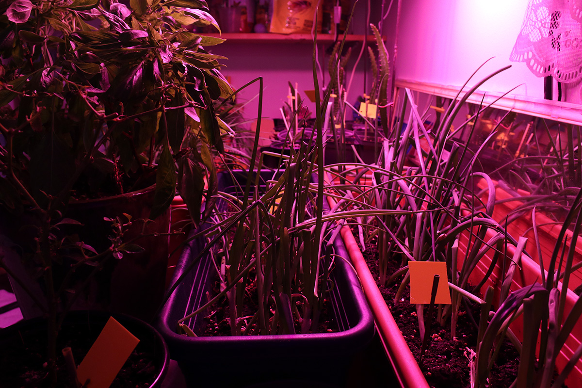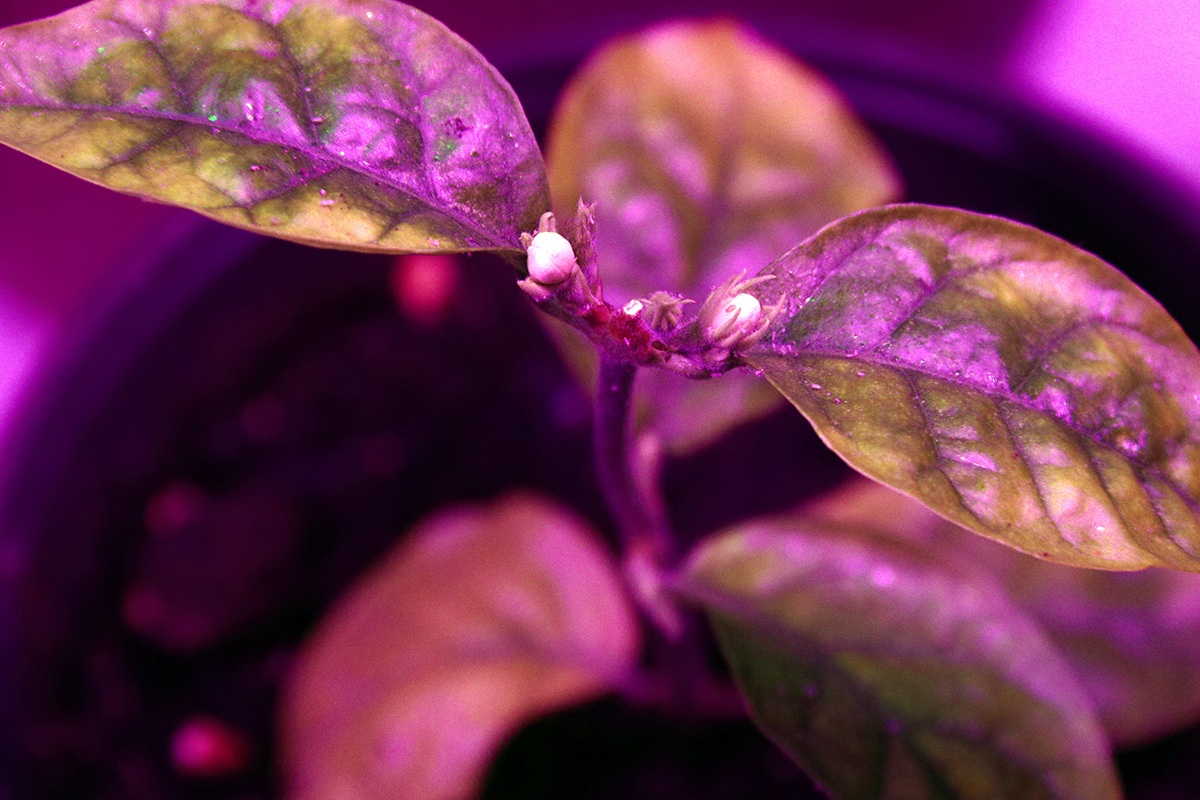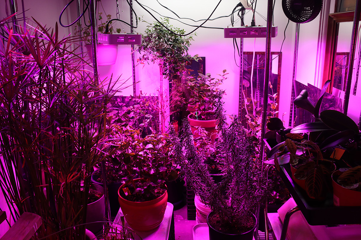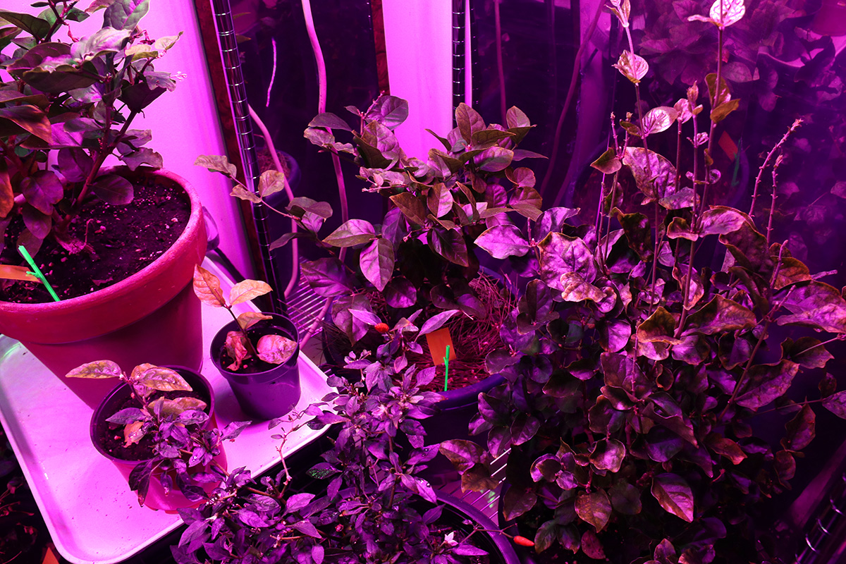 it wasn't difficult to soil drench all the plants. the hardest part was just moving them in and out, and not getting water on the floor. every once in a while i also had to stop and refill the buckets and add more mosquito bits. even the orchid pots i watered, then poured the water back out (orchid pots have no holes, uses fibrous wood chunks as growing medium). i went through 3 buckets of water. i filled a 4th bucket but i ended up not needing it; i'll leave it for the next watering, but don't know if i'll actually use it as i probably want to use a fresh batch (though old Bti-infused water might contain even more bacteria). i left the water outside of the grow room, just to keep it safe from UV sterilization. i sprayed insecticidal soap on the thai bail and the hot pepper. thai basil is kind of funny, it sort of resembles marijuana and has a similar smell. i snipped off the flowers to induce more leaf growth.