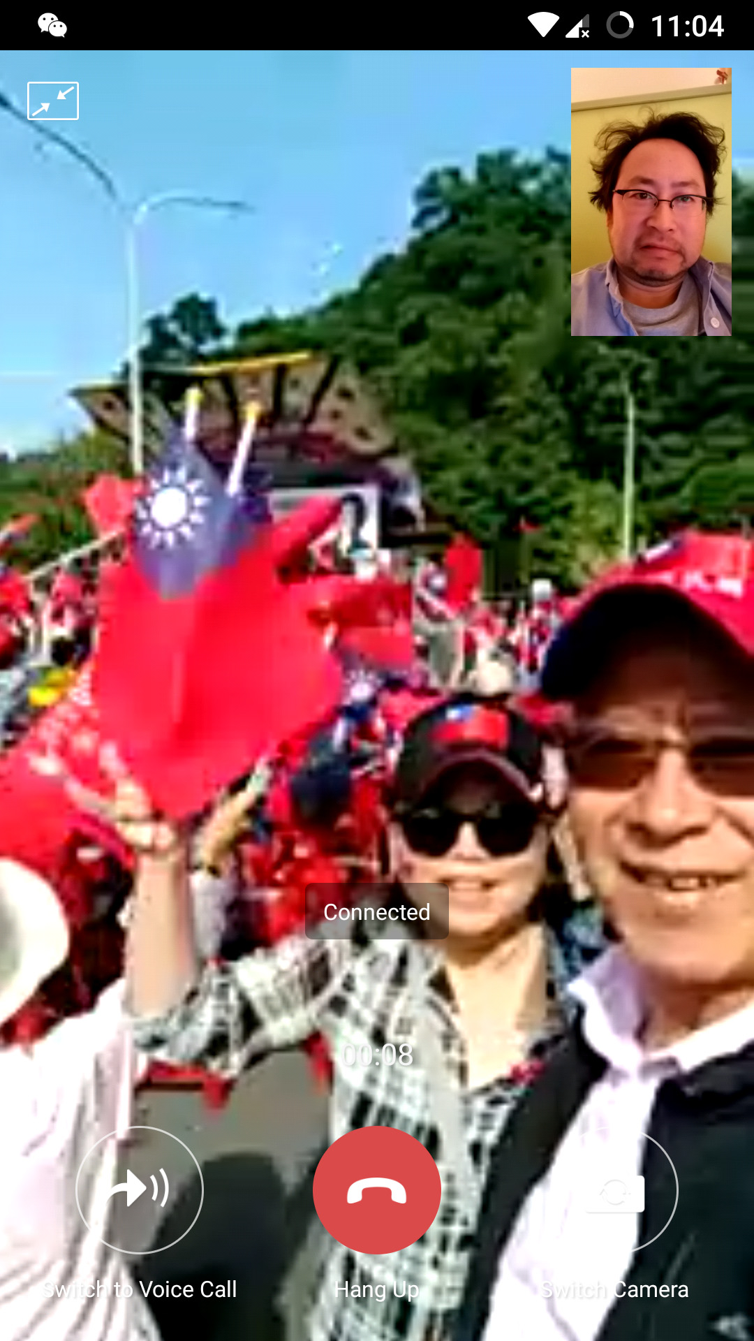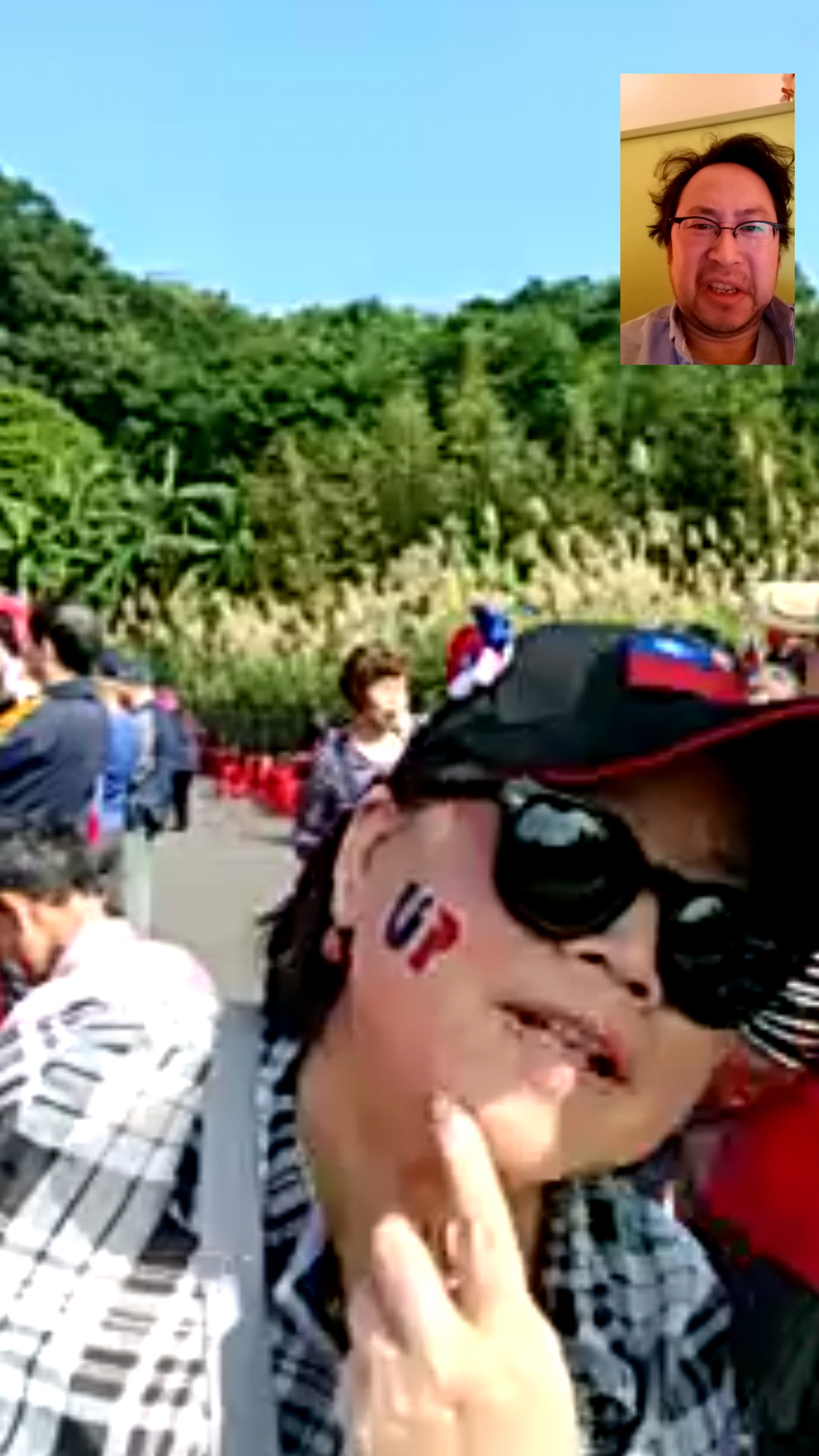 my parents video chatted me from taiwan, at some KMT rally in keelung. my mother had told me in another conversation that they've had good weather during the whole time they've been in taiwan, but too hot for them. we only spoke briefly, they just wanted to show me the rally.