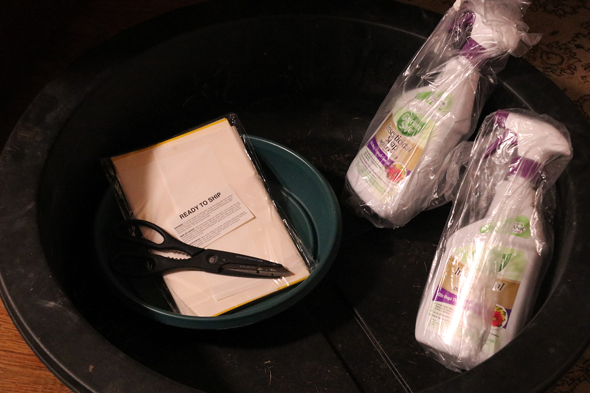 i started by moving out the plants from the grow room. if the weather was warmer i could've done it outside (less messy), but still better to do it indoors, to prevent any plants from getting temperature shock. earlier i got the jumbo black plastic bin from the garage, to be used as a catch basin so i don't get water all over the floor as i water the plants. i then mixed the buckets of Bti-infused water. each bucket held 3.5 gallons of water, and using the ratio of 1 tsp of mosquito bits per gallon, i then added 3.5 teaspoons of pellets into the bucket. mosquito bits have a musky smell, not unpleasant but distinctive. i'd never used so much pellets before, but i have a large jug of it, better to use it up before it expires. i knew it was working because the water went from clear to cloudy, as the bacteria quickly multiplied. i just used regular tap water; i could've treated it with water conditioner, but instructions i read online said nothing about dechlorinating so i didn't bother. i then left the Bti to populate the water, giving each bucket at least 5 minutes.