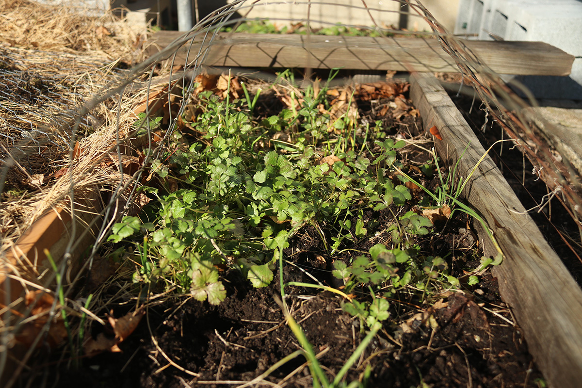 i went into the backyard and took a garden survey. though it's only mid-january, it felt more like late-spring early-summer. best thing was there was no bugs. the wind was so strong that it blew off the southwest corner rain barrel from its cinder block pedestal. i didn't have to fill the bird feeder since i already did it on wednesday; i didn't see birds however, maybe because it was too windy. the dead mouse i left outside was missing; i was happy some critter took it, but later saw it'd simply gotten blown away by the wind; i ended up burying it. not much else was going on in the backyard. i noticed buds on both the hydrangea and flowering cherry tree, but not yet swelling. the only thing that seemed to be growing was a patch of cilantro.