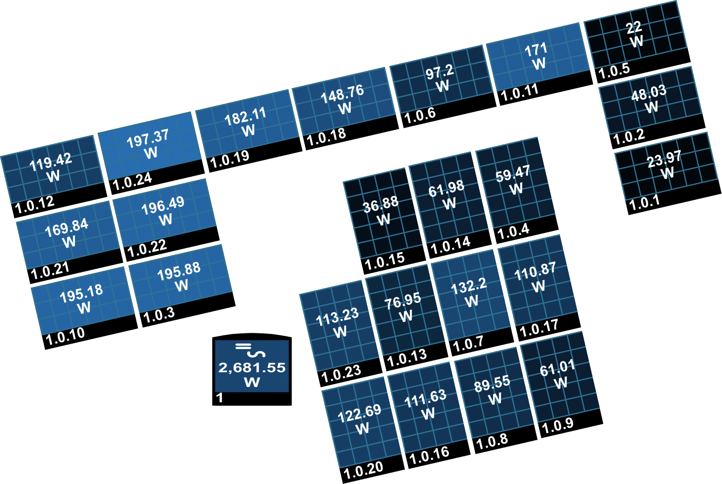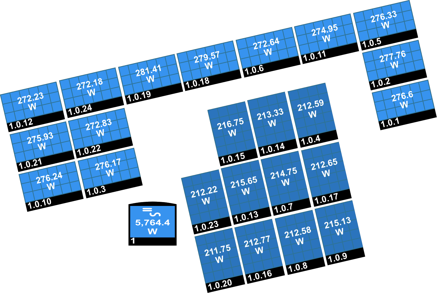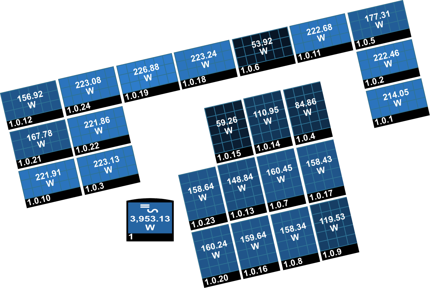 keeping my eye on the solar production, i noticed we weren't hitting the maximum despite a sunny clear blue sky day. checking the layout view of the solaredge admin page, i saw production wasn't uniform, meaning some panels were partially eclipsed by the snow. fortunately by around 11am, production finally turned constant, meaning whatever snow remained on the panels had all melted away.