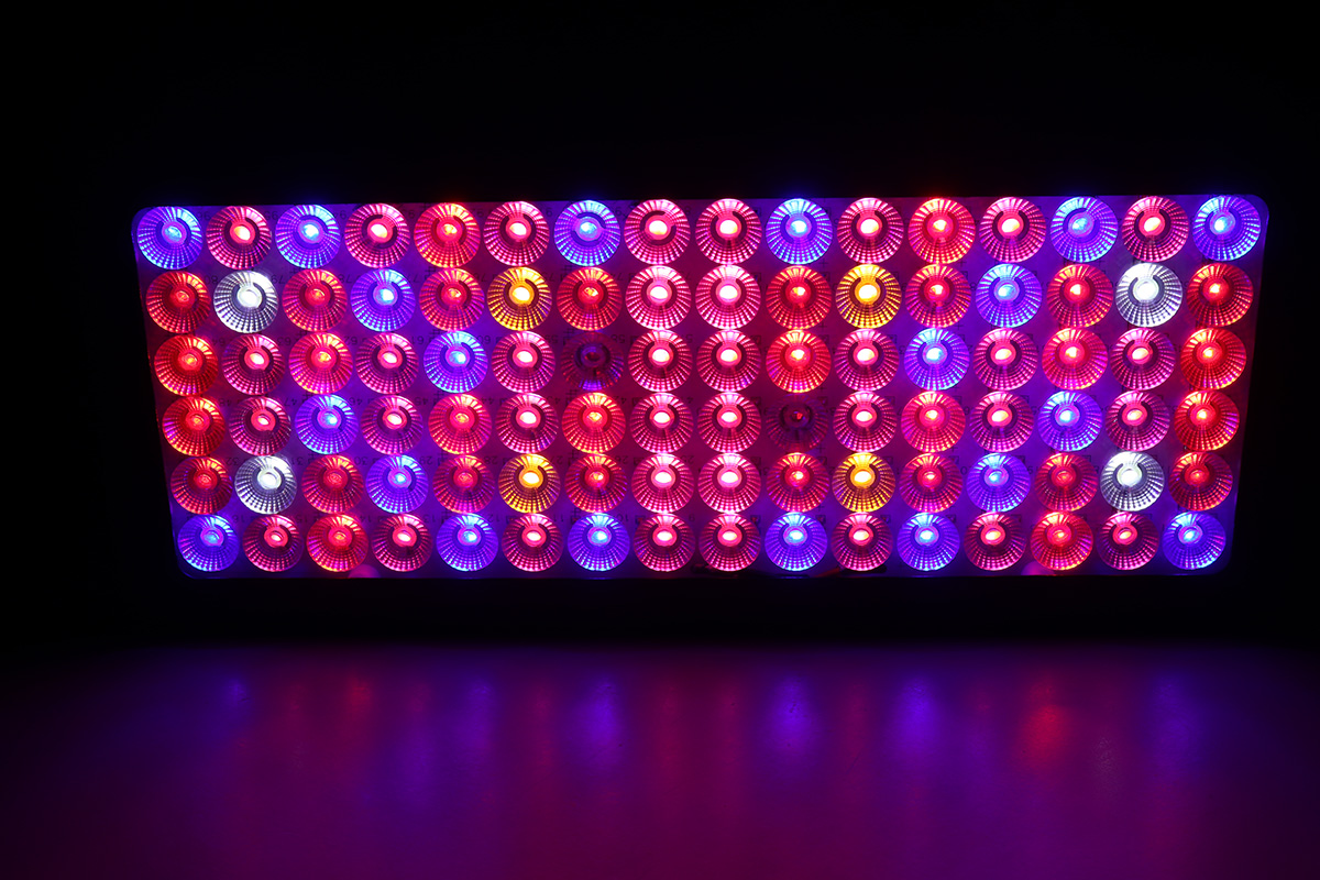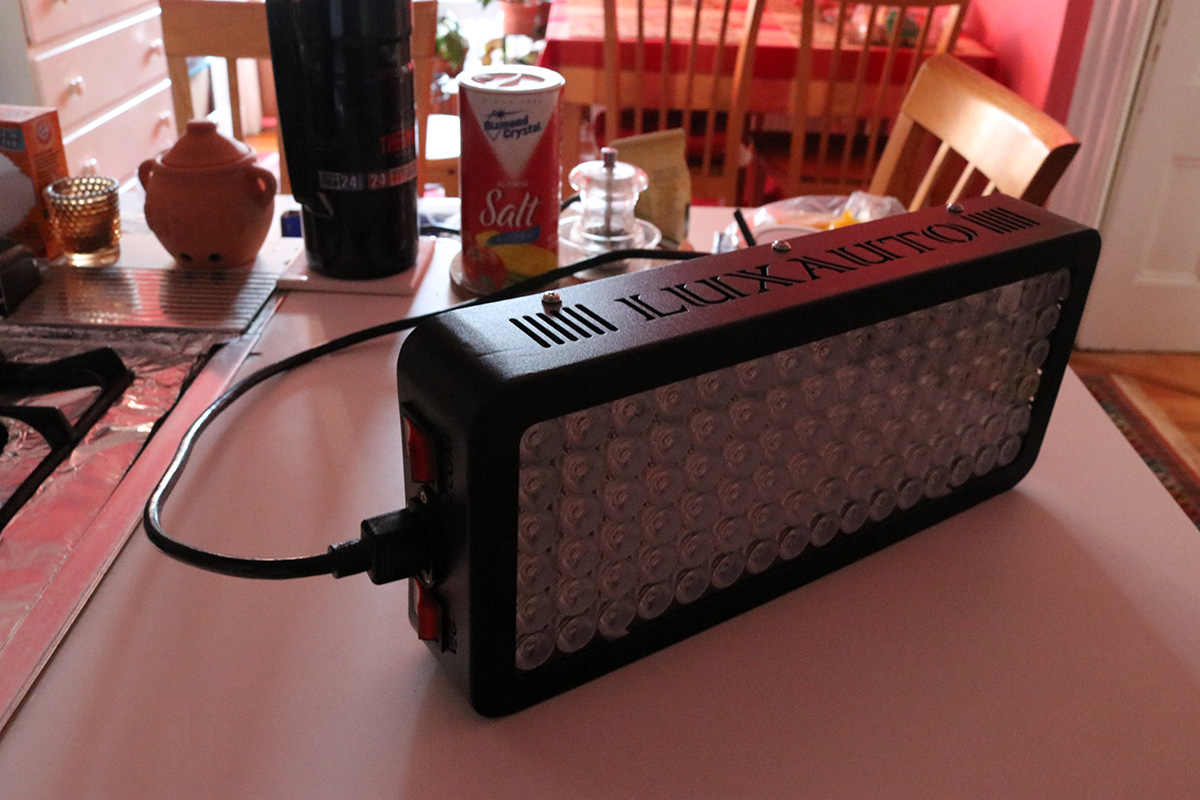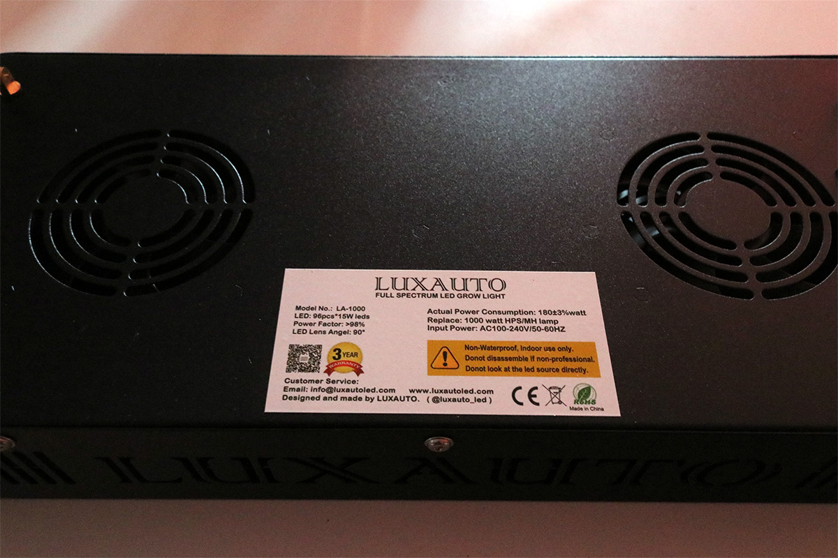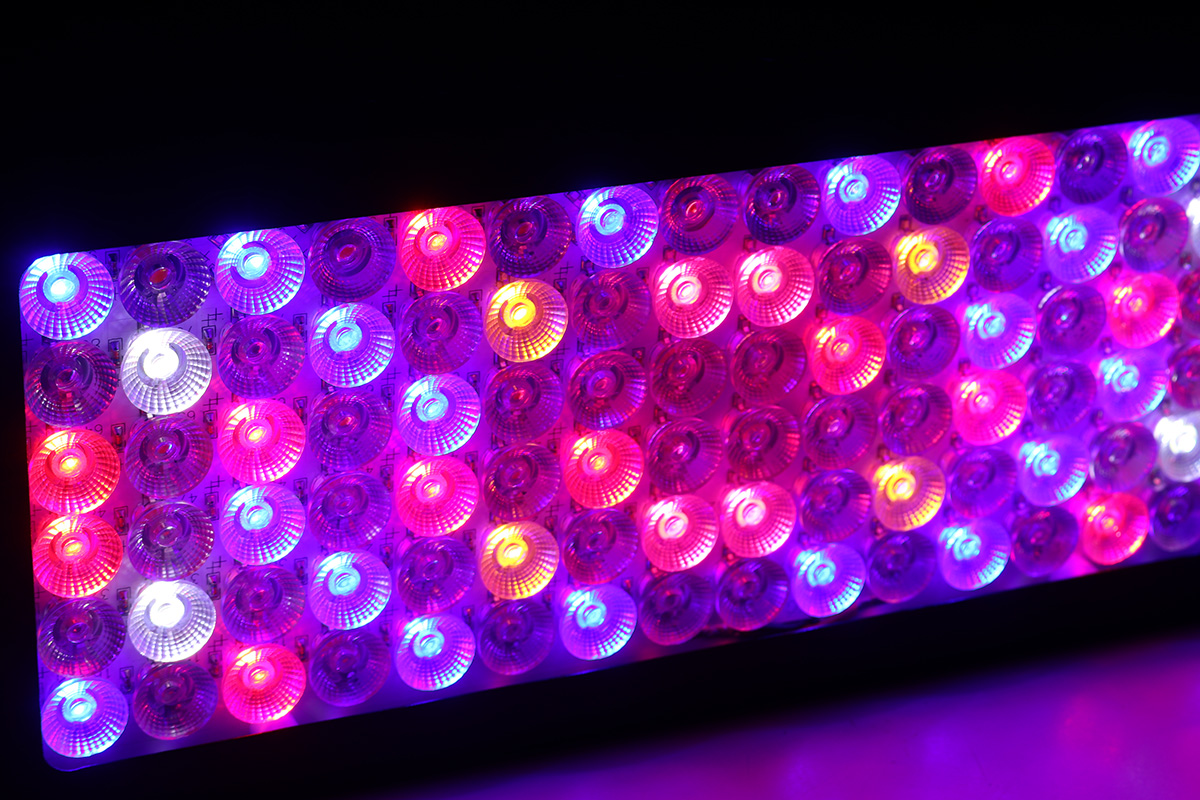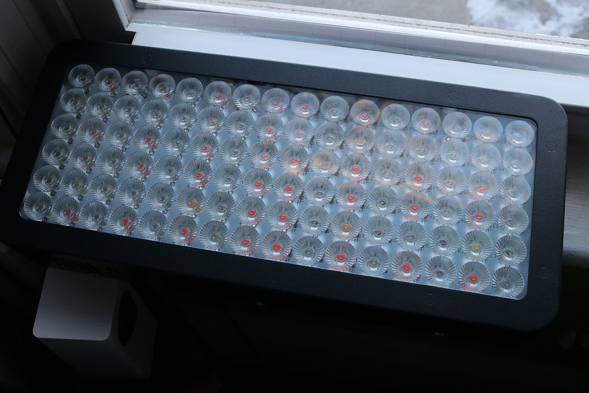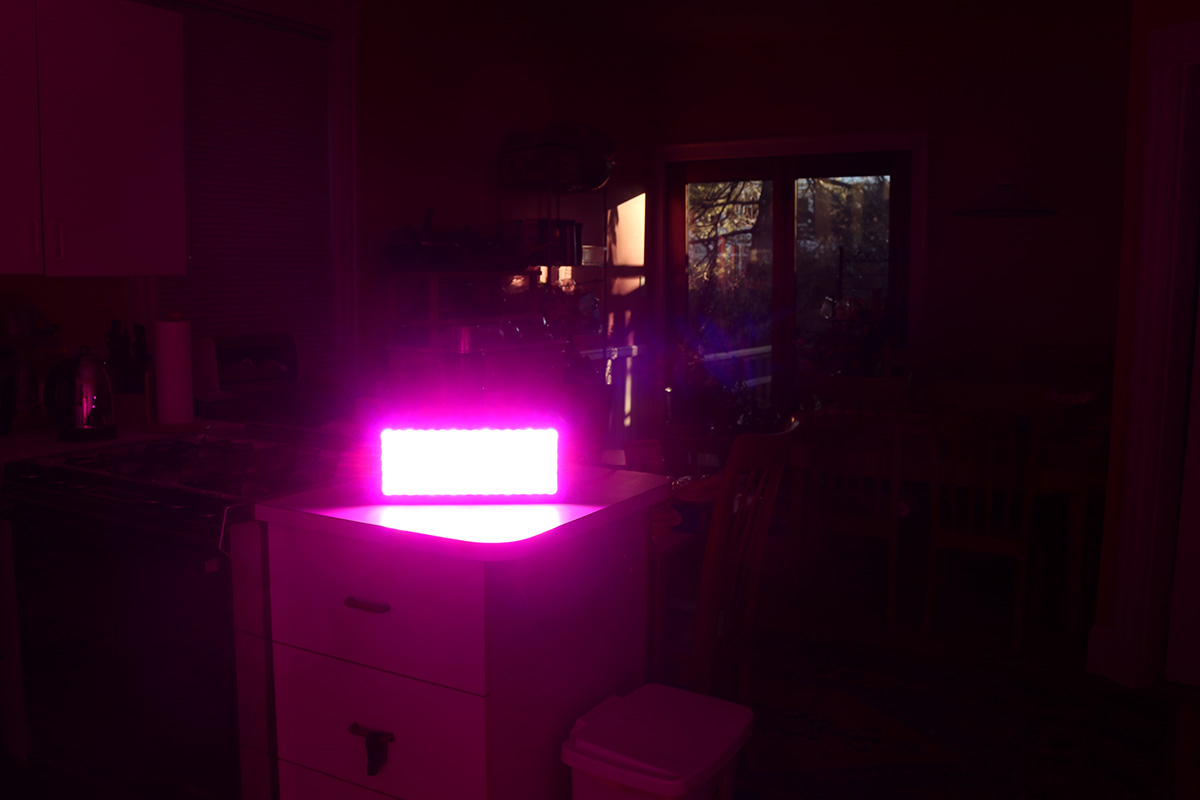 the luxauto light was longer than the 3 led lights we currently own. it was also in black while the others are white. the luxauto felt heavier, weighing at 6.18 lbs. the power draw is 180W (according to specs, i'll need to do any actual measurement at some point). when it got here it was freezing cold, i let it warm up a bit before plugging it in the kitchen. even though it only has 96 LED's, when i turned it on, it was like having a magenta sun in the kitchen. people outside probably could've seen the unnatural glow coming from inside the house. i think the reflectors really help the light to focus each one of the 15W LED's. it's impossible to look at it directly without fear of permanent eye damage. i used my camera to examine the lights. the reflectors are kind of pretty, makes the light look like an array of colorful crystal light fixtures. two of the LED's are dim, those would be the IR LED's. not bad for a $54 light.