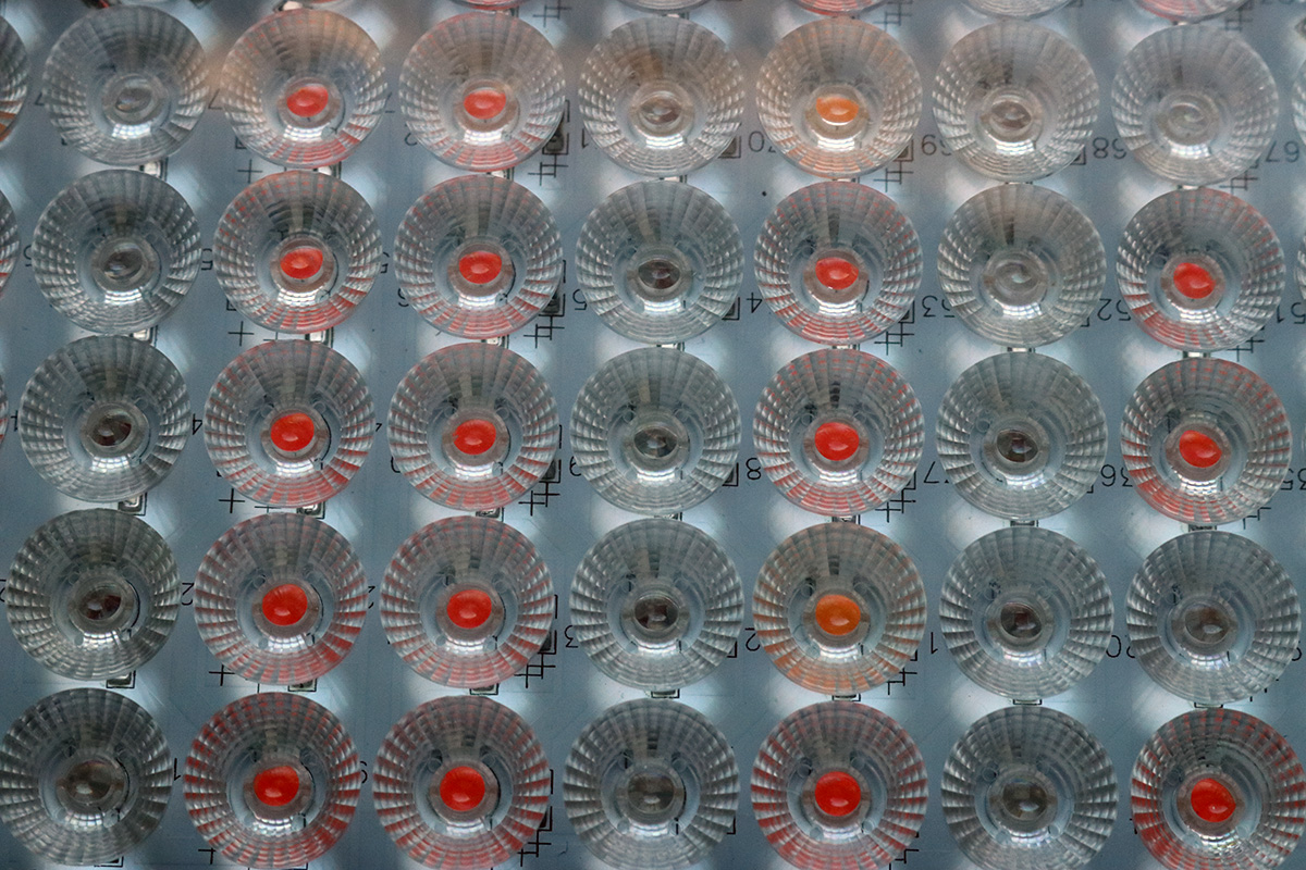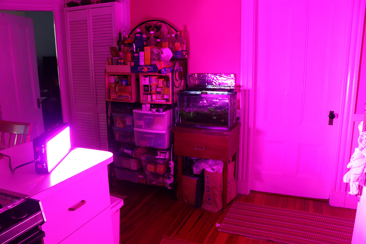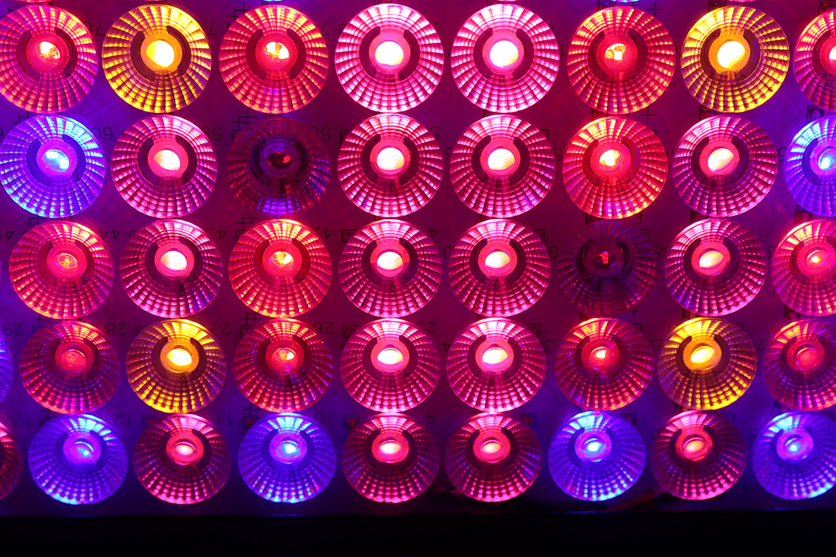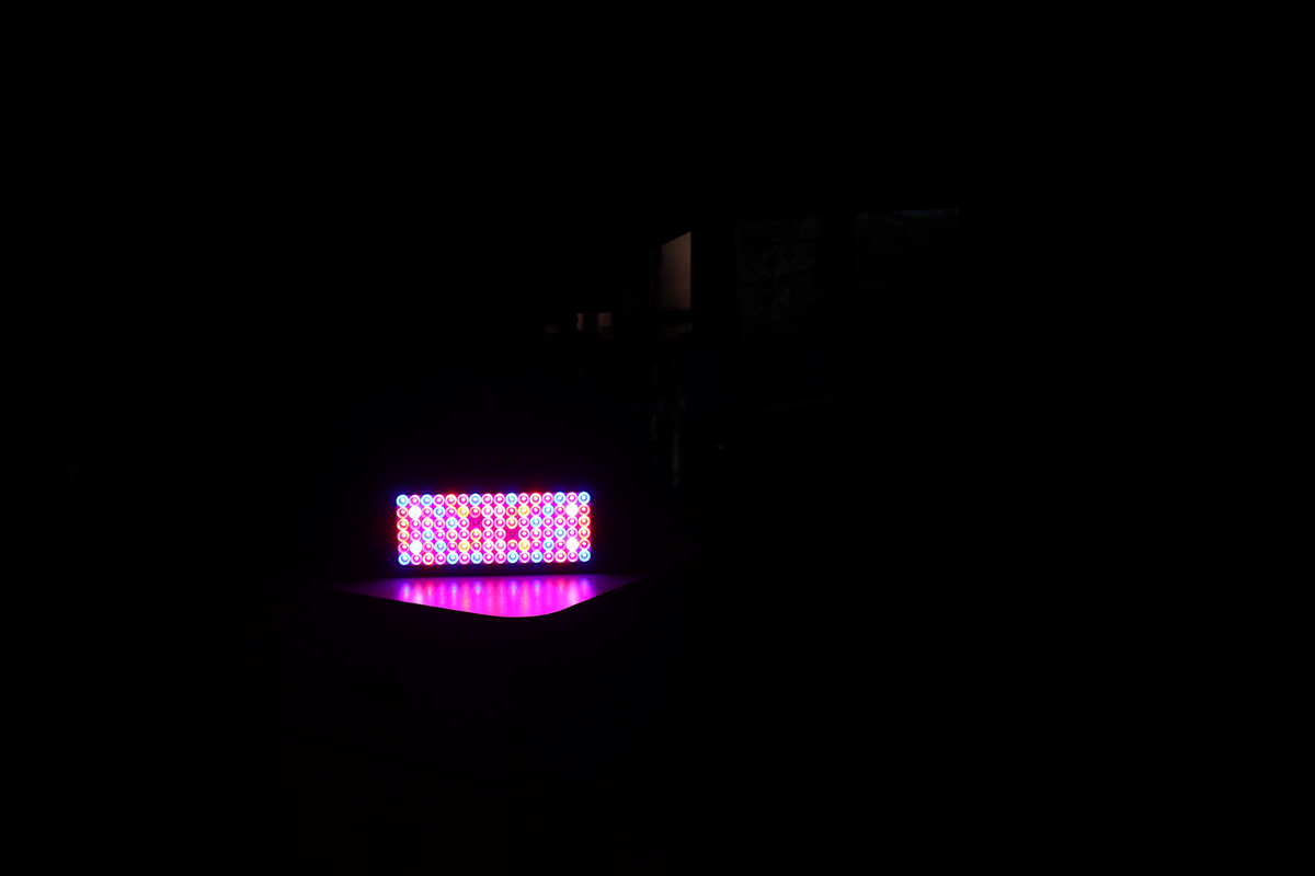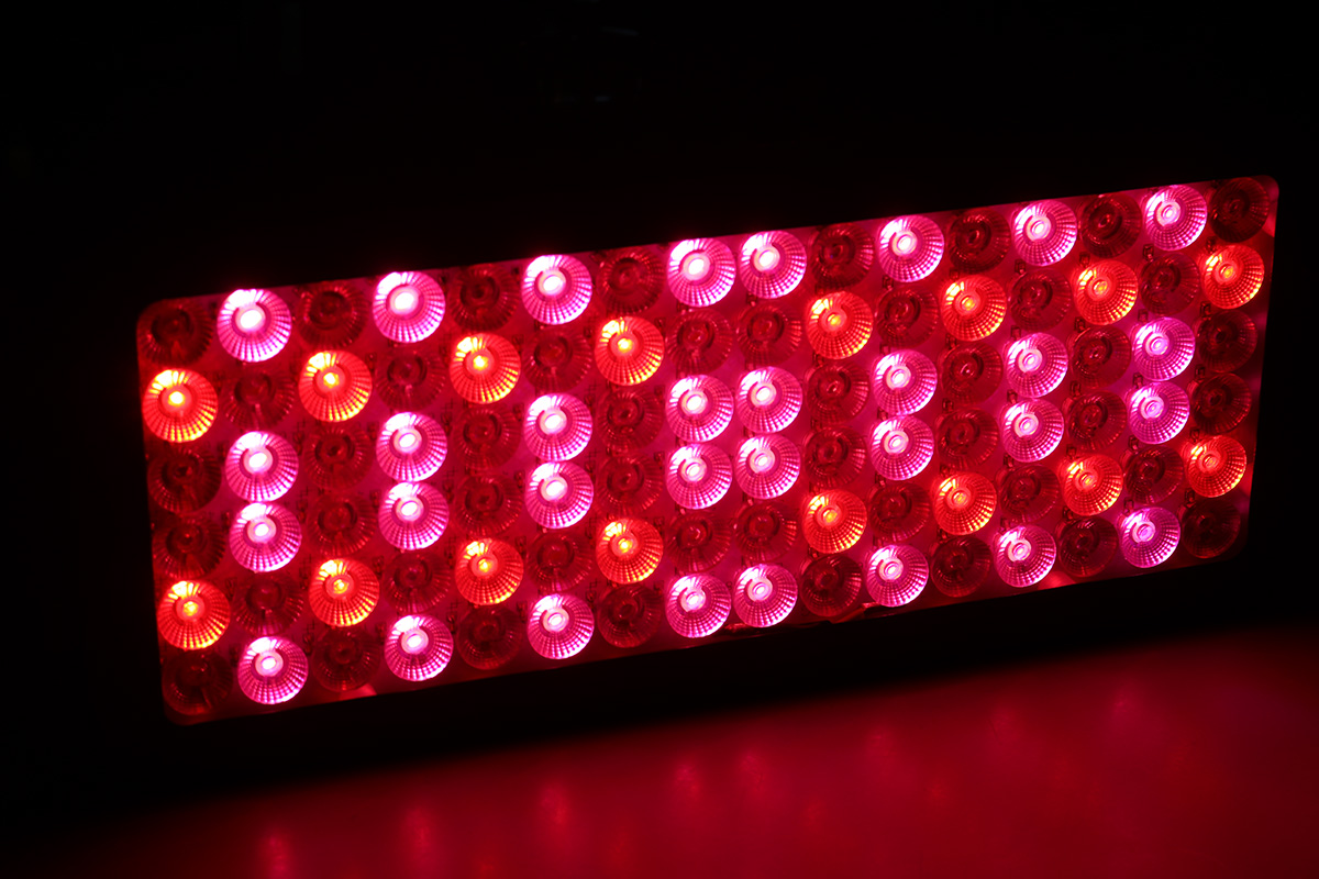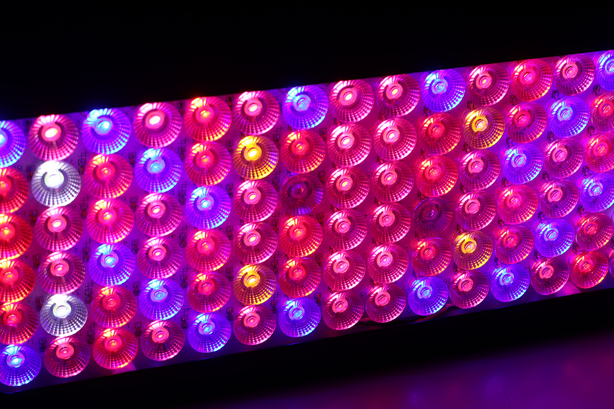 the luxauto light was longer than the 3 led lights we currently own. it was also in black while the others are white. the luxauto felt heavier, weighing at 6.18 lbs. the power draw is 180W (according to specs, i'll need to do any actual measurement at some point). when it got here it was freezing cold, i let it warm up a bit before plugging it in the kitchen. even though it only has 96 LED's, when i turned it on, it was like having a magenta sun in the kitchen. people outside probably could've seen the unnatural glow coming from inside the house. i think the reflectors really help the light to focus each one of the 15W LED's. it's impossible to look at it directly without fear of permanent eye damage. i used my camera to examine the lights. the reflectors are kind of pretty, makes the light look like an array of colorful crystal light fixtures. two of the LED's are dim, those would be the IR LED's. not bad for a $54 light.