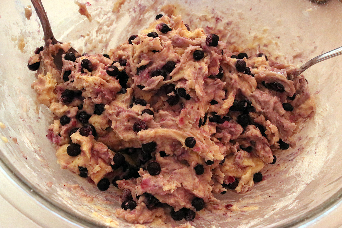 | thaw butter overnight. cream butter & sugar; add eggs, vanilla, juice; mix dry ingredients into batter 1/3 at a time, adding some half and half in between. mix in blueberries. spoon into jumbo muffin pan. top with sparkling sugar. bake at 425°F 10 min. 375°F 30 mins. + additional 10 minutes | |