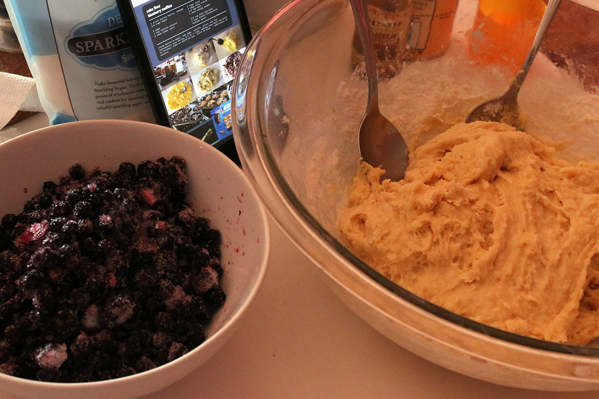 i made blueberry muffins in the late morning, got inspired, but also because i wanted to use up the 2 frozen bags of wild blueberries in my freezer that been there from at least last september, which was the last time i made muffins. last night i set out a stick of butter to thaw overnight; the butter belonged to annie, so it's been in the fridge since august, which was when annie and her mother left. it's high quality butter (kerrygold), much better than the generic stuff i normally buy, but after nearly half a year in the fridge, i can't imagine it to be very good anymore.