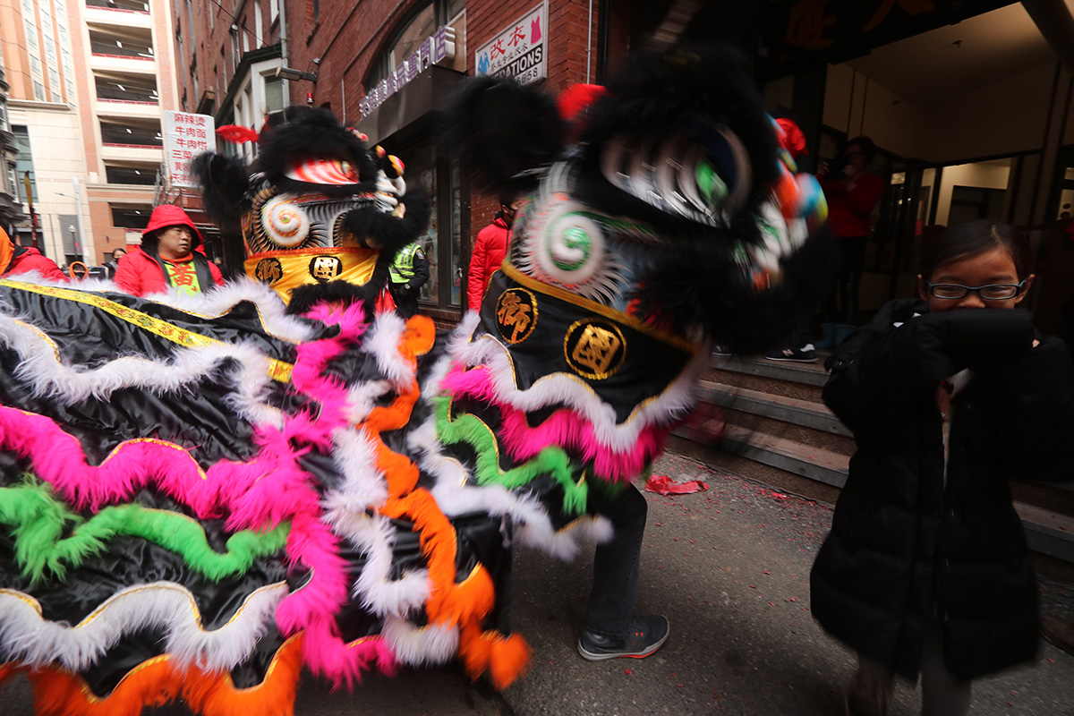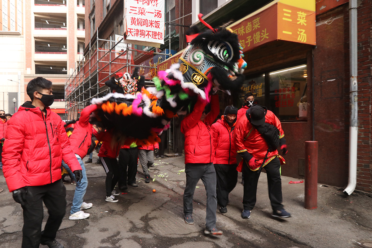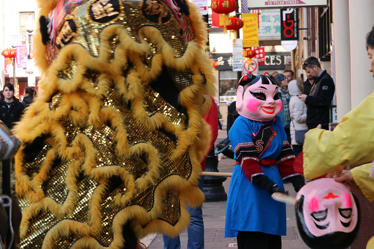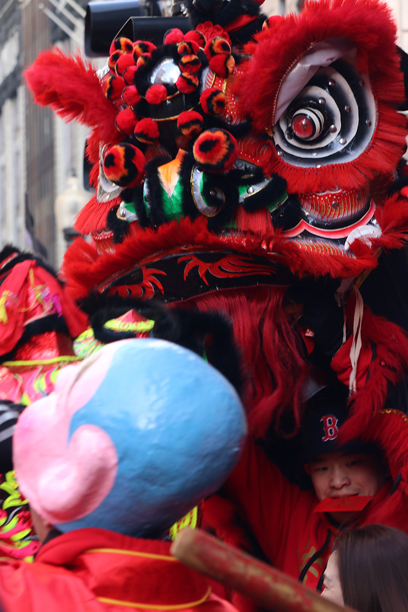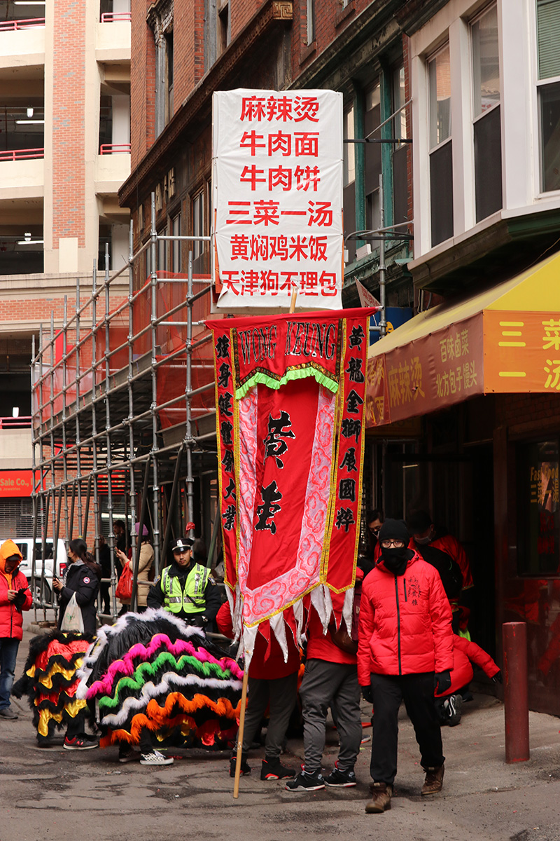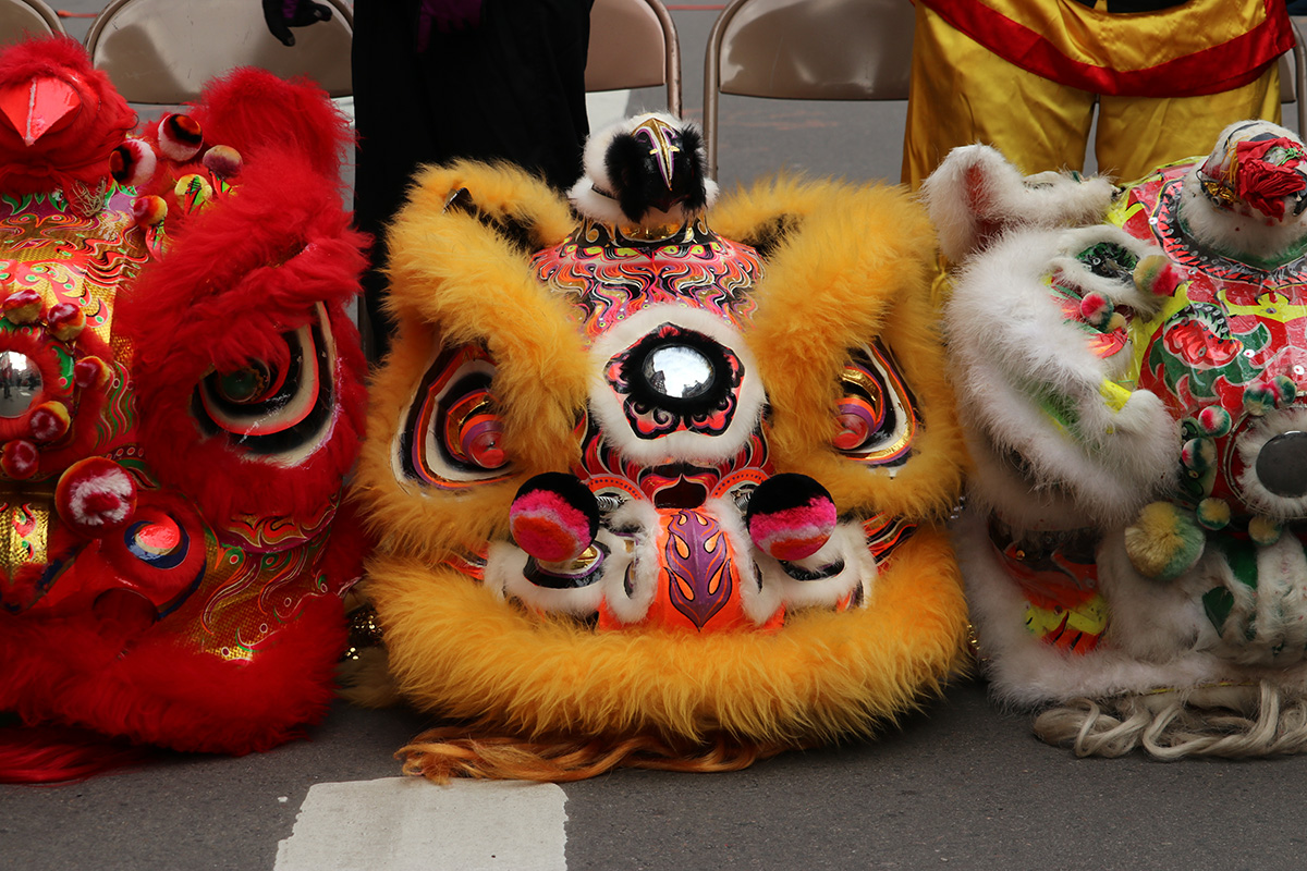 i arrived by 9:45am. i thought the ceremony had already started because i heard drumming, but it was just the different lion dance troupes practicing. the first thing i noticed after i parked my bike was how quiet and desolate chinatown had become. sure, they closed off the streets, but there didn't seem to be anyone, just a few handful of locals standing on the curb, waiting for the lion dance to begin. there was hardly any people. i was seriously beginning to think maybe the coronavirus had scared off a lot of spectators. but as we got closer to showdown, more people started showing up, both onlookers and performers. a large troupe of lion dancers marched into chinatown. i think roused by the commotion, more tourists began showing up as well. in the end, i estimate roughly the same number of people came today as there was last year.