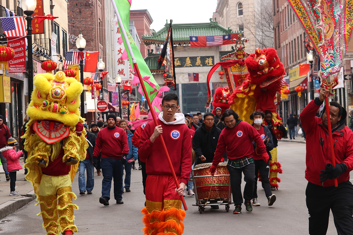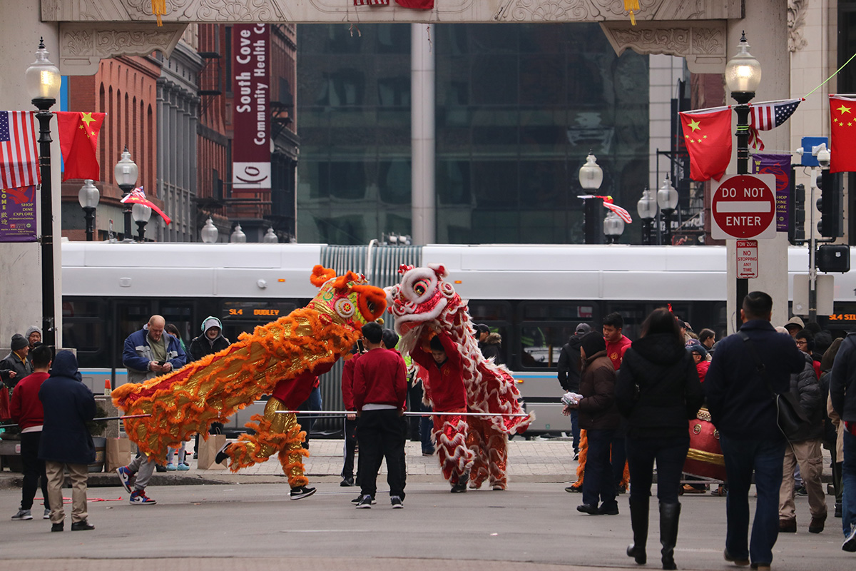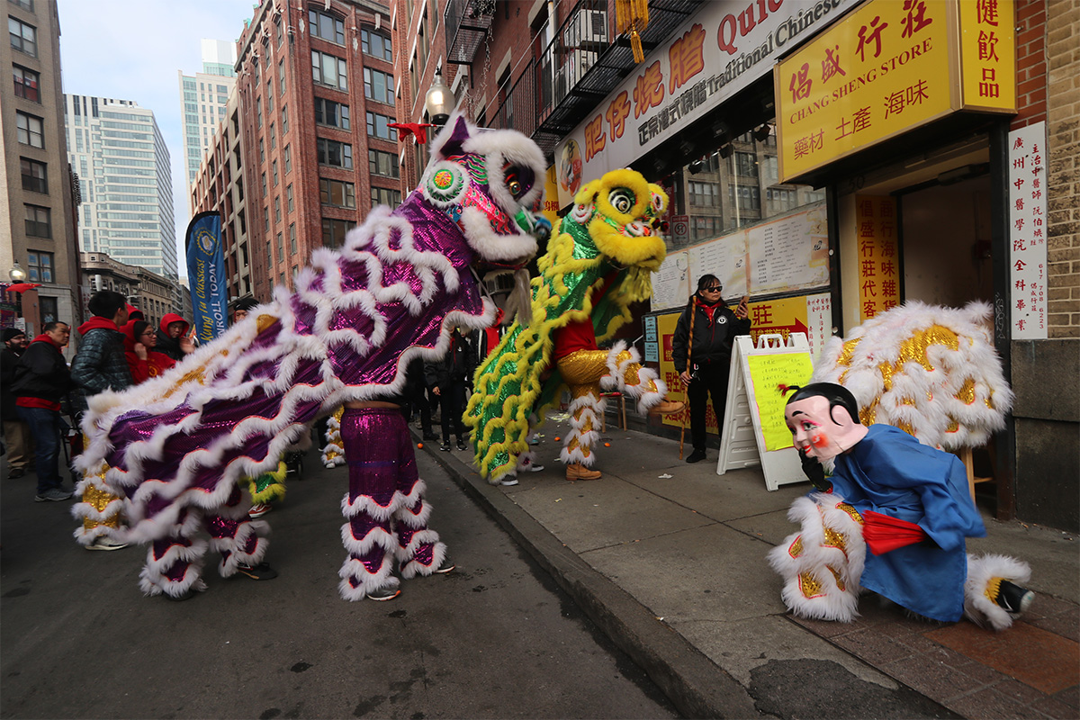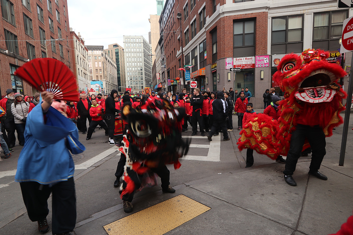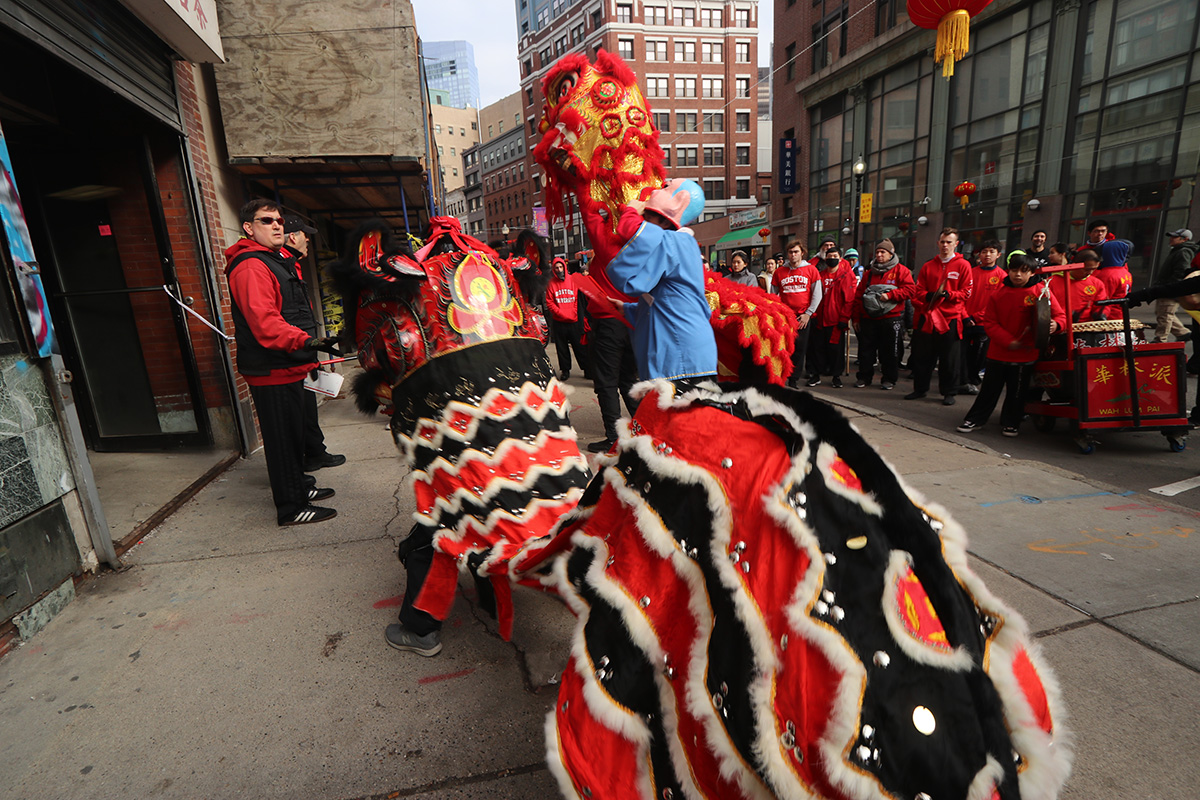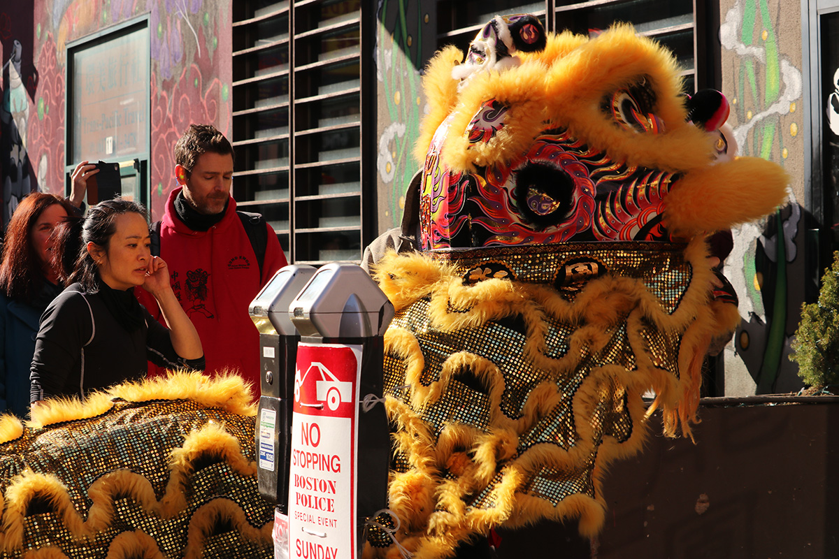 i went to bed last night at 3am. i set the alarm for 8:30am, but my synchronized mi band started vibrating at 7:30am. there's some bug with the software where it always vibrated an hour before the alarm goes off, not sure why. when my phone alarm went off an hour later, i snoozed it to 9am. the lion dance didn't start until 10am, i still had plenty of time to make it to boston. temperature was in the upper 30's but supposed to reach the lower 40's later in the day. sunday morning there wasn't a lot of traffic. there seemed to be some cambridge/somerville road race taking place, and the closer i got to kendall square, the more runners i saw arriving for the event that starts at 10am.
