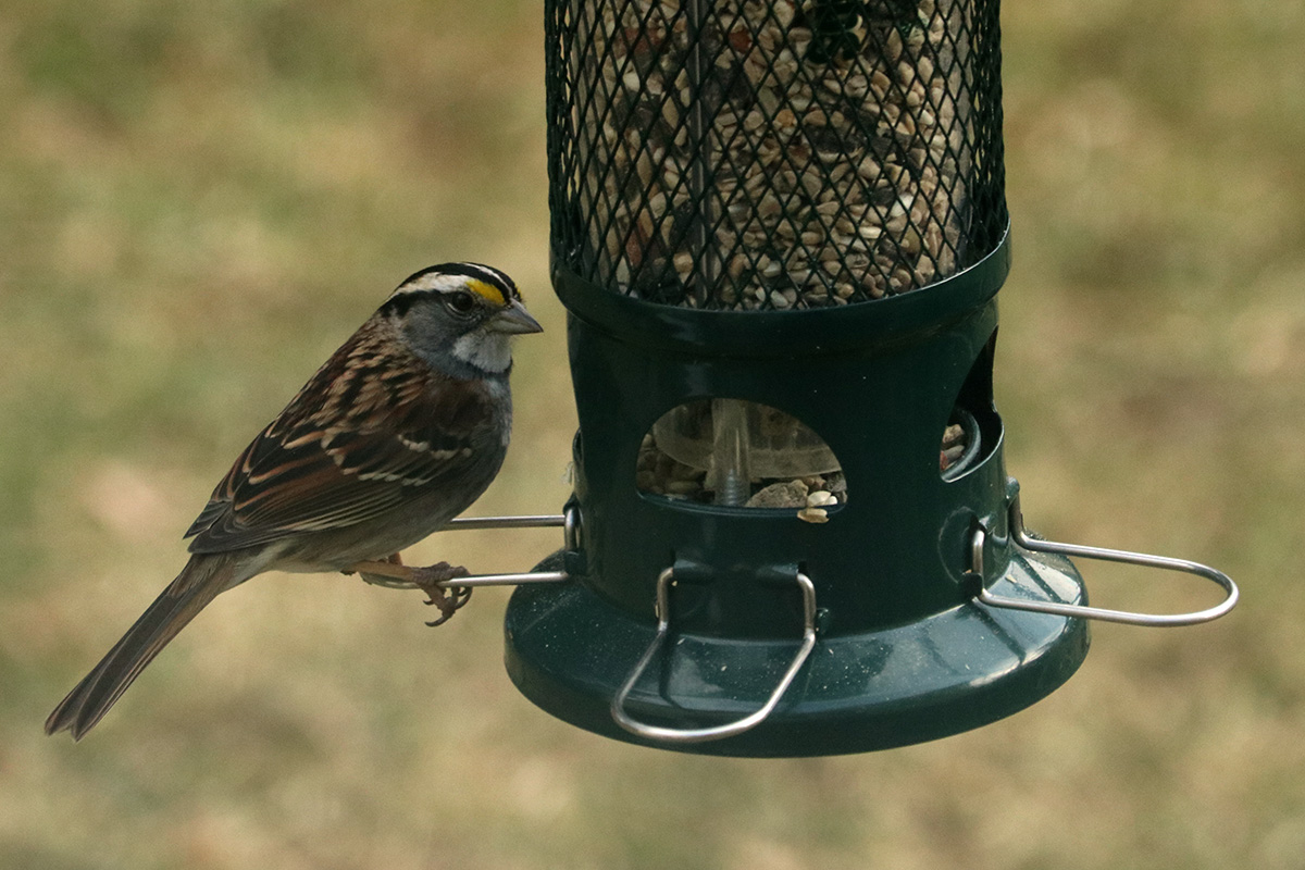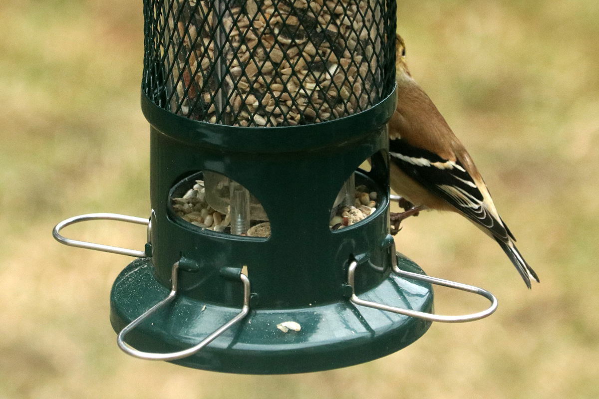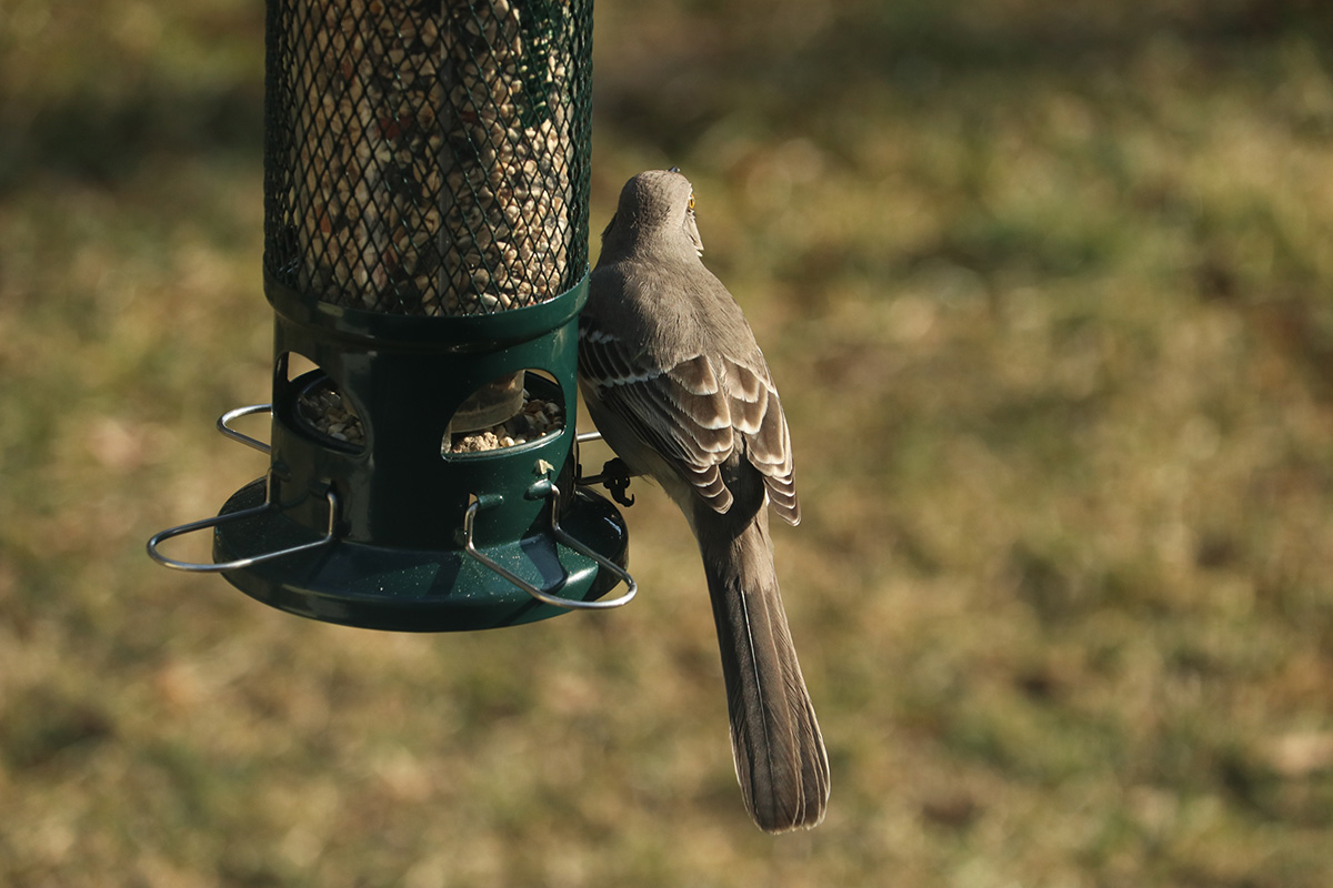 a variety of birds were visiting the backyard feeders: cardinals, song white-throated sparrows, juncos, house finches, mourning doves, chickadees. apart from the usuals, there were also a few new visitors. i saw a single male house sparrow. that made me worry, because normally they come in a large flock, but this one was by itself, or maybe it got lost and mixed in with a group of song white-throated sparrows. there was a mockingbird. i've seen them around the neighborhood, but this was the first time i saw one at the feeders. i tried the suet first, standing on top of the cage. it then perched on the squirrel buster. a mockingbird is kind of on the large side, and i was surprised its weight didn't close the feeder. it could hardly hang onto the perch, and left soon afterwards for a less demanding meal. finally, a nonbreeding male goldfinch visited the feeder. like the house sparrow, it was alone. in all the times i've had backyard birdfeeders, i don't think i ever seen a goldfinch come to feed. i thought they only ate niger seeds, which i've used before. hopefully this means come spring, we will get some goldfinches. better yet, if i do end up putting out a niger seed feeder, i'll probably be able to attract more goldfinches.
