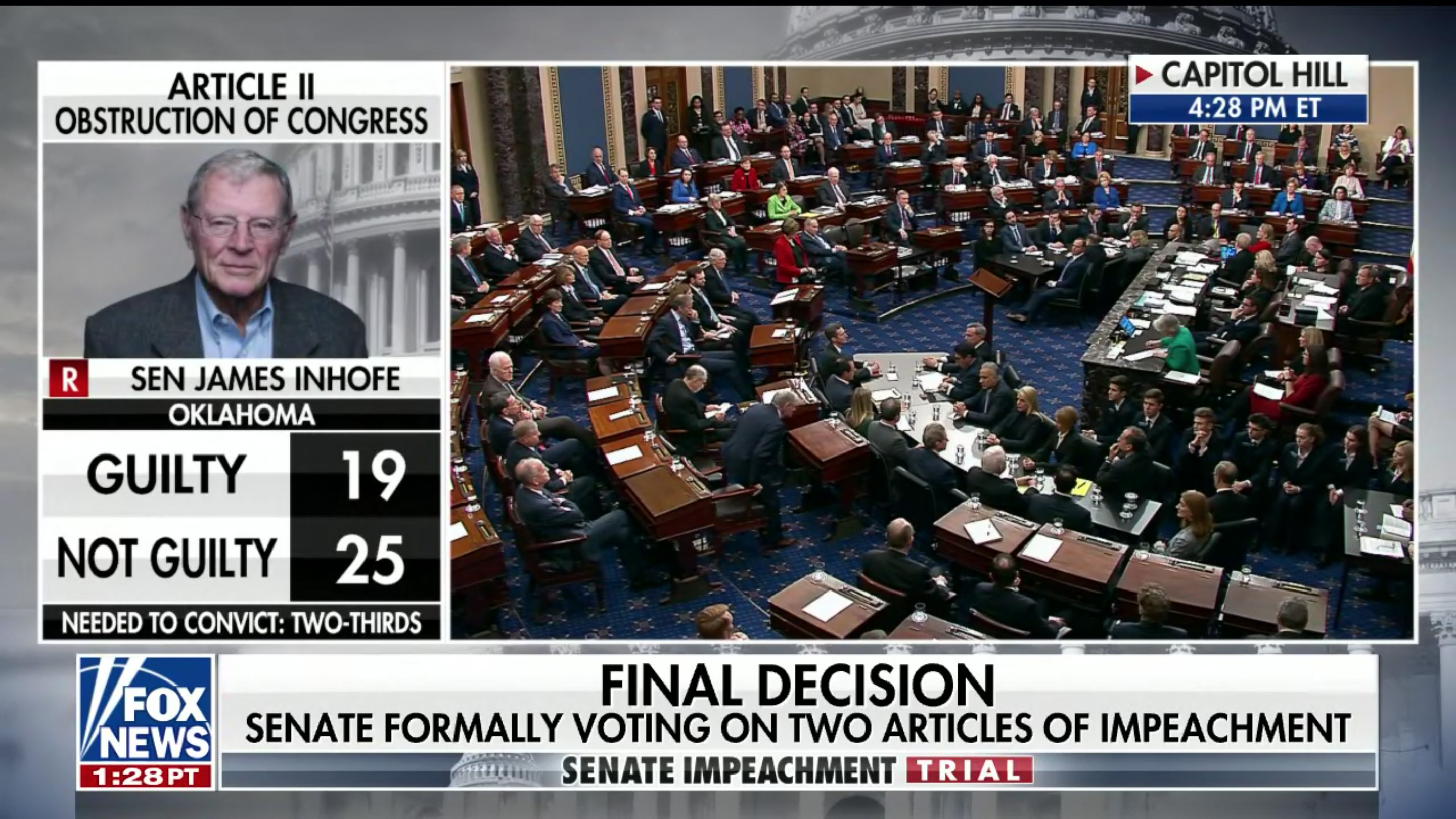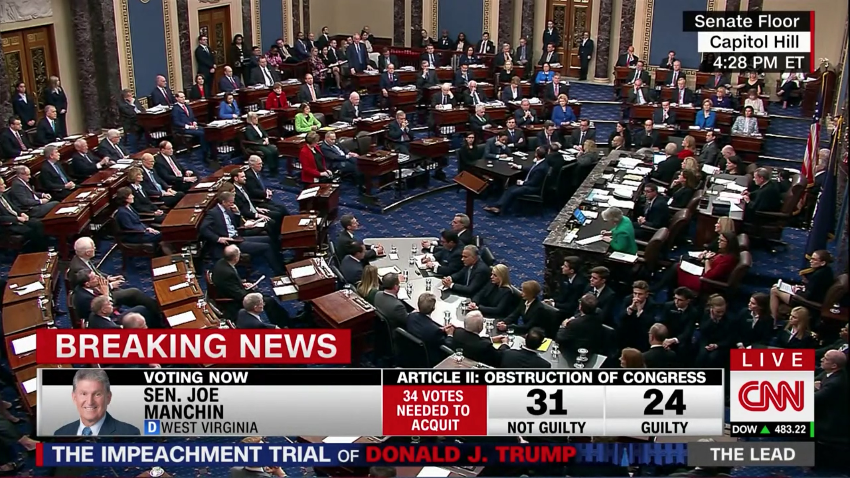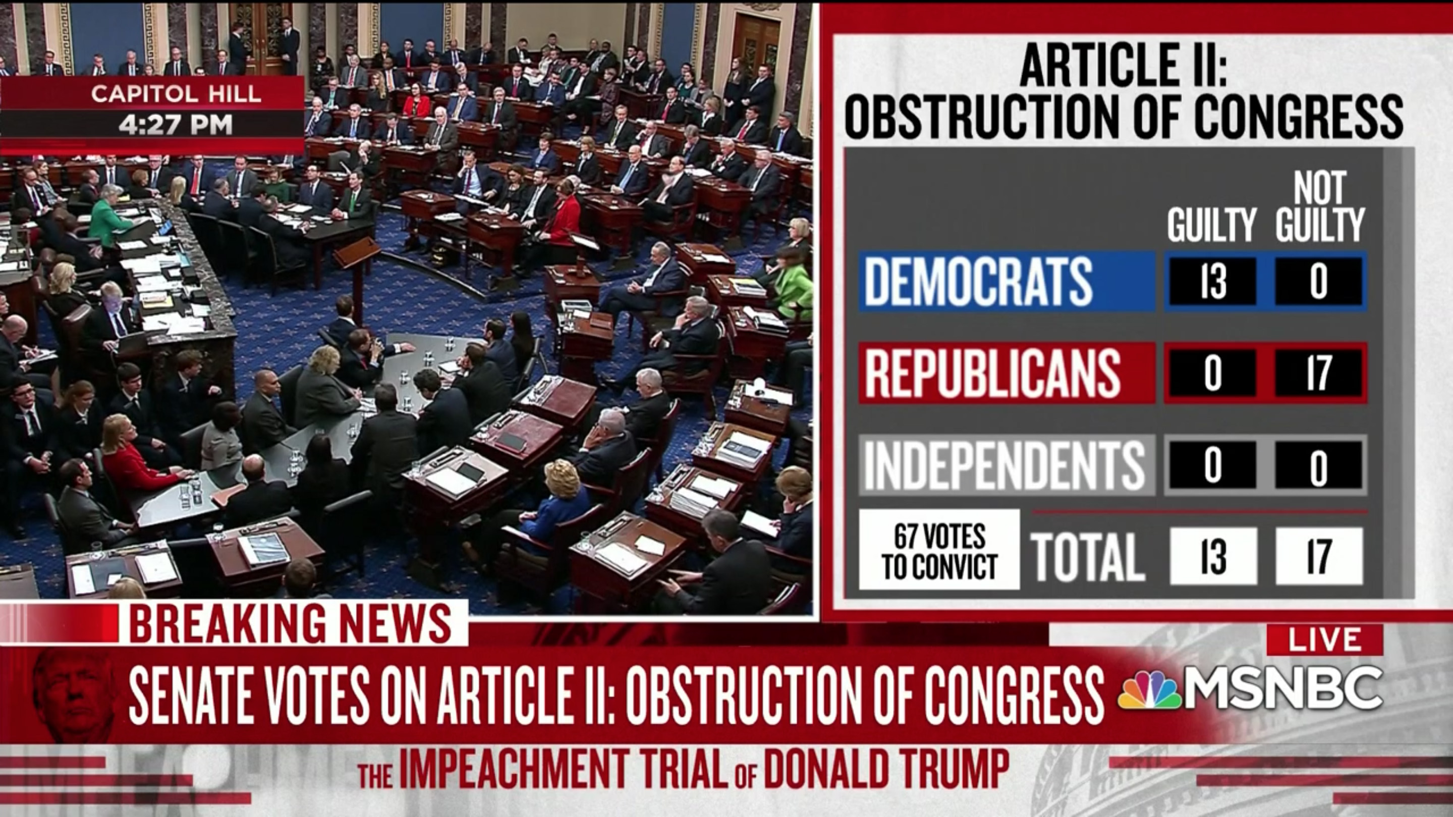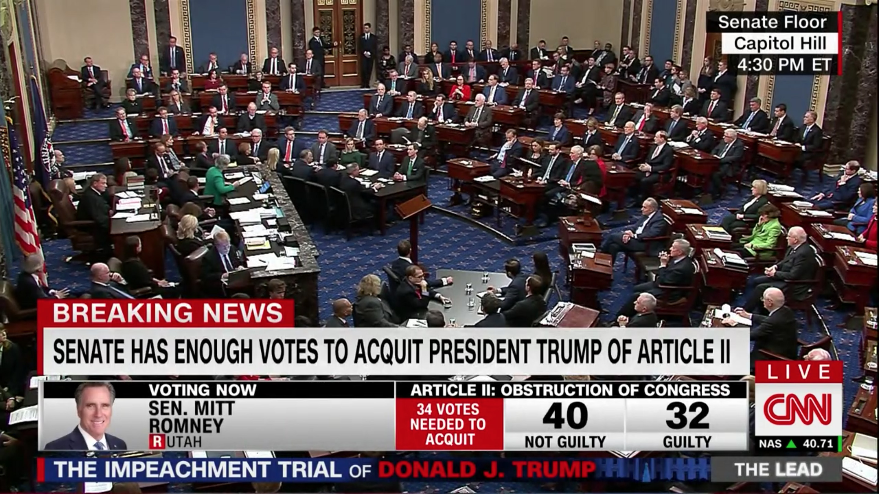 i returned home by 3:50pm, just in time to catch the articles of impeachment vote by the senate. it went down by party line (as expected), with mitt romney the sole republican to break away from the ranks and to cast a guilty vote for donald trump. what a better world it would've been if romney had been president instead of trump. i was following it on MSNBC but switched to a few other cable news networks to check out their coverage. frankly, those other networks (foxnews, CNN) had much better graphics, with photos and party affiliation of each individual senators voting; by comparison, MSNBC was kind of garbage. CNN had the best, with the graphics underneath so it wouldn't obstruct the live view of the senate chamber on this historical vote, which took up most of the screen.