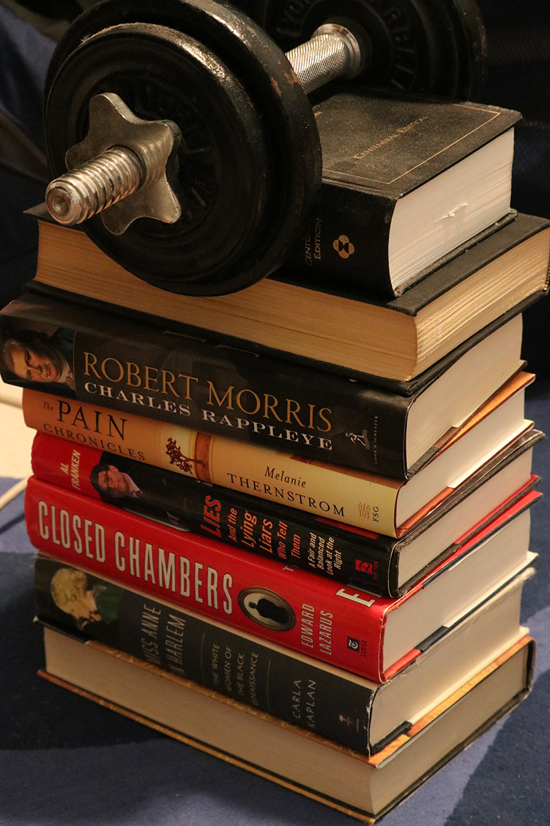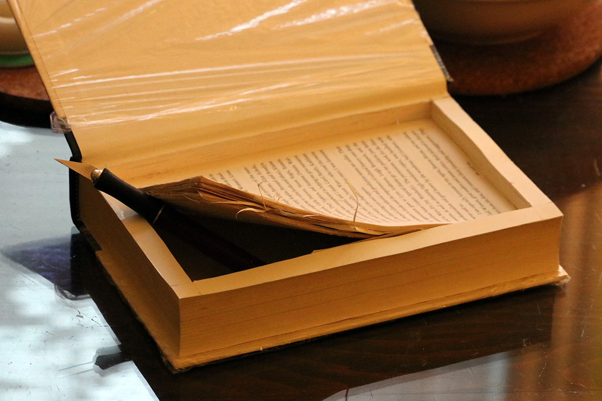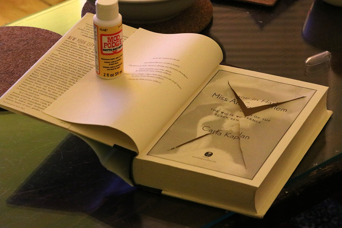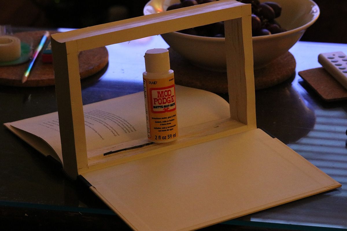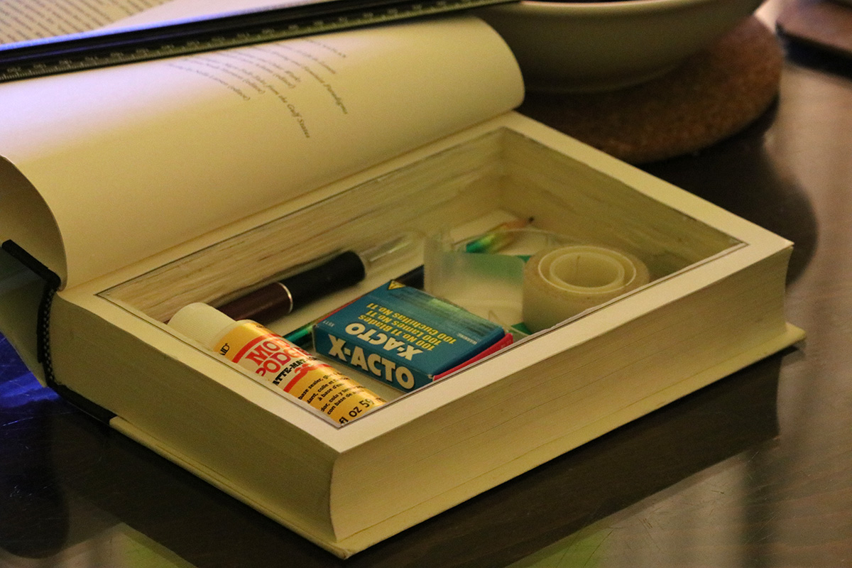 as for me, besides reporting the going-ons of my erratic roommate, i didn't do much today, didn't even leave the house. once kevin left, i continued working on my book safe, finally punching clear through. i glued together the inner pages and glued the bottom to the back cover of the book, along with the book jacket, which gives it a more natural look, an additional layer of camouflage.
