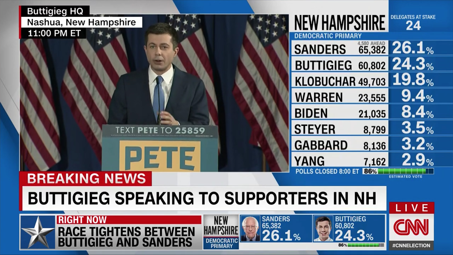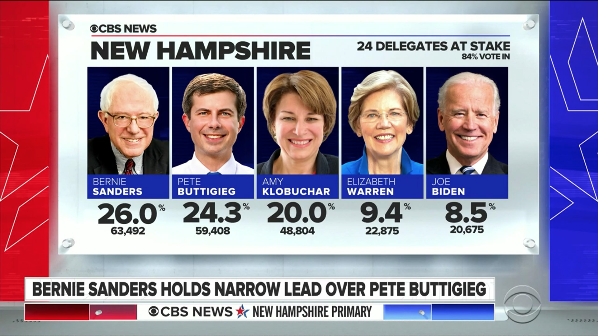 the new hampshire primary was tonight, polling stations closed at 8pm. bernie sanders won but only by a narrow margin, with pete buttigieg right behind him by less than 2 percentage points. amy klobuchar was at a near distant third. joe biden realized he was going to lose big and decided to cut his loses and get a head start in south carolina, abandoning his new hampshire supporters. out of all the candidates, i'm leaning towards buttigieg, more so after his close iowa victory, and even more after new hampshire. if sanders represents the hard liberal wing of the democratic party, buttigieg is the more moderate. if klobuchar didn't get a boost from performing well in the last debate, she wouldn't have funneled away moderate voters from buttigieg and he might've won new hampshire. even with all the votes going to other moderate candidates, buttigieg still narrowly beat sanders.