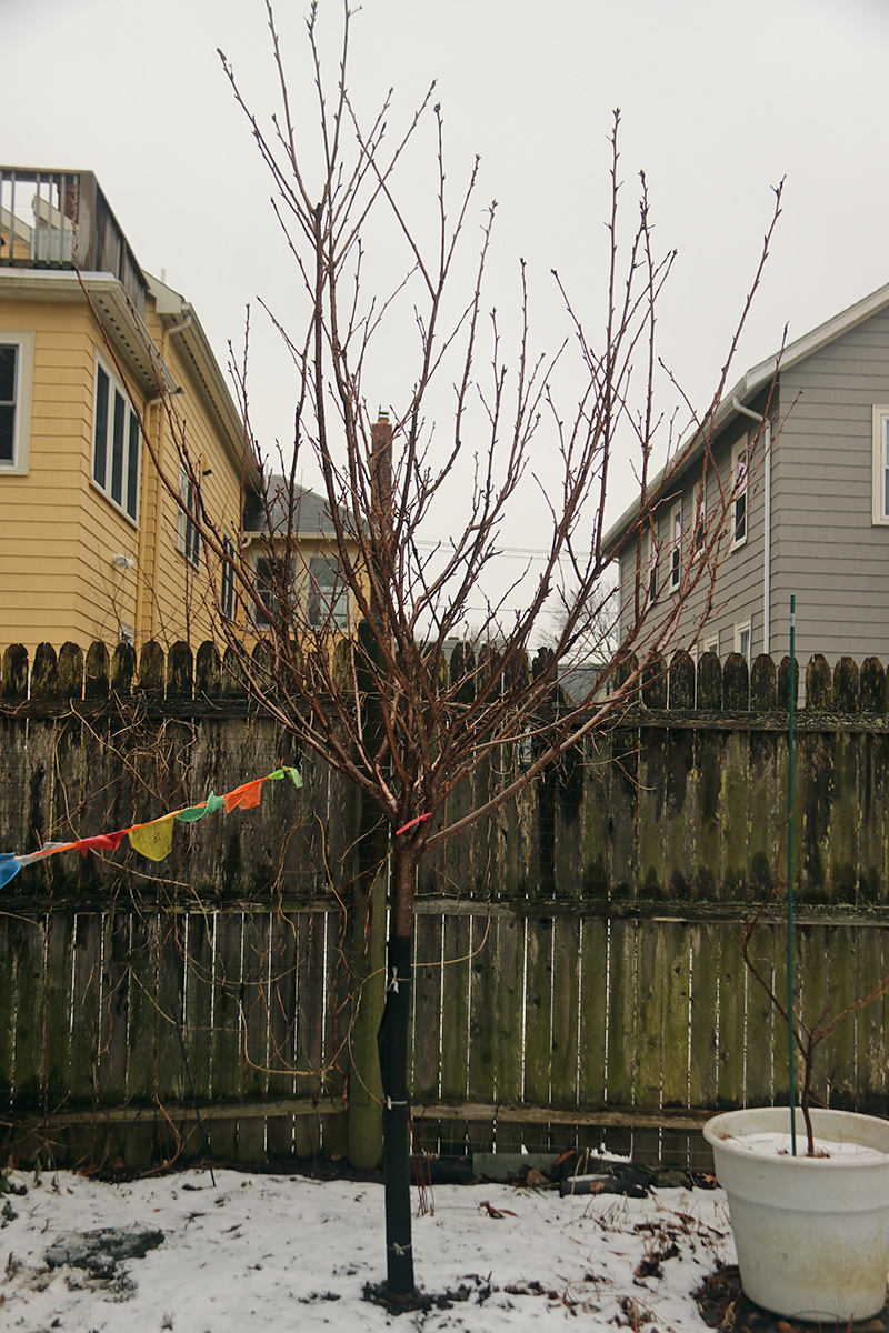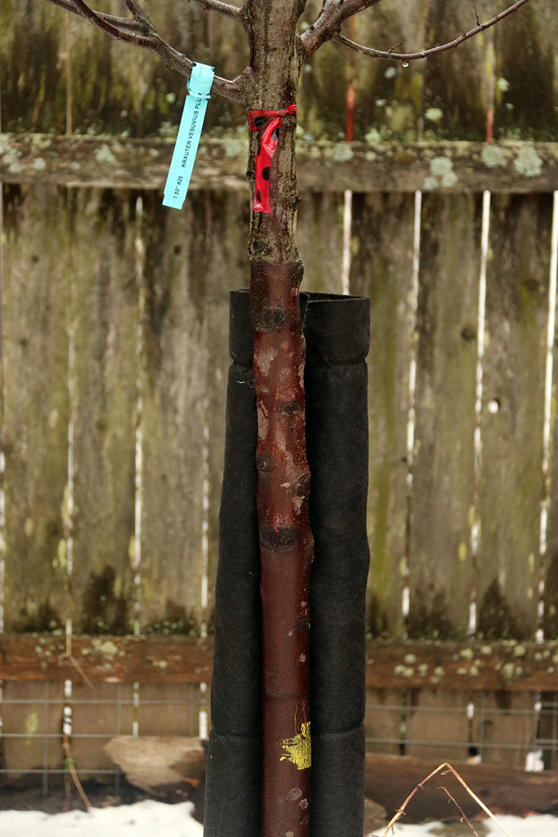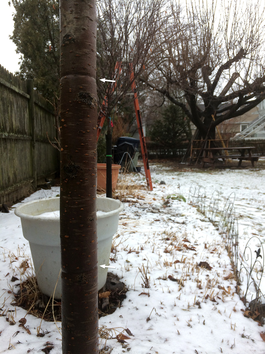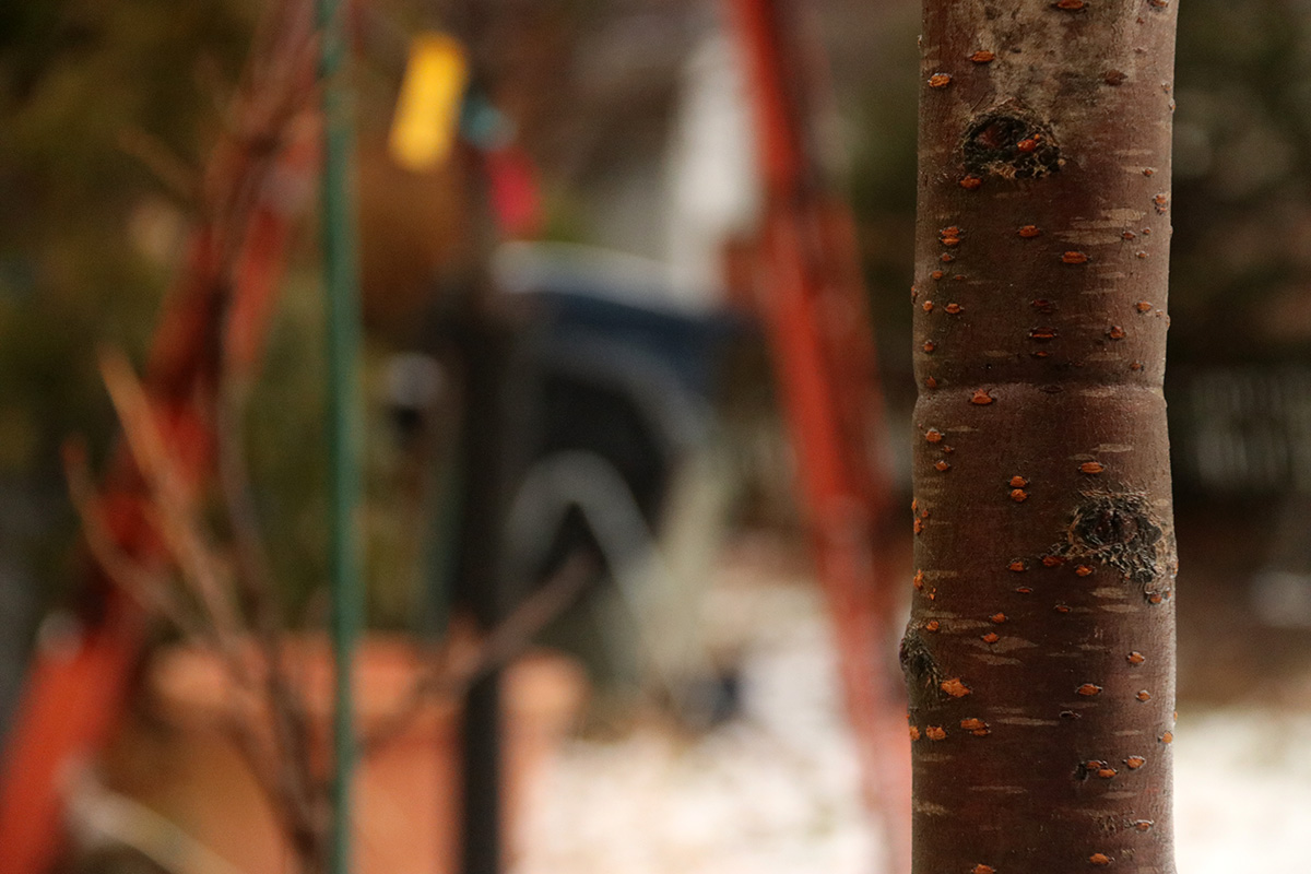 afterwards i did an inspection of the backyard, trying to see if there was anything worth photographing. i was shooting photos of the emerging flower buds on our redbud/cherry/plum trees, when i noticed the strings tying the protective trunk cloth was girdling the cherry and plum trees. i quickly ran inside to get a pair of pruning shearers to snip the strings. there was no damage on the plum, but the flowering cherry - because it's a fast grower - had some girdling marks on the trunk. hopefully when the tree grows it'll fill those out. glad i was able to catch the girdling in time, otherwise the trees would've been strangled to death.