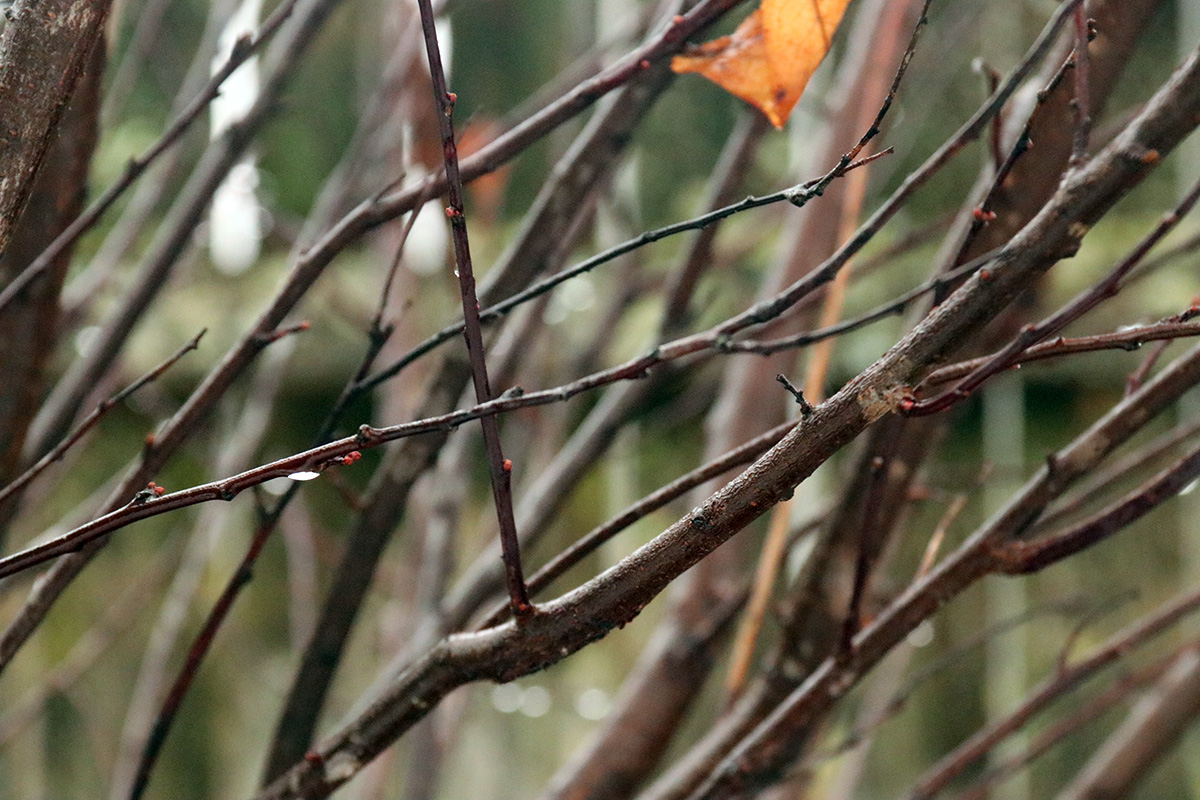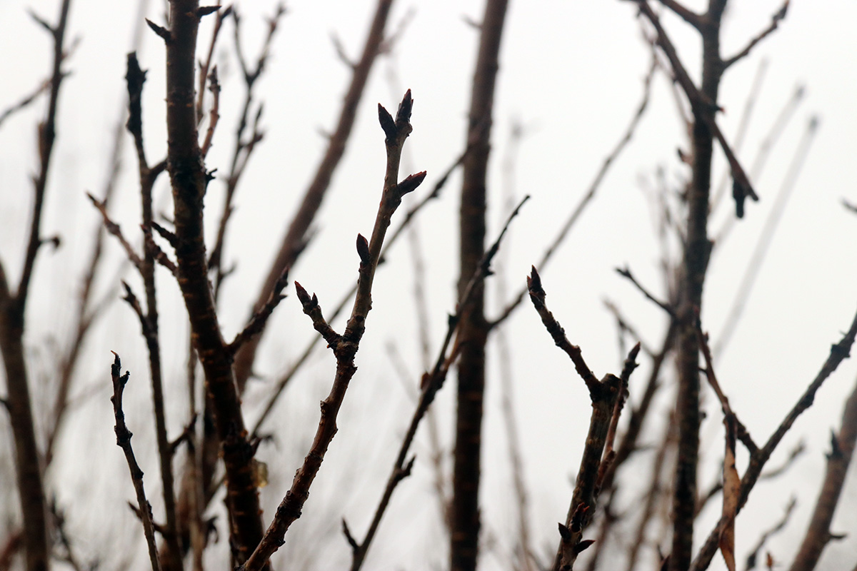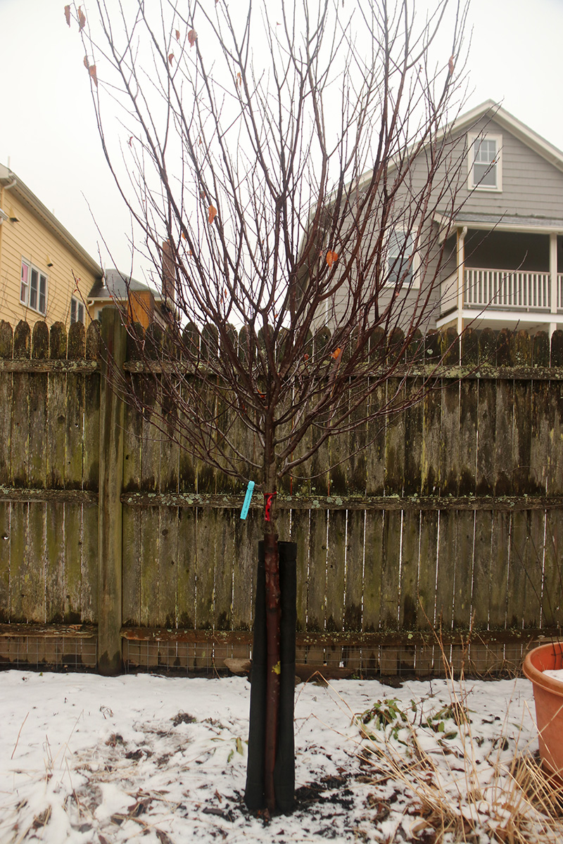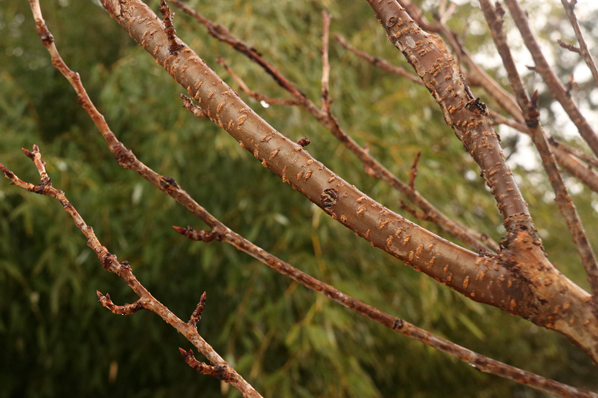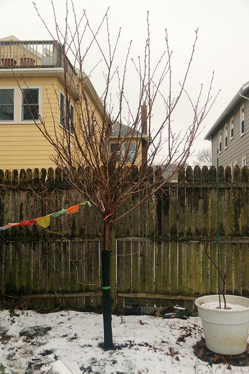 afterwards i did an inspection of the backyard, trying to see if there was anything worth photographing. i was shooting photos of the emerging flower buds on our redbud/cherry/plum trees, when i noticed the strings tying the protective trunk cloth was girdling the cherry and plum trees. i quickly ran inside to get a pair of pruning shearers to snip the strings. there was no damage on the plum, but the flowering cherry - because it's a fast grower - had some girdling marks on the trunk. hopefully when the tree grows it'll fill those out. glad i was able to catch the girdling in time, otherwise the trees would've been strangled to death.