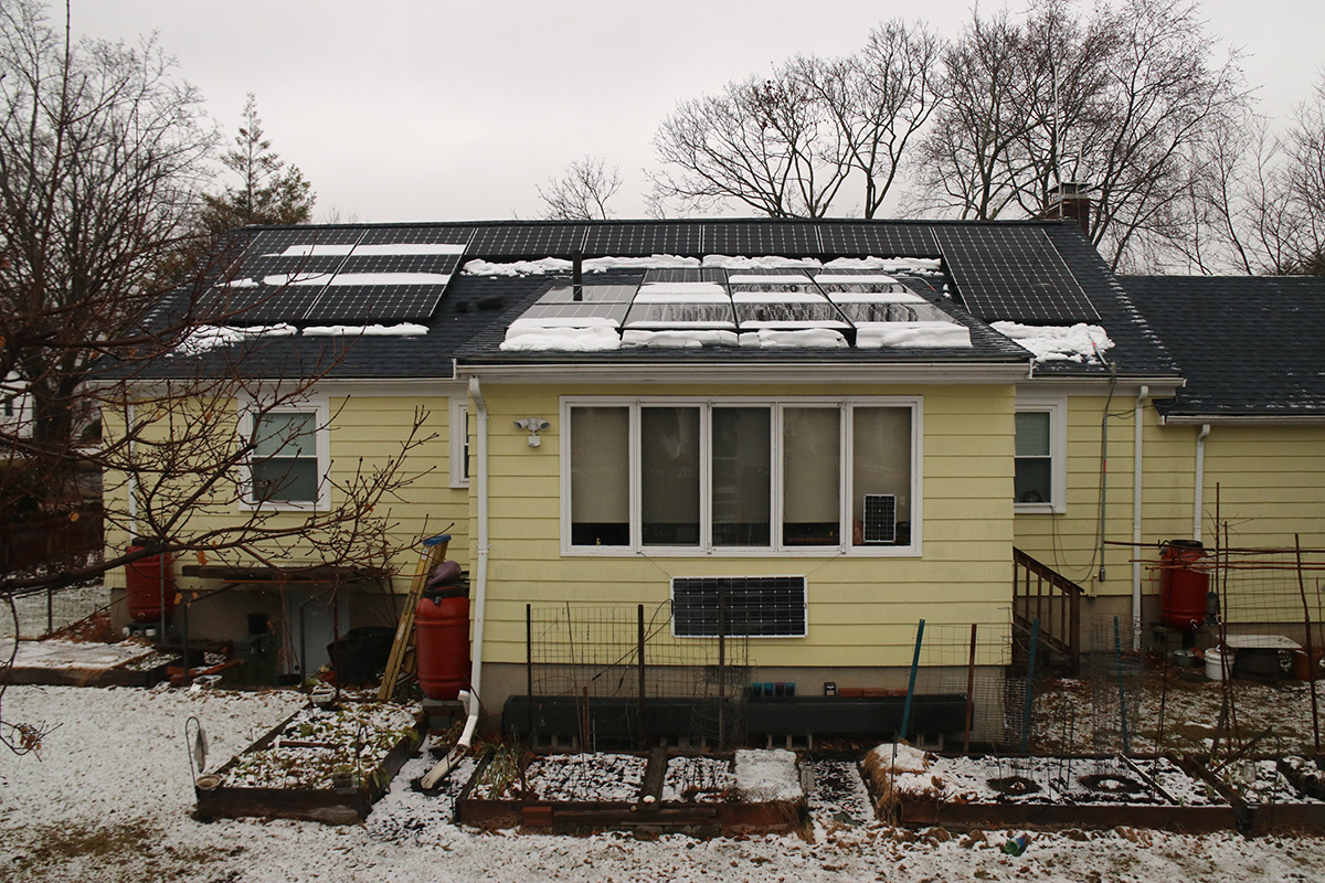 my father sent me a photo of the solar panel conditions, after some early morning pre-dawn snow followed by rain that would last until the late afternoon. more than half of the panels were exposed, but there was still some snow coverage. i decided later in the afternoon - after the rain stops - to ride down to belmont and quickly clean off the snow.
