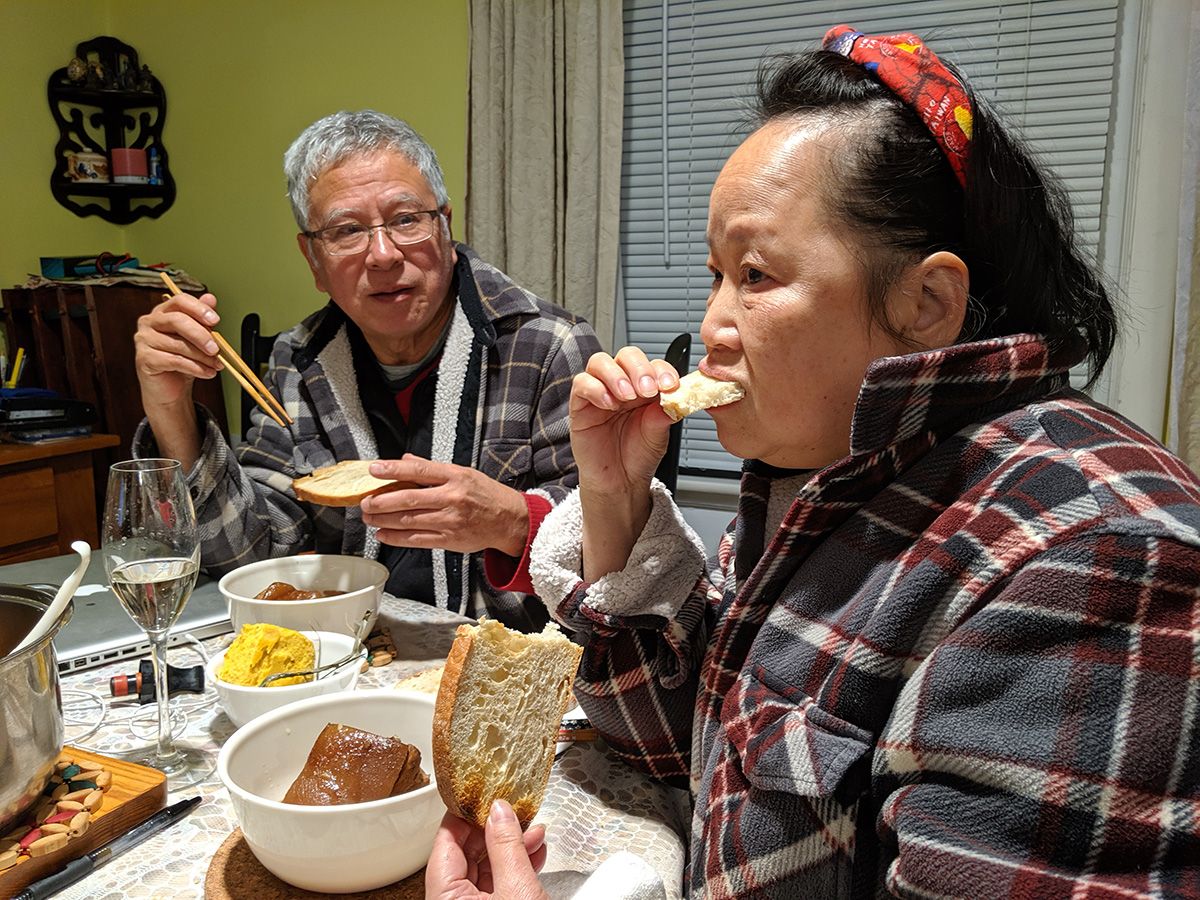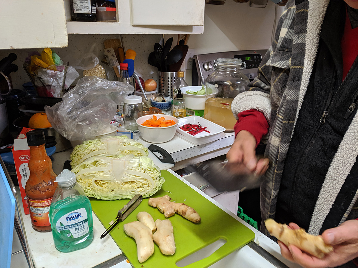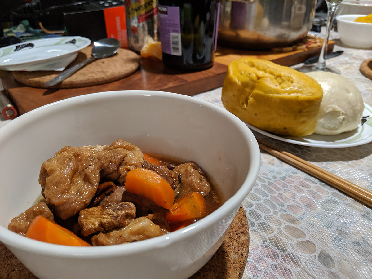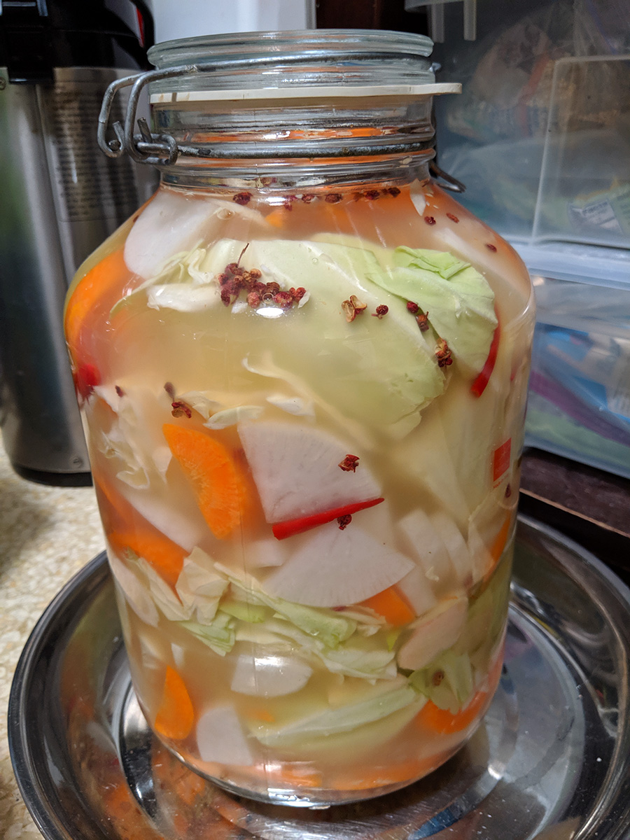 we had beef and tofu stew for dinner, served with mantou buns and bread. afterwards my father helped me fill up the sichuan paocai jar. traditionally, once the fermenting brine has matured, it can be reused over and over again, just adding the necessary ingredients to keep it going. my mother had already dredged out all the pickled vegetables last weekend, so the jar was waiting to be refilled. i was afraid there wouldn't be enough brine so i whipped up a batch of extra using 3 cups of water with 1 ounce (weighed) of salt. my father helped me chop up the vegetables - chinese cabbage, carrots, daikon radish, tender ginger - while i sacrificed my right hand and used it to stuff the vegetables into the jar. we did it in layers, each layer then getting a sprinkle of sichuan peppercorn and thai hot chili peppers. we ended up not really needing the extra brine i created, but still used up about a cup to top off the jar so all the vegetables would be submerged. we then left placed it on a tray (to catch any leaking fluids) and left it to ferment. given how ripe the existing brine solution was (the jar opened up with a loud pop as waste carbon dioxide was released), it shouldn't take long for the vegetables to be ready to eat. but i like my paocai extra sour, give it a few weeks at least if not longer.
