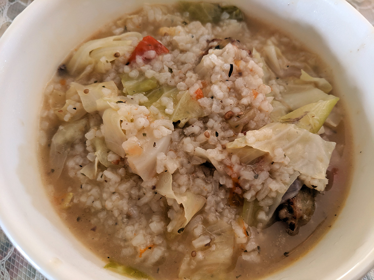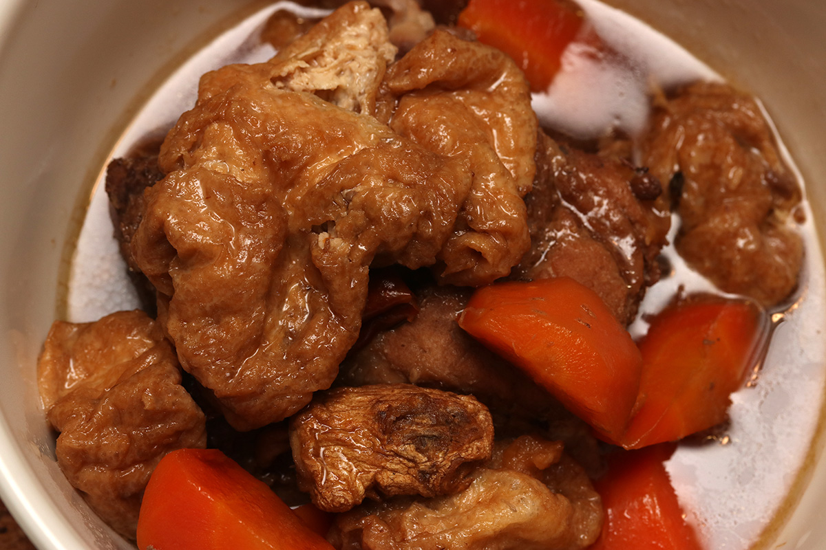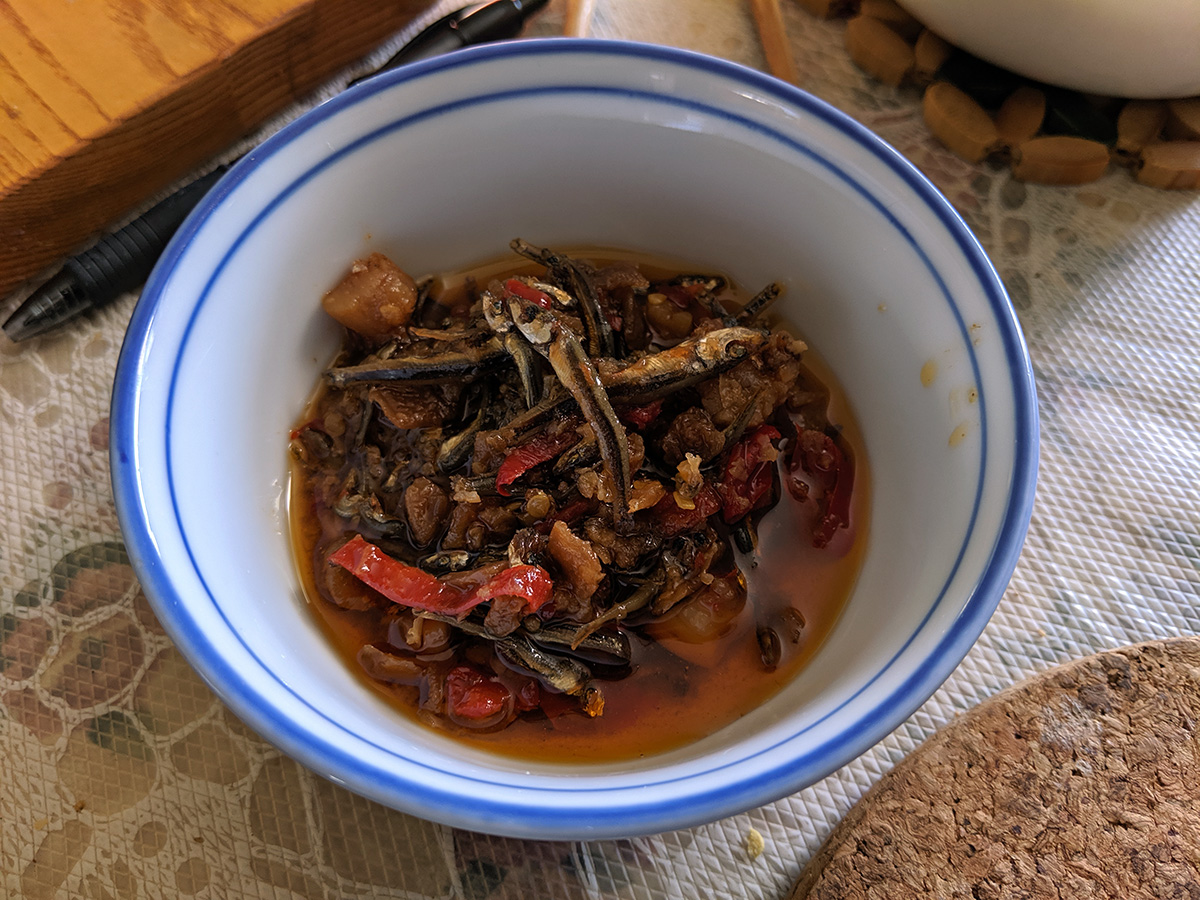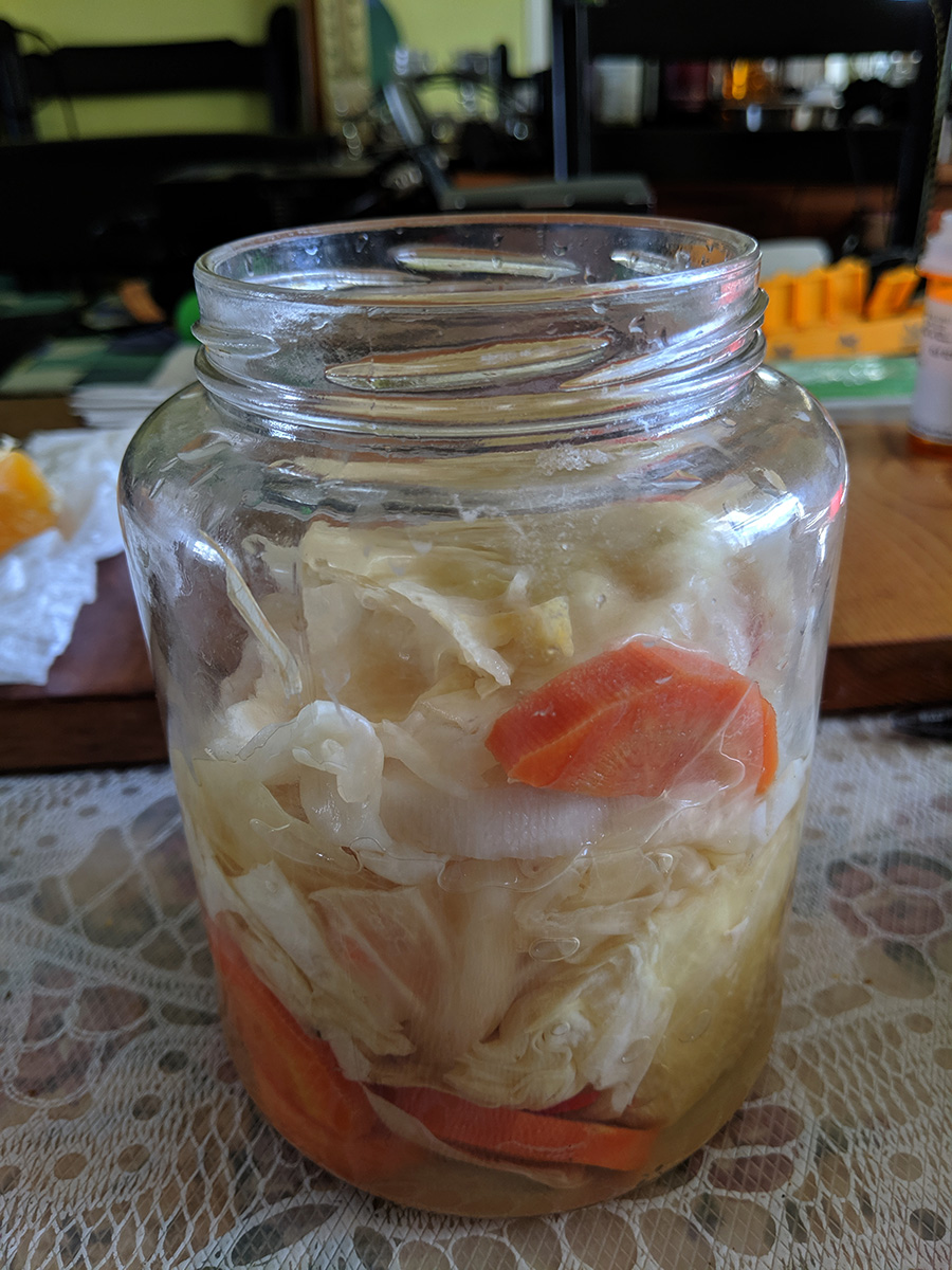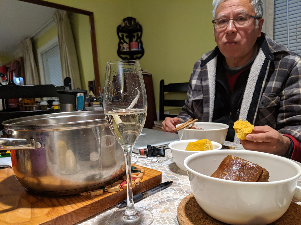 we had beef and tofu stew for dinner, served with mantou buns and bread. afterwards my father helped me fill up the sichuan paocai jar. traditionally, once the fermenting brine has matured, it can be reused over and over again, just adding the necessary ingredients to keep it going. my mother had already dredged out all the pickled vegetables last weekend, so the jar was waiting to be refilled. i was afraid there wouldn't be enough brine so i whipped up a batch of extra using 3 cups of water with 1 ounce (weighed) of salt. my father helped me chop up the vegetables - chinese cabbage, carrots, daikon radish, tender ginger - while i sacrificed my right hand and used it to stuff the vegetables into the jar. we did it in layers, each layer then getting a sprinkle of sichuan peppercorn and thai hot chili peppers. we ended up not really needing the extra brine i created, but still used up about a cup to top off the jar so all the vegetables would be submerged. we then left placed it on a tray (to catch any leaking fluids) and left it to ferment. given how ripe the existing brine solution was (the jar opened up with a loud pop as waste carbon dioxide was released), it shouldn't take long for the vegetables to be ready to eat. but i like my paocai extra sour, give it a few weeks at least if not longer.