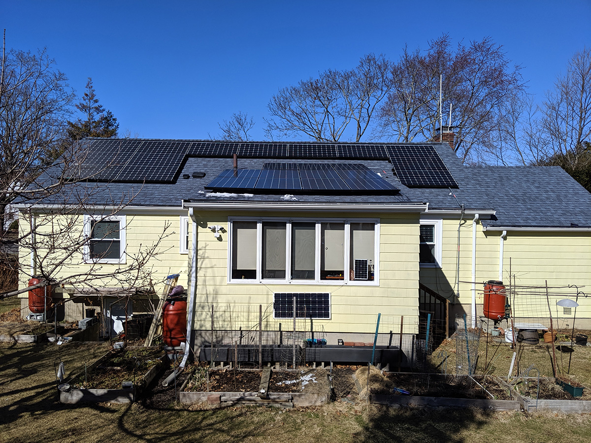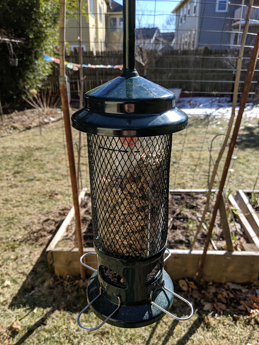 it's been so cold there's still a little bit of snow on the roof, though nothing on the panels (i made sure of that on thursday). there was just a small piece of suet in the feeder so i dumped it out for the squirrels and put in a new one. with the suet feeder situated in such a way that it's pretty much squirrel-proof, the only critters that feed on the suet are birds (primarily woodpeckers) and they're light eater so i single block can last a month or two.