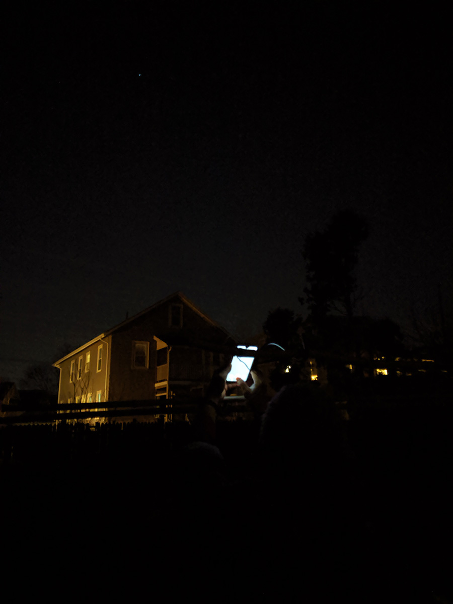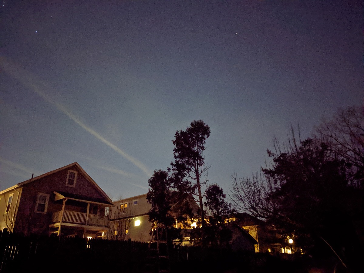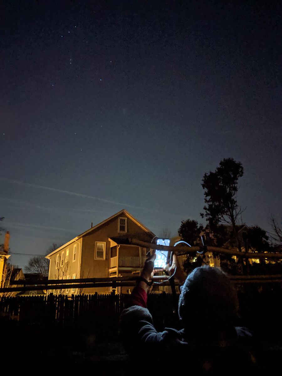i went outside to the backyard to test the night sight on my pixel camera. it made the dark sky look like it was dusk and showed the stars. i wanted to see if i could try the astrophotography setting, but there's no way to choose that option, it just triggers automatically when the app senses you're outside shooting in the dark. i tried the google camera app on my father's moto G7 and it was able to take advantage of night sight as well. my father came out to try out the camera app himself, hoping to get a photo of the orion constellation.