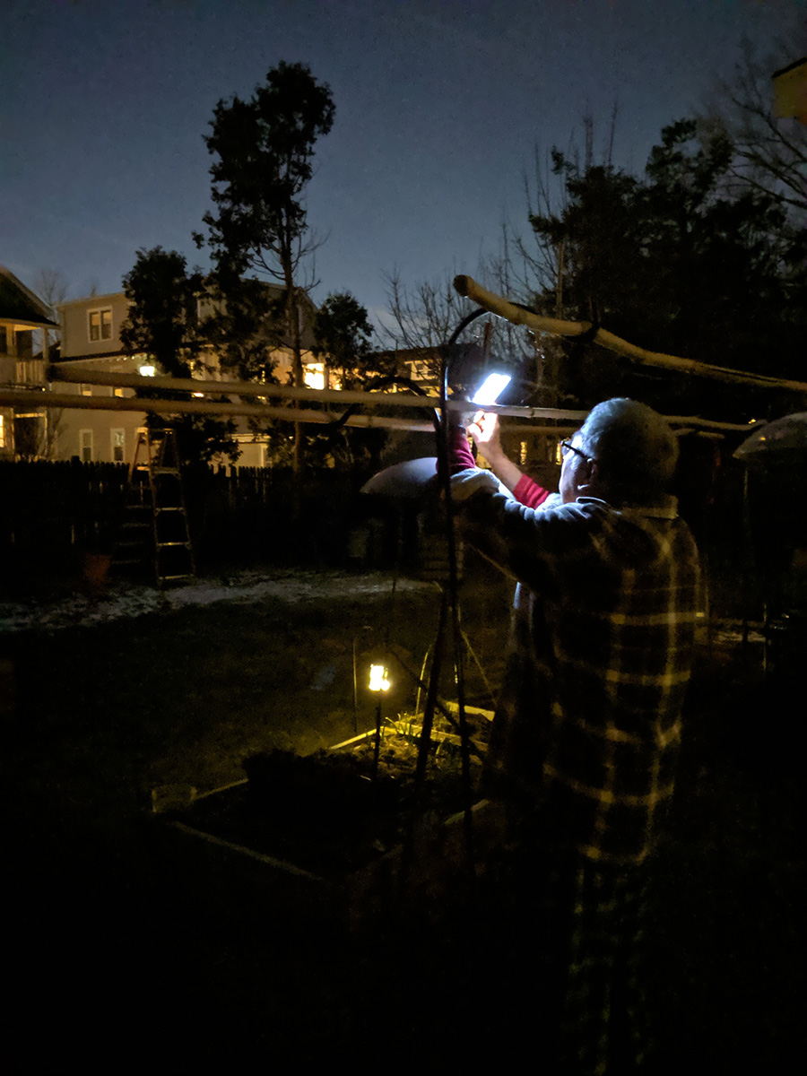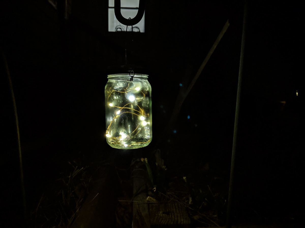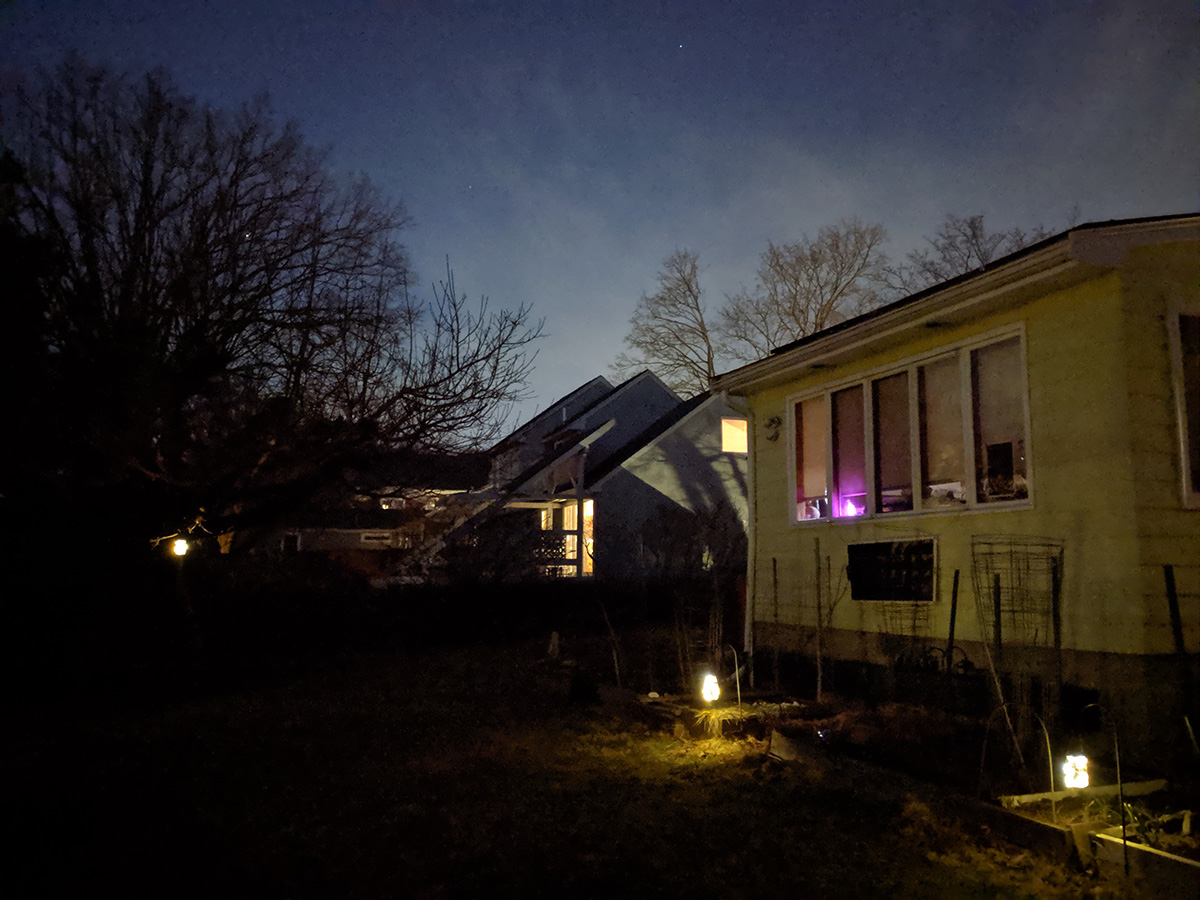 i went outside to the backyard to test the night sight on my pixel camera. it made the dark sky look like it was dusk and showed the stars. i wanted to see if i could try the astrophotography setting, but there's no way to choose that option, it just triggers automatically when the app senses you're outside shooting in the dark. i tried the google camera app on my father's moto G7 and it was able to take advantage of night sight as well. my father came out to try out the camera app himself, hoping to get a photo of the orion constellation.