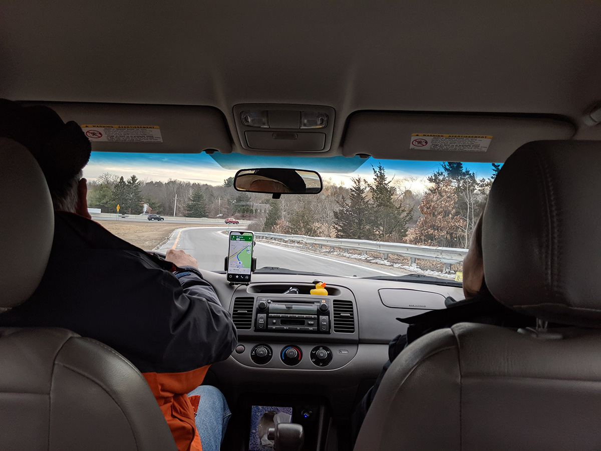 with driving and holding a phone becoming illegal in massachusetts next week (not just texting), i bought a phone holder which arrived yesterday. my father installed it in the car attached to the windshield and was using the android auto app as an onboard gps. we also tested its ability to both receive calls and text. text was particularly special because it seemed to be able to read the text back to you. my father also made a phone call to me using voice command, but it wasn't able to recognize my mother's number. later on in bedford we saw a police office chase down a vehicle and pull it over. not sure exactly the reason (the car wasn't speeding and didn't seem to violate any traffic laws), but maybe it was for using the phone while driving.