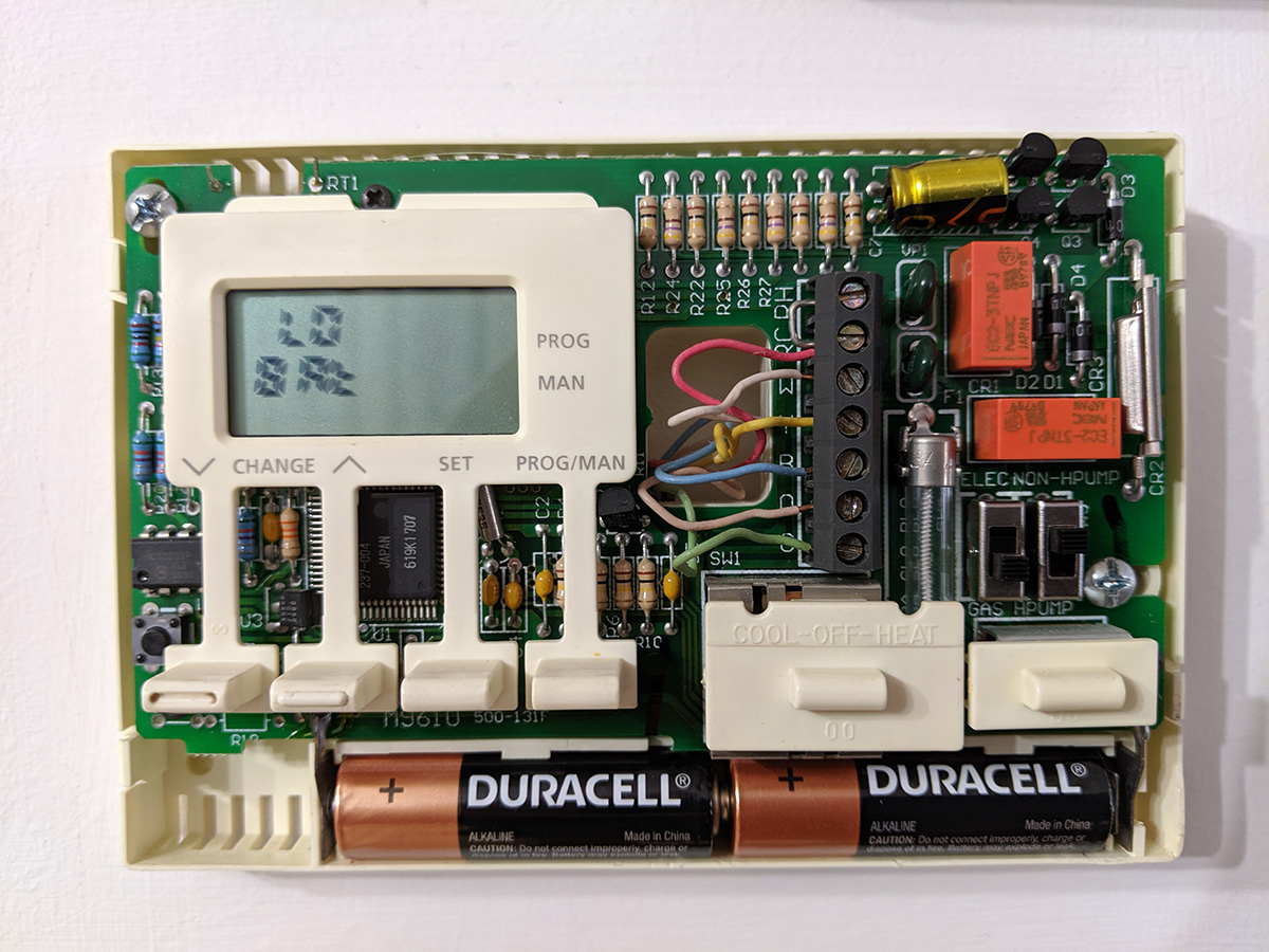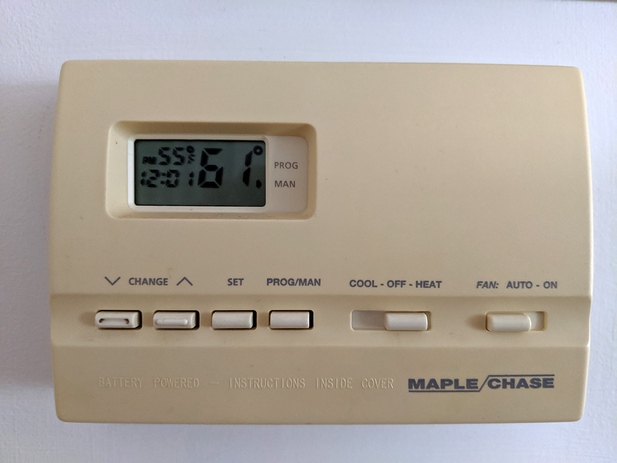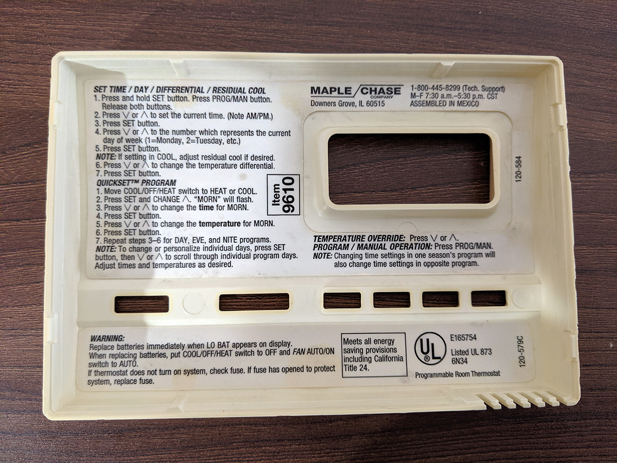back at the house, my mother sat in the car while my father and i went back inside the house. we figured all we had to do was replace the batteries, but our worst fear was realized when nothing happened, it still only showed the low battery warning. i popped out the fuse, thinking it might be broken, but the fuse was fine. i finally went online to download the instruction manual. i was looking for info on a tiny button i saw inside the thermostat that looked like a reset button but i just wanted to make sure. once i got confirmation, i hit the button, the LCD flashed, and the normal display started showing again. we set the thermostat to manual and put the house at 55°F. i also wanted to turn off the gas fireplaces after i realized they were still on (when we touched the fireplaces last time, they were slightly warm) but my father said to leave them on, so there'd still be a tiny amount of heat in case the thermostat malfunctioned again.