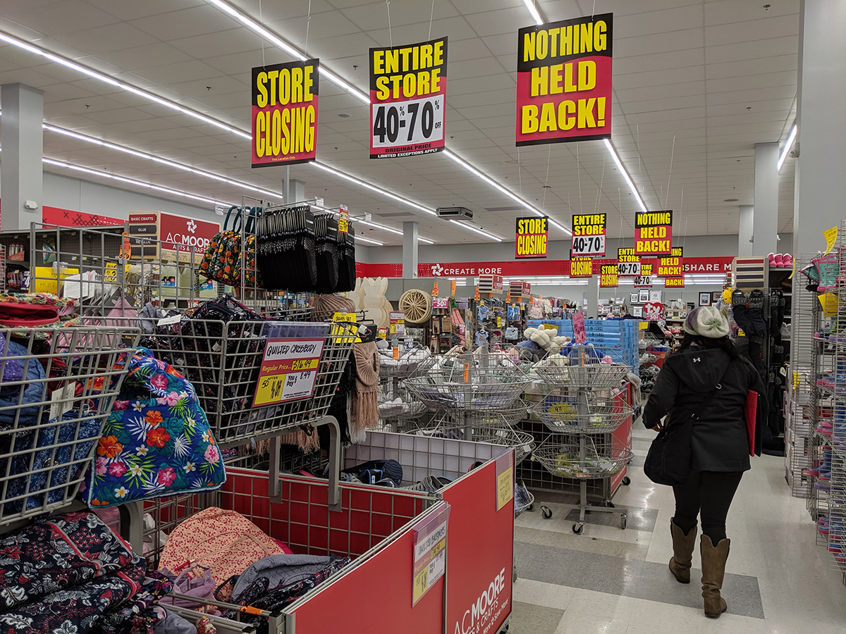 my sister called asking if i wanted to go to the medford aldi's around noontime. she's asked a few times in the past, i've said no every single time, but she's persistent, so i finally agreed to go. turns out she still doesn't quite know how to get there, and needed me to come along to navigate. next to aldi's the ac moore, in the final throes of a chain close liquidation sale. we stepped inside to check it out. i think this store at the very least will become a michael's, as there was a michael's representative handing out coupons as we entered. still, it sucks that all crafts stores will be michael's now, no variety, no competition. even with a sale, there was nothing i needed there.