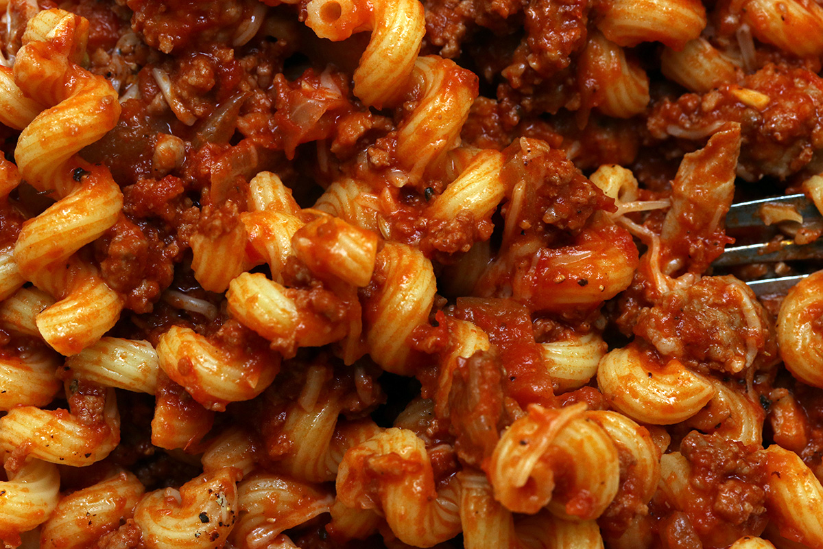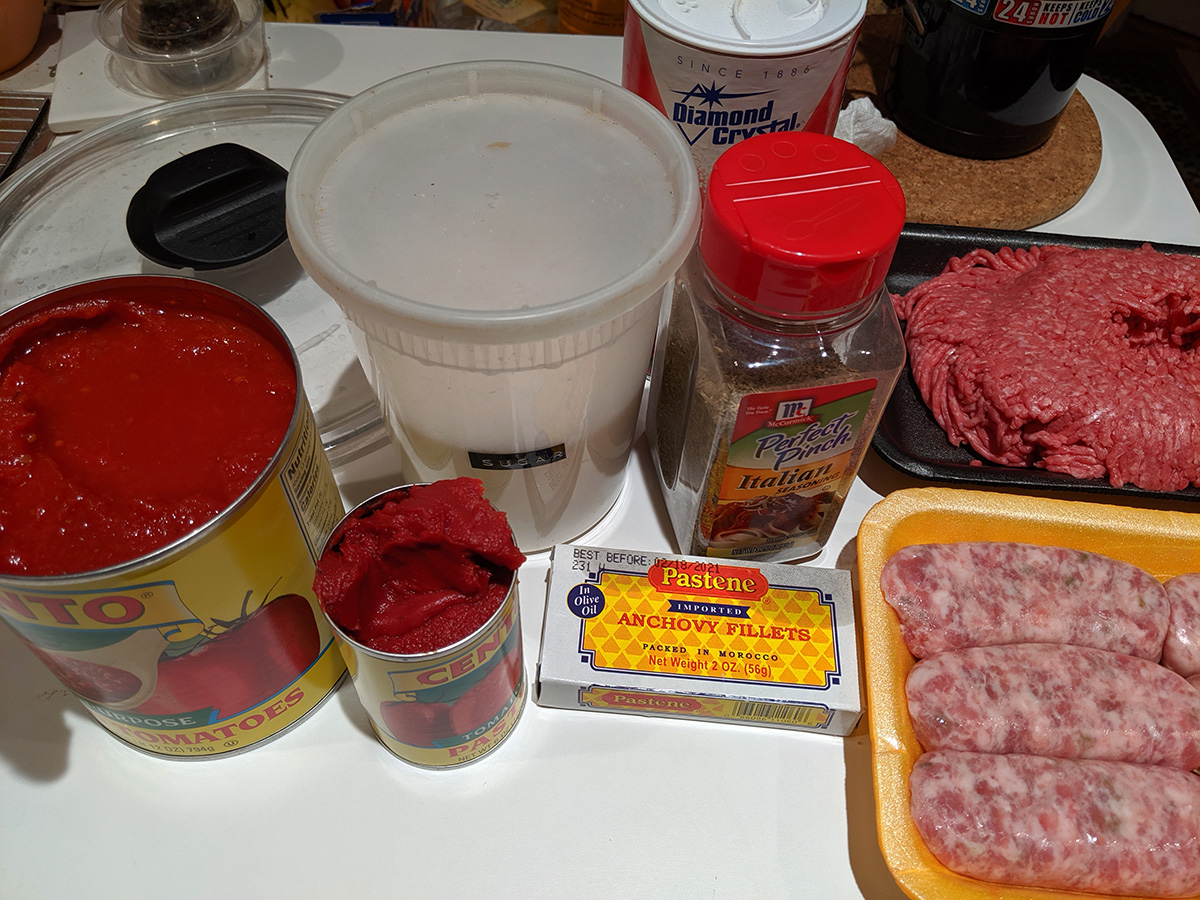 i made my meat pasta sauce, a pound of ground beef mixed with some raw italian sausages. i also added some sardines just because i had them on hand, but turned out to be a mistake, as it left the sauce with a faint fishy taste; with two different kinds of meat, it already had plenty of umami, didn't need to add more. i had the sauce served over 2 cups of cellentani pasta.