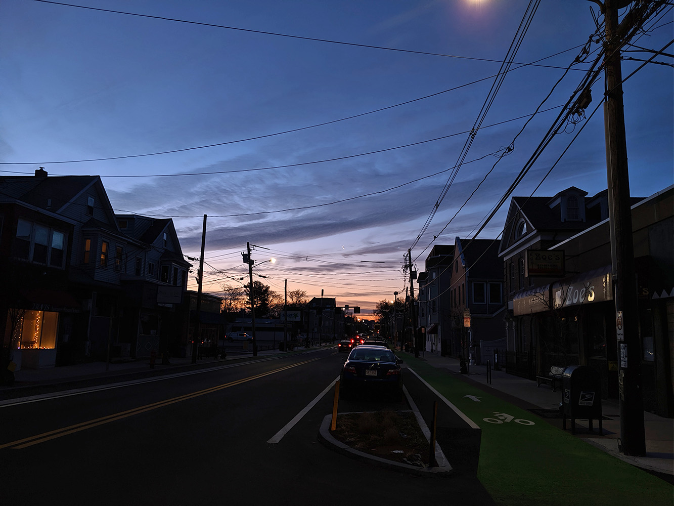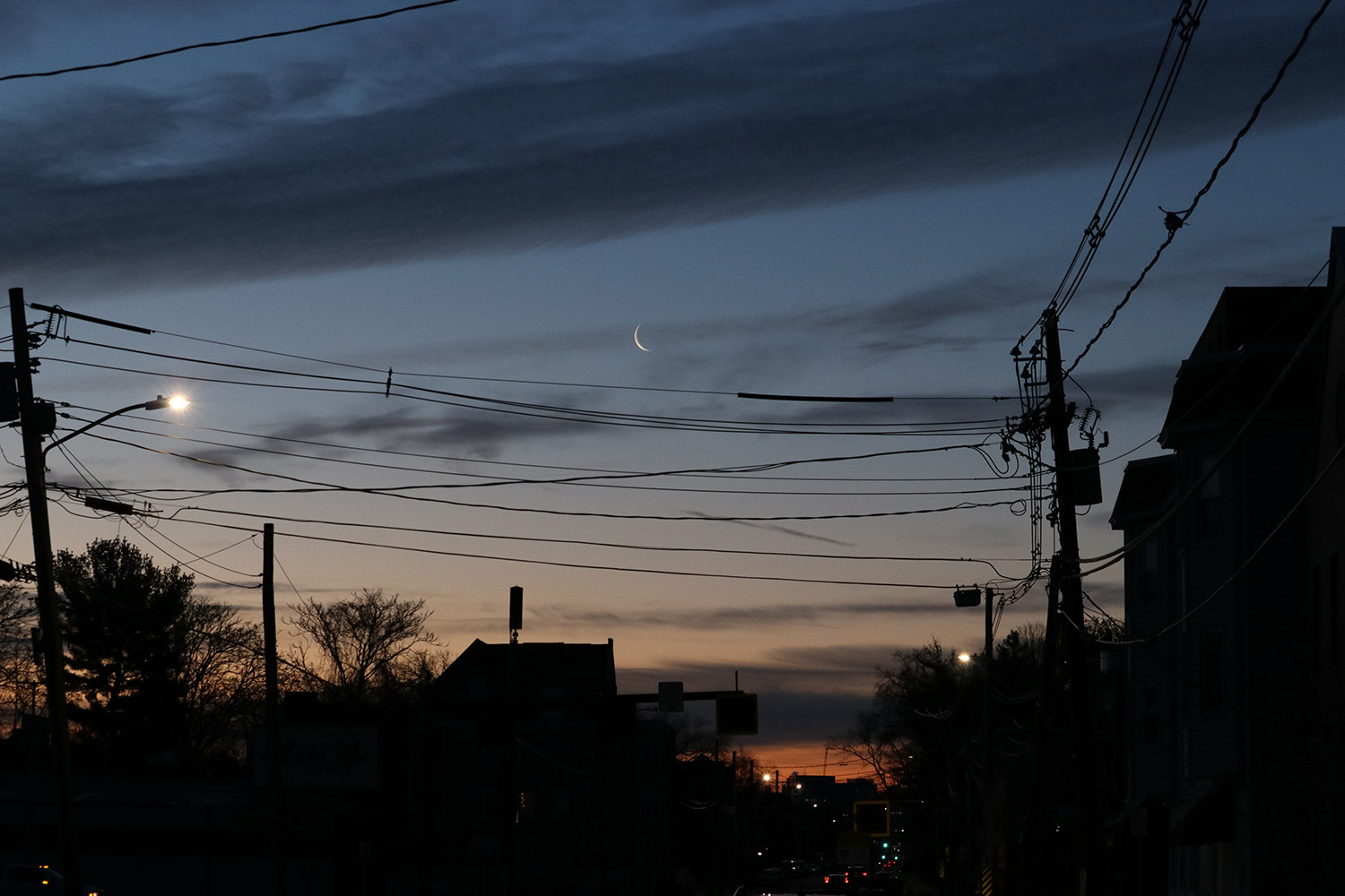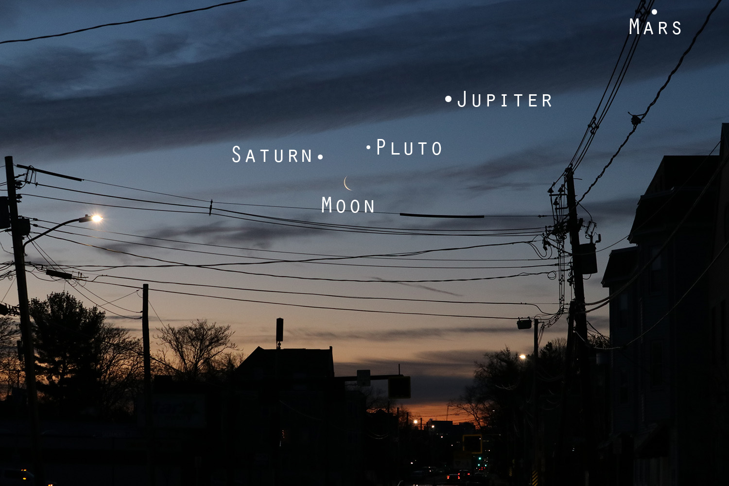 i woke up at 6am to witness the planetary conjunction of the moon, saturn, pluto, jupiter, and mars. i almost didn't wake up, just too early and too cold, but the astronomy buff in me didn't want to miss this rare event. besides, i simply had to get dressed and step outside onto the main street, the easiest thing i could do for the sake of astronomy. it was already dawn but not yet sunrise when i ventured out onto beacon street so i could look in the southwestern direction. up in the air was the thin crescent of the waning moon. it was dim, but yet bright enough that i couldn't see any of the planets. had i woken like i should've been, i probably would've seen it. good thing this conjunction will happen again in another month. that early in the morning, i was also surprised to see the amount of car and bike traffic, the hidden world of the early morning.