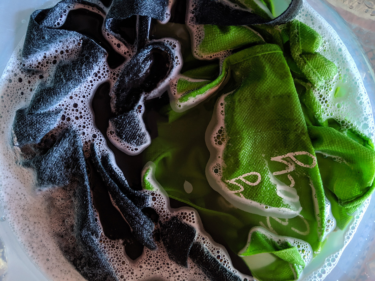 when i got back home i decided to wash my grocery bags. one of them - the light green star market bag - is heavily stained with what looks to be meat juices. it just looks kind of gross. i soaked them in a warm tub of oxiclean, that stuff is laundry magic. after rinsing them out, the bags looked brand new, although some of the branding logo were starting to chip off. the star market bag was perfectly clean, not a trace of stain.