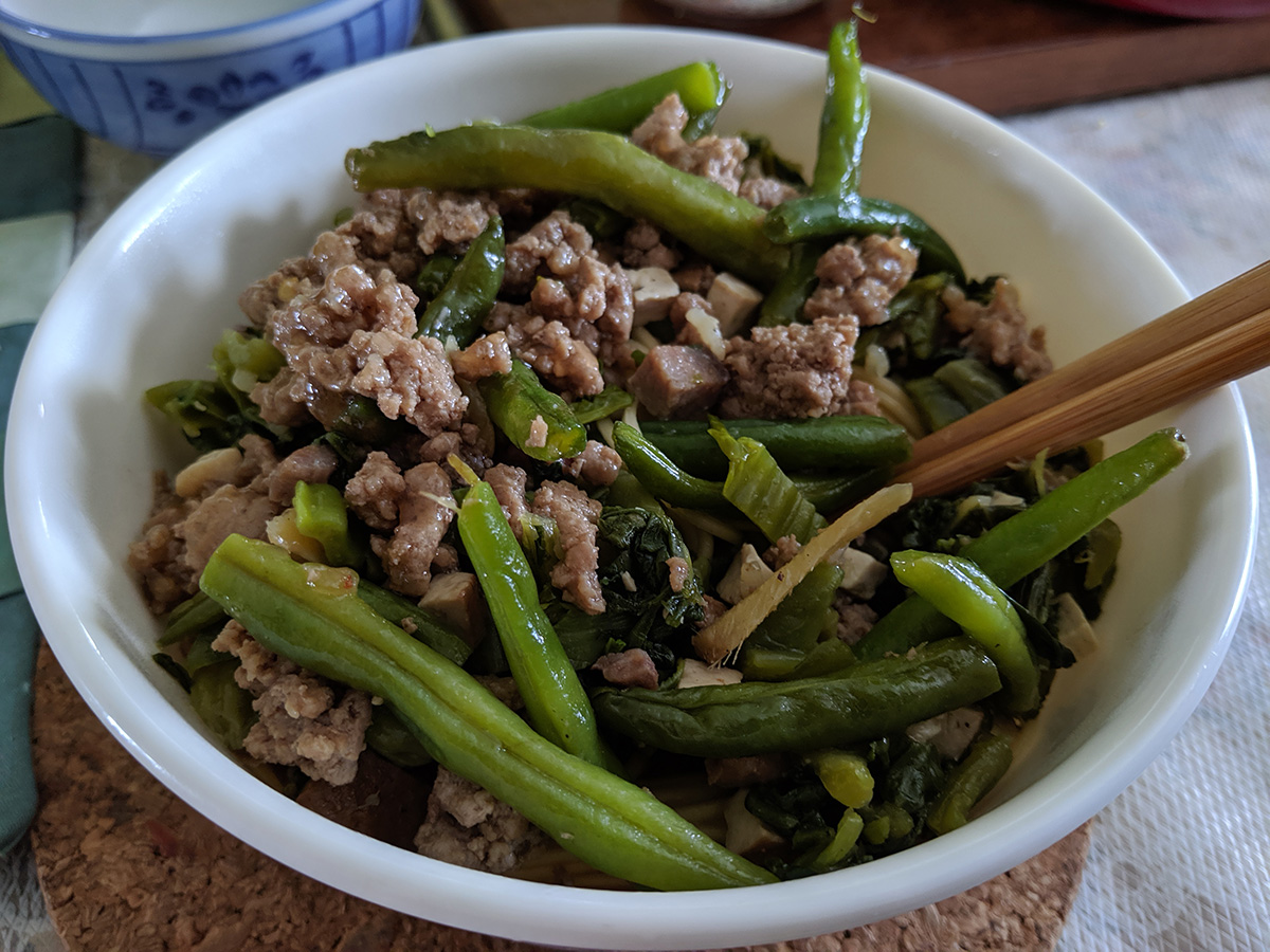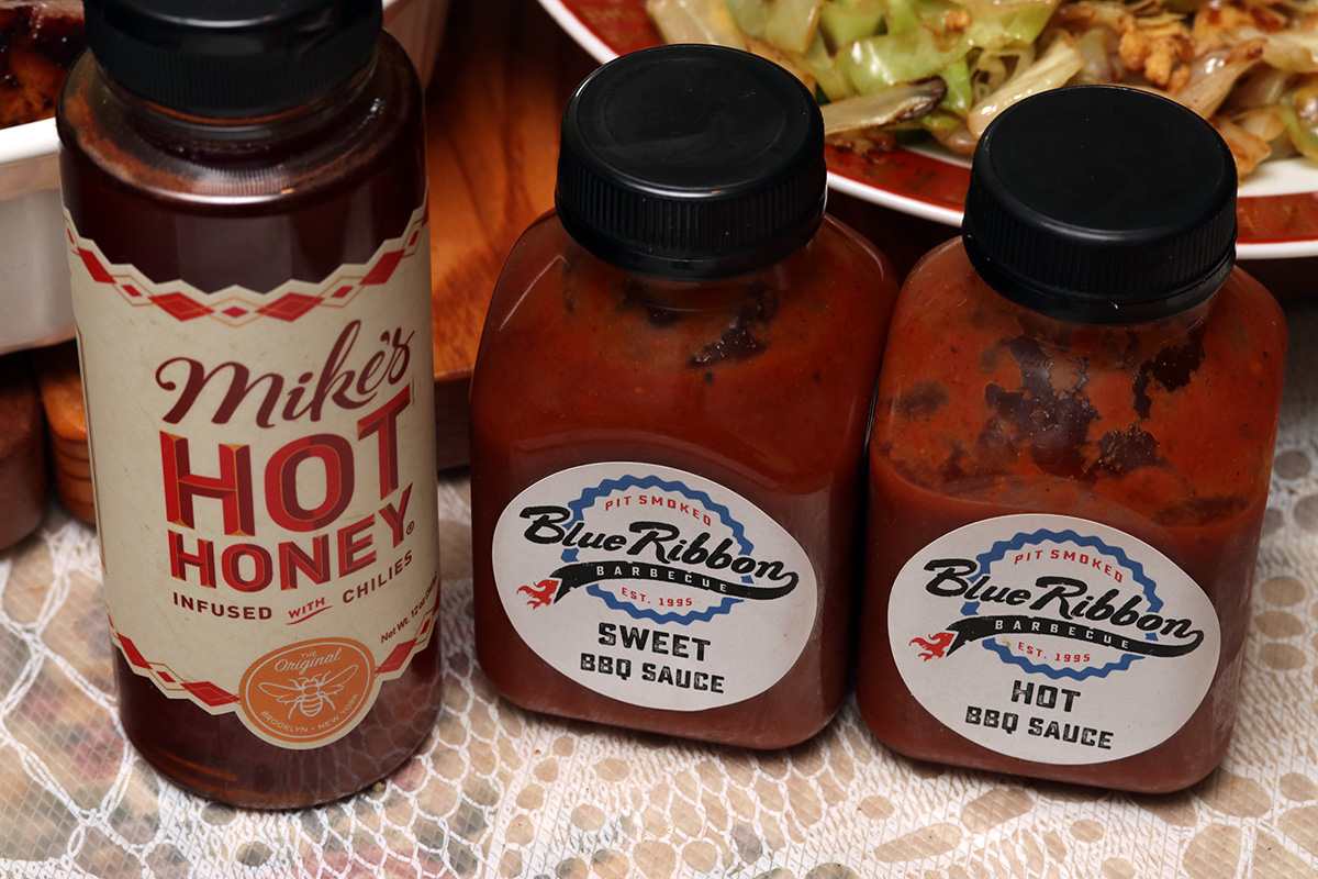 i wasn't expecting much, but the brined ribs with korean barbecue sauce were actually pretty good. the sauce is very sweet, so even the blackened portions tasted delicious. even better: a dab of blue ribbon sweet barbecue sauce with eat bite. just ribs alone was enough for dinner, but my mother also added rice with some cabbage stirfry. when i finally rode home and weighed myself, i was up 4 lbs. more than my average.