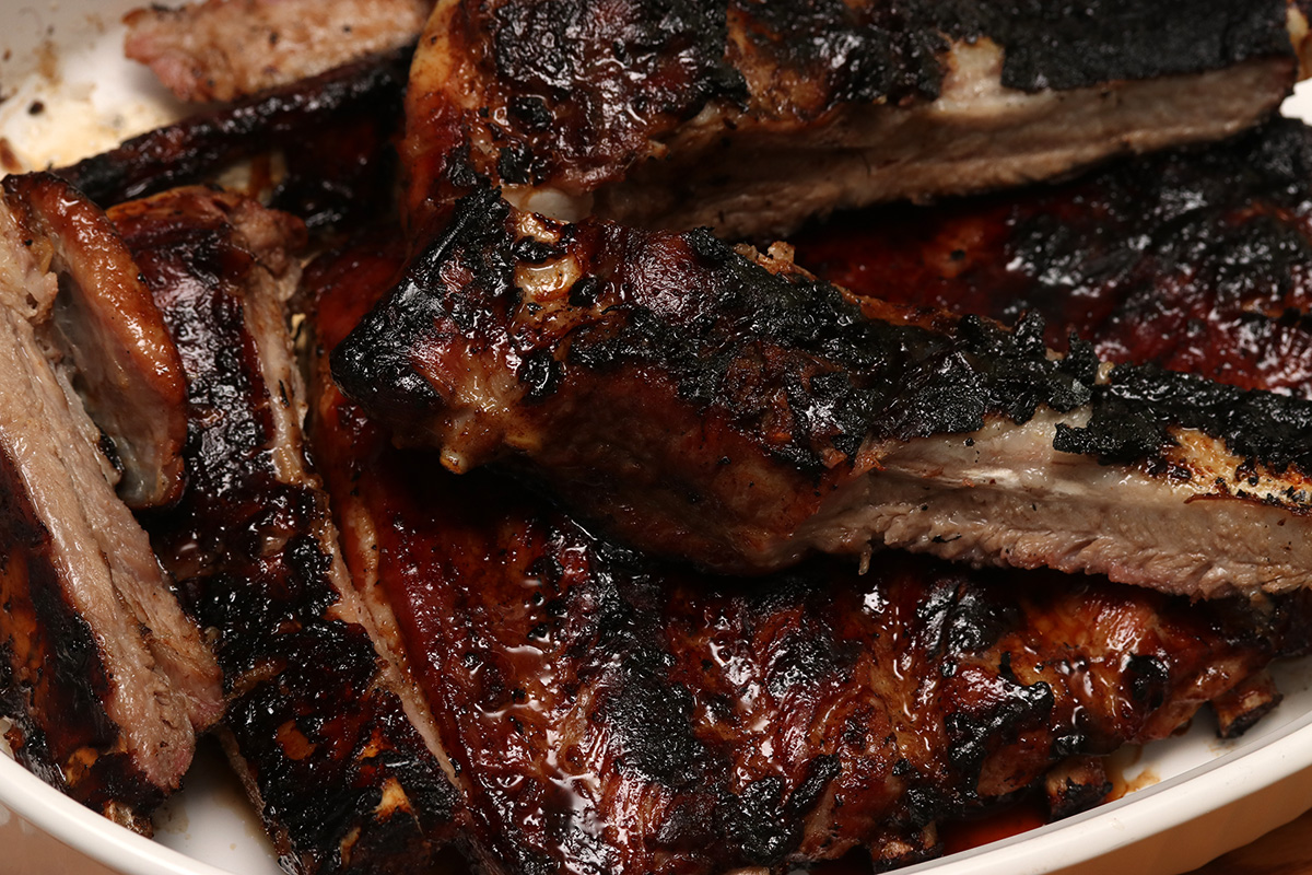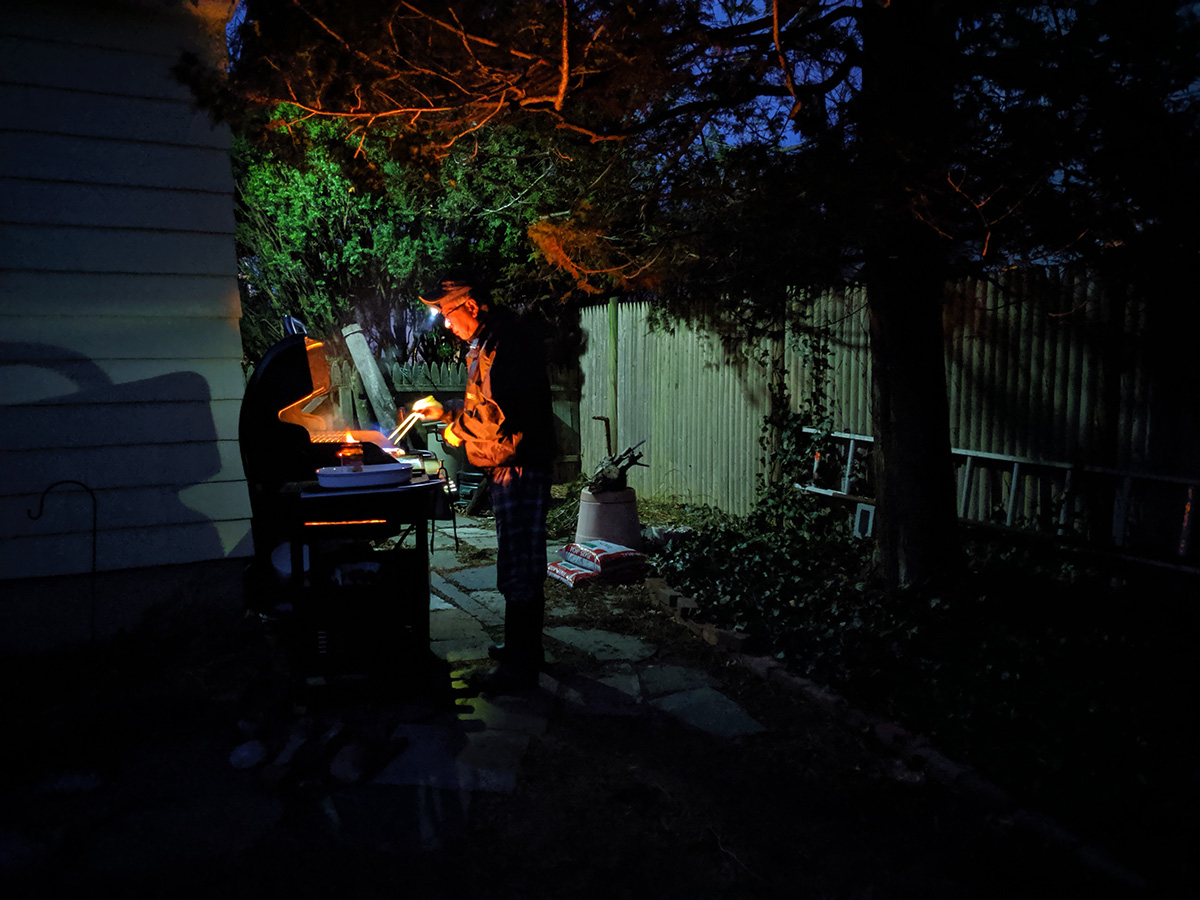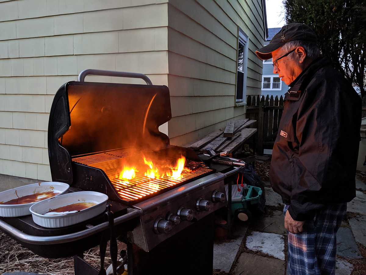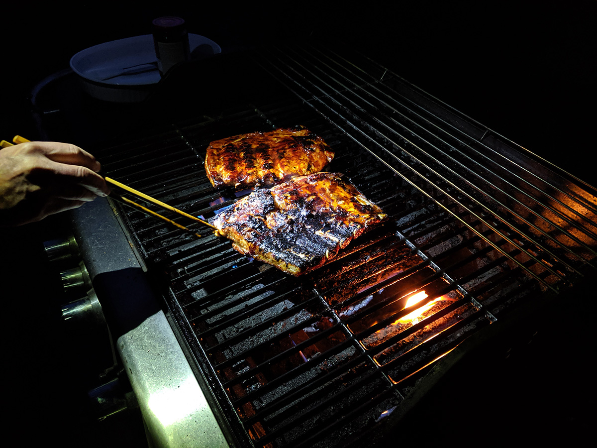 in the evening we did some night barbecuing. two slabs of ribs, first left to soak in a brine, before slathered with korean barbecue sauce 2 hours before grilling. by then the temperature had dipped into the 40's, a little chilly, but still warm by february standard. the sweet barbecue sauce did burn a little help, no help from the grease fire that suddenly flared up at the midway point, forcing my father to temporarily turn of the gas for fear of explosion. it was partly drippings from the ribs, but also leftover grease from our last barbecue, who knows when. after the grease had burned itself out, we put the ribs back on the grill for some slow cooking, applying some barbecue sauce back on the ribs. in all it was 12 minutes each side on grilling before another 20 or so minutes on slow barbecuing before the ribs were ready.