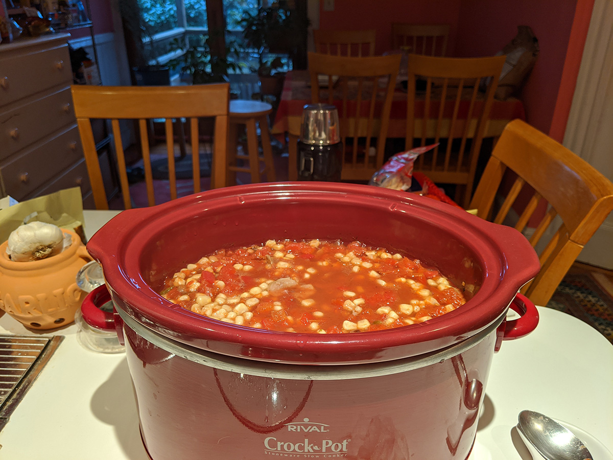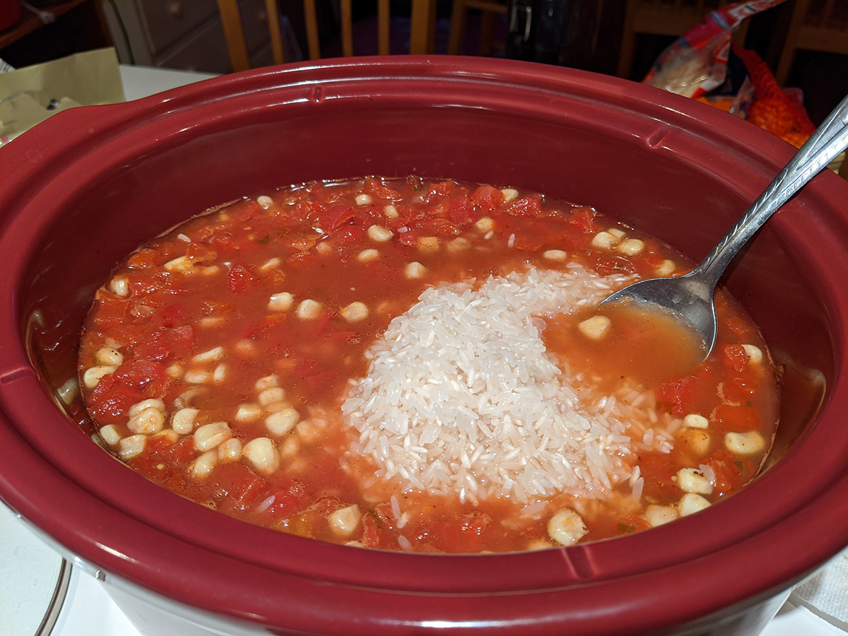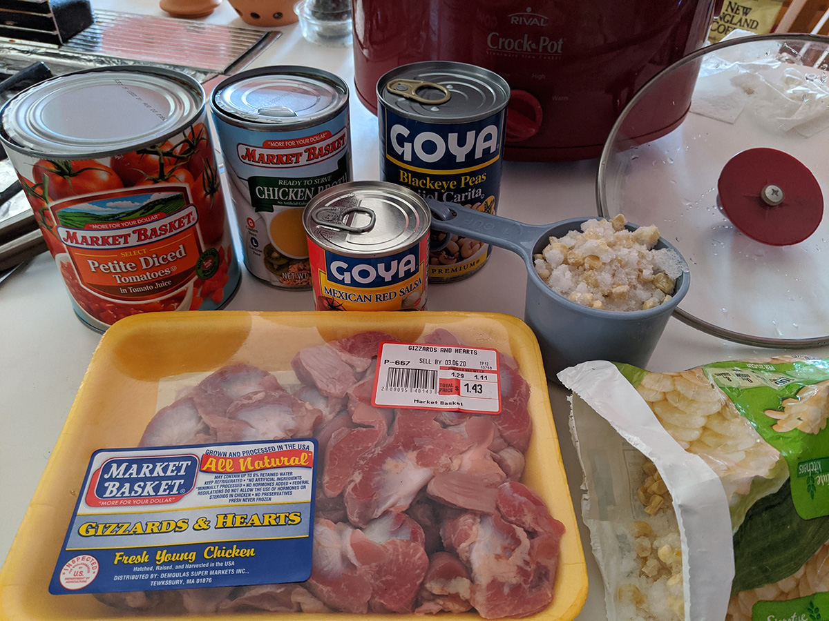 i made oatmeal for lunch. afterwards i started my rice and bean recipe in the slow cooker. it seemed too easy - just dump all the ingredients into the pot - i was curious what the final result would taste like. a can of diced tomatoes, can of chicken broth, can of blackeye peas, can of mexican red salsa, cup of frozen corn, and a pound of chicken gizzards and hearts. this would all slowcook for the rest of the afternoon, with the rice being added in the final half hour.