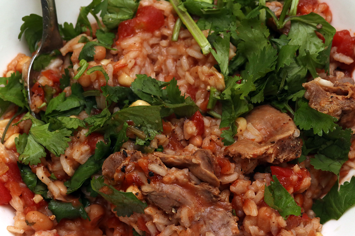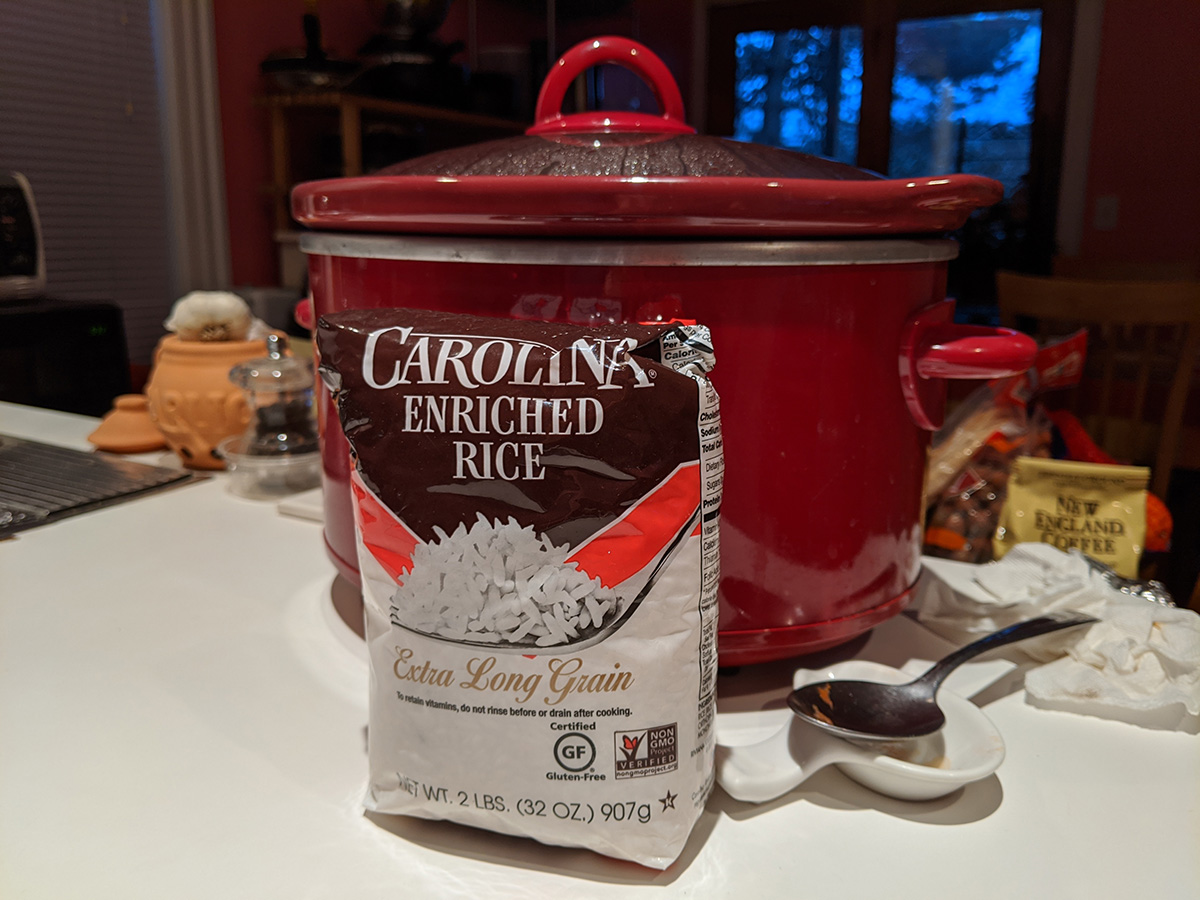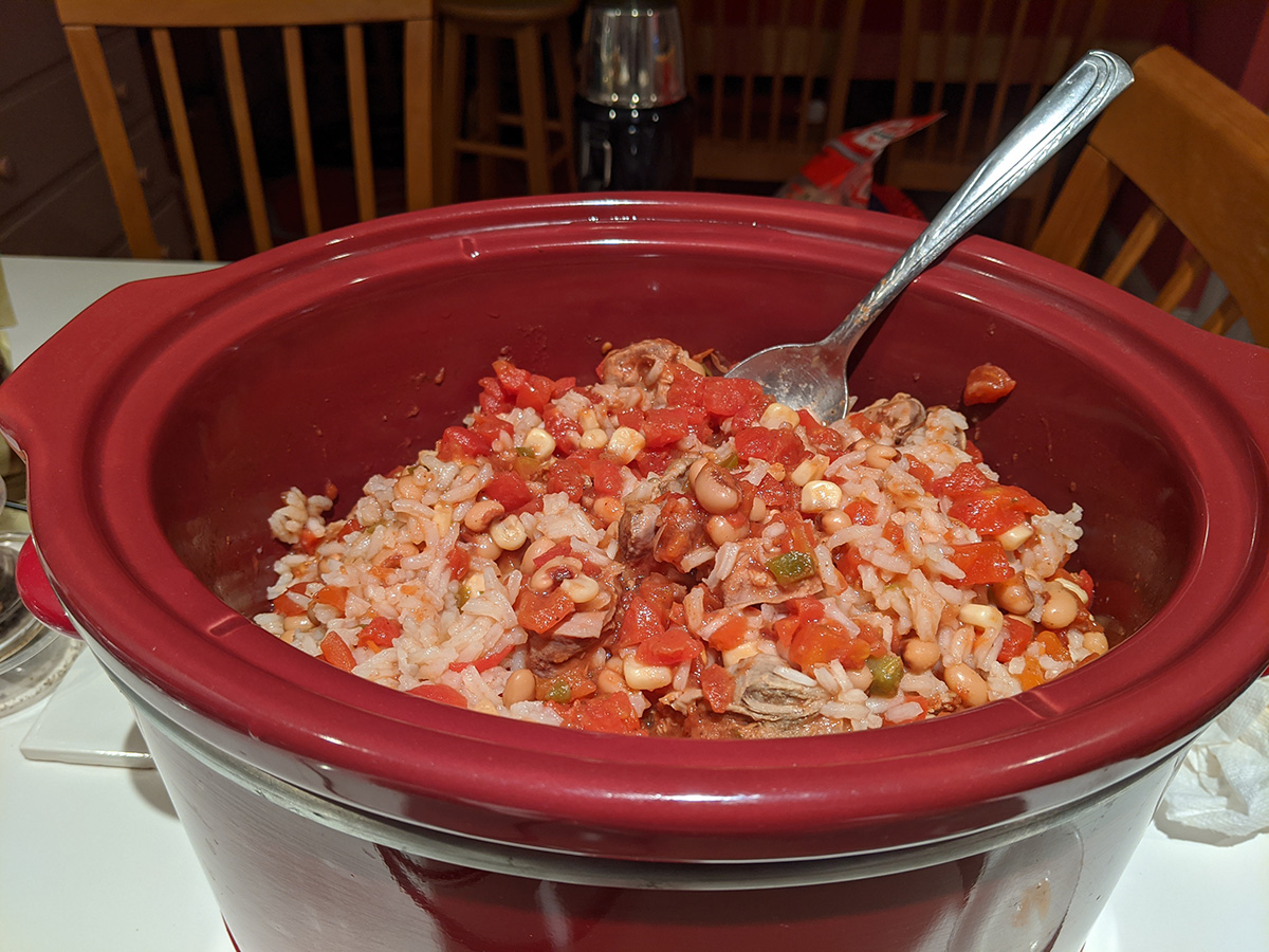 around 5:30pm i added the rice to my slow cooker. kevin came home by 5:45pm. he did a load of laundry then took a shower. my rice and beans were ready to eat by 6pm. i scooped a bowl and garnished it with some cilantro and some fresh ground pepper. it was okay, a little mild, could use a stronger flavor. the chicken gizzards was a weird choice, it gave the dish a raw taste; better to have used a neutral choice of meat, like chicken breasts. now i have a whole pot of leftovers i can eat for the rest of the week.