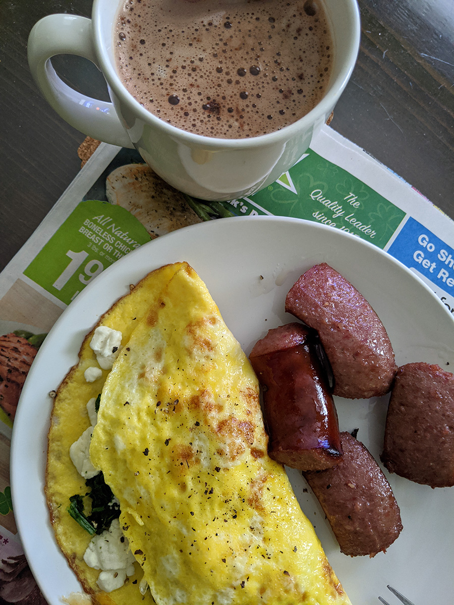 i finally made lunch by around 2pm: goat cheese and spinach omelette with kielbasa sausages and hot chocolate. i thawed the frozen spinach in the microwave before hand. i added some half & half to the 2 eggs to make a fluffier omelette. the omelette itself was sort of bland - more sourness from the goat cheese - but the salty sausages balanced everything, likewise the sweet hot chocolate.