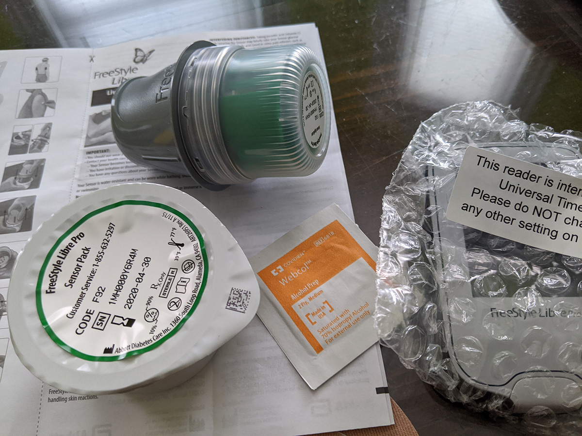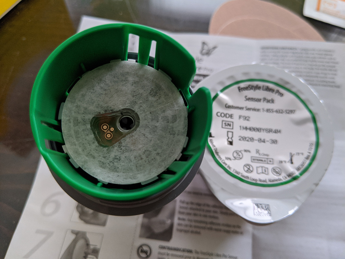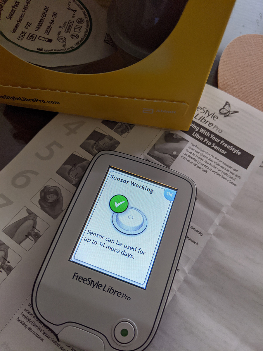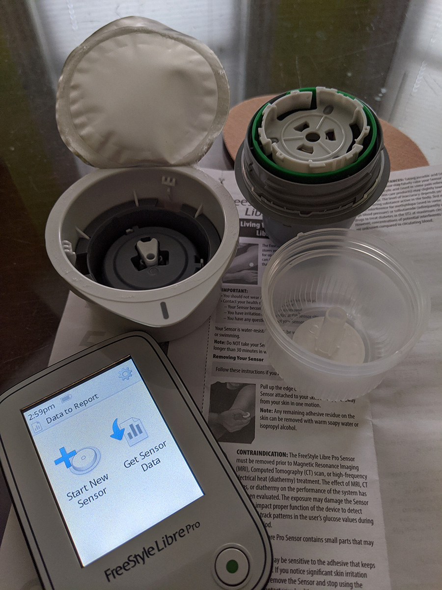 the important thing i had to do this morning was to put on my blood sugar sensor, the brady news nearly made me forget. i'd reviewed the instructions yesterday, but took a look at them one more time. the sensor i was putting on was the freestyle libre. it comes with this fancy applicator, the sensitive sensor in a separate packaged container.