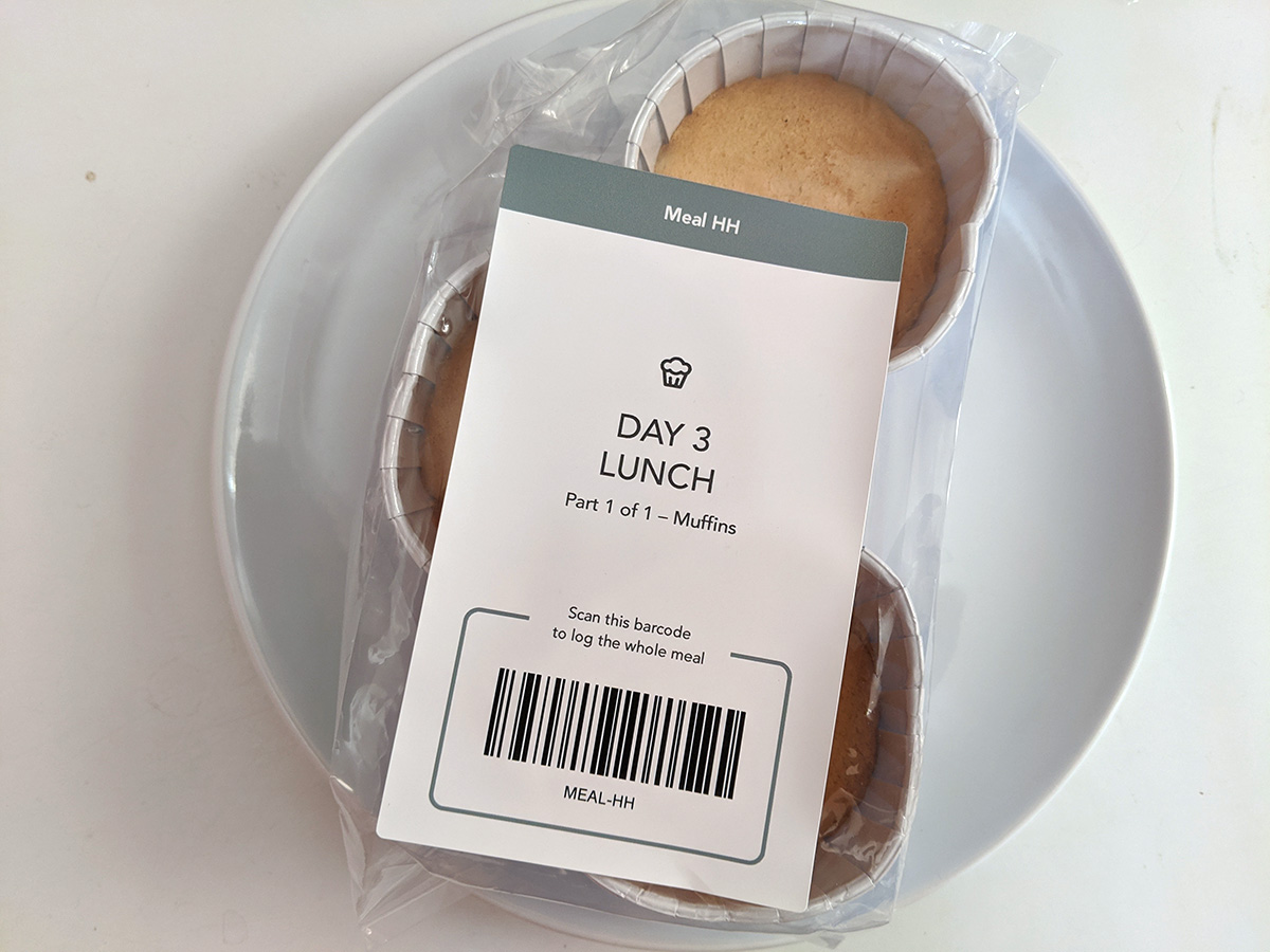 this morning's set meal was 2 oily blue muffins. not blueberry muffins, buy rather blue muffins, dyed with food coloring for a gut transit time test. i thought i'd see blue coming out the other end immediately, but i looked it up online and discovered it normally takes 30-40 hours. for lunch it was 3 vanilla muffins; i overheated them in the microwave so they were crunchy on the bottom rather than soft all over.
