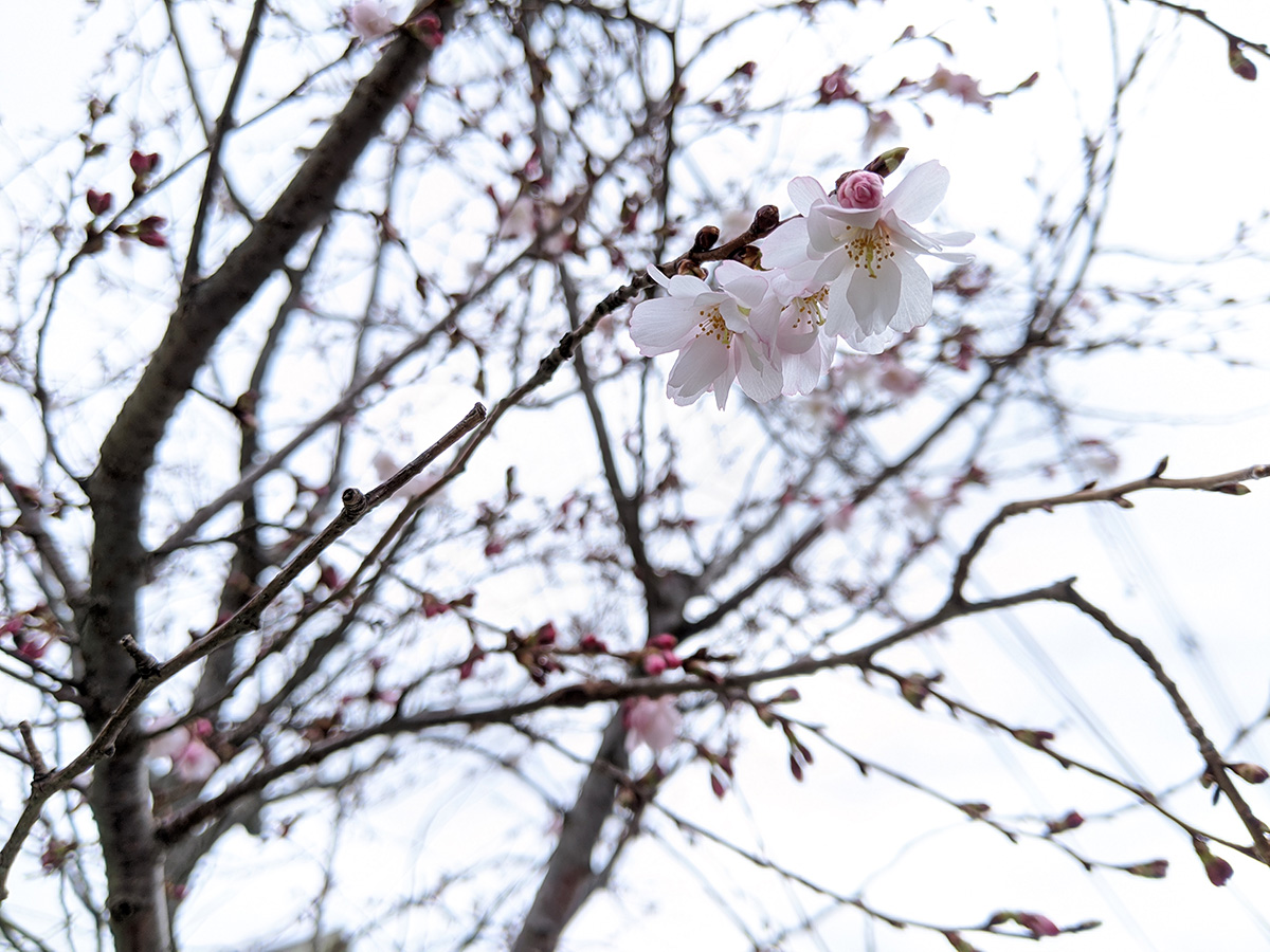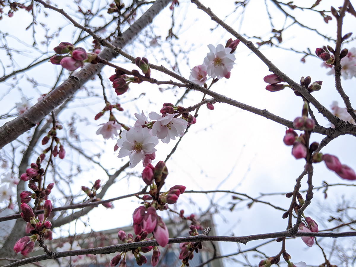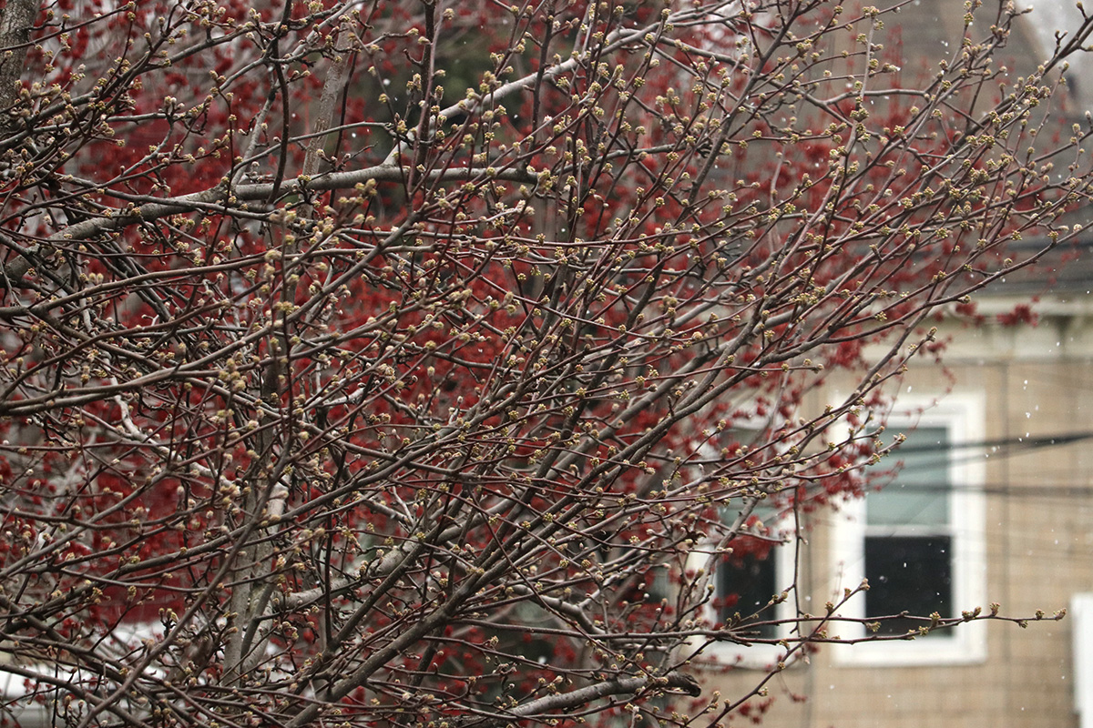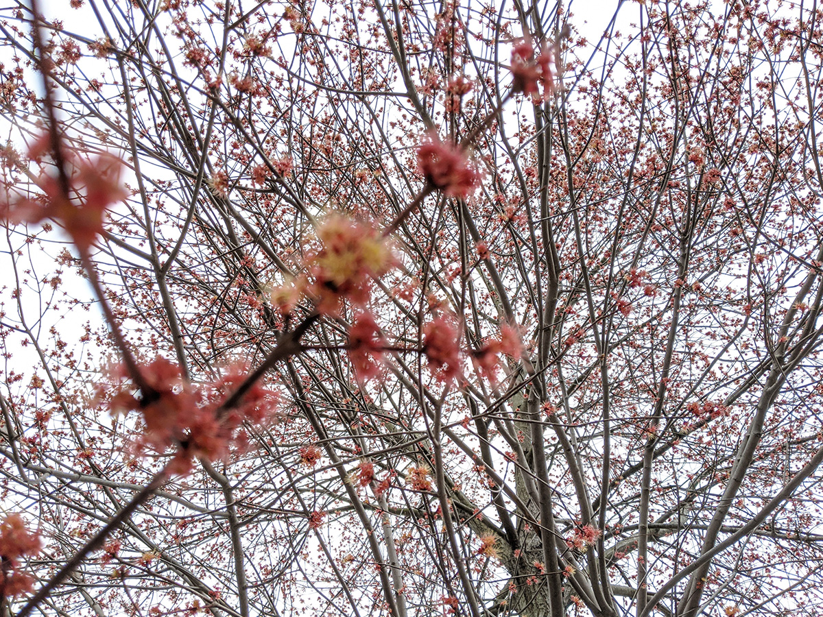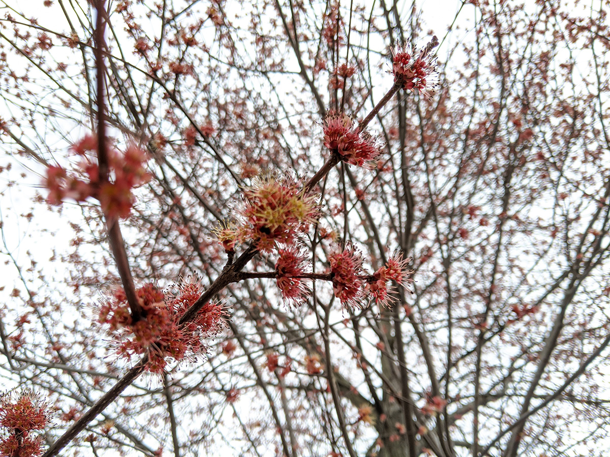 coming back, i stopped to admire some of the flowering trees along the beacon street bike path. i noticed some flowering cherries. these were not the okame i spotted yesterday, but rather Prunus subhirtella 'autumnalis' which have pale pink flowers. apparently they can also flower during the fall, and i vaguely recall seeing some flowers last autumn, though i can't find my notes about it. elsewhere, i saw some red flowers which are of of the sugar red maples. these were growing on private property so they didn't have any id tags but i remember these trees from their fall foliage. the flowers i saw were male flowers.