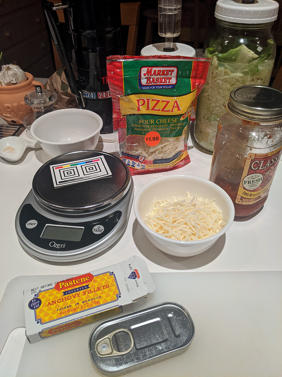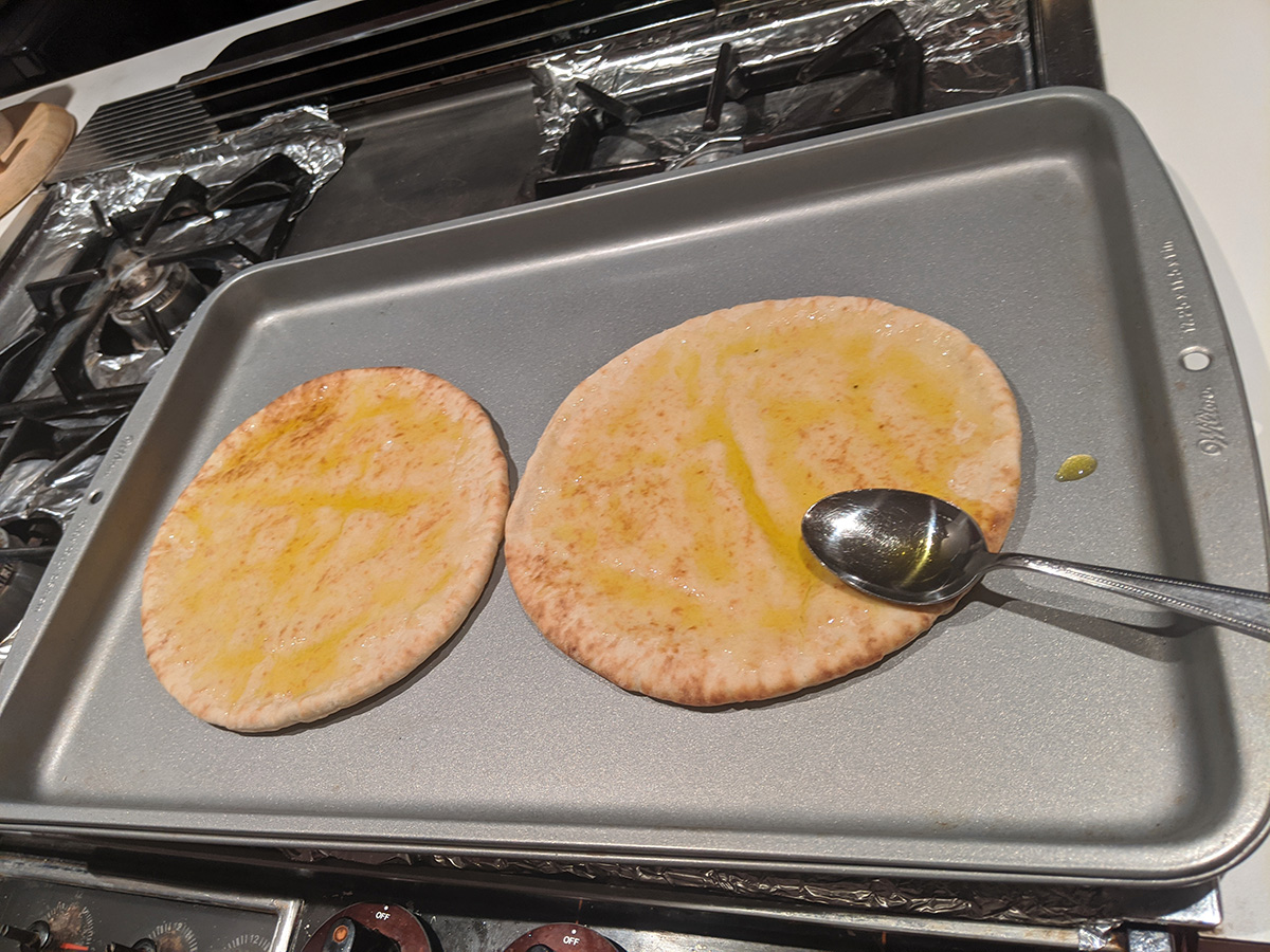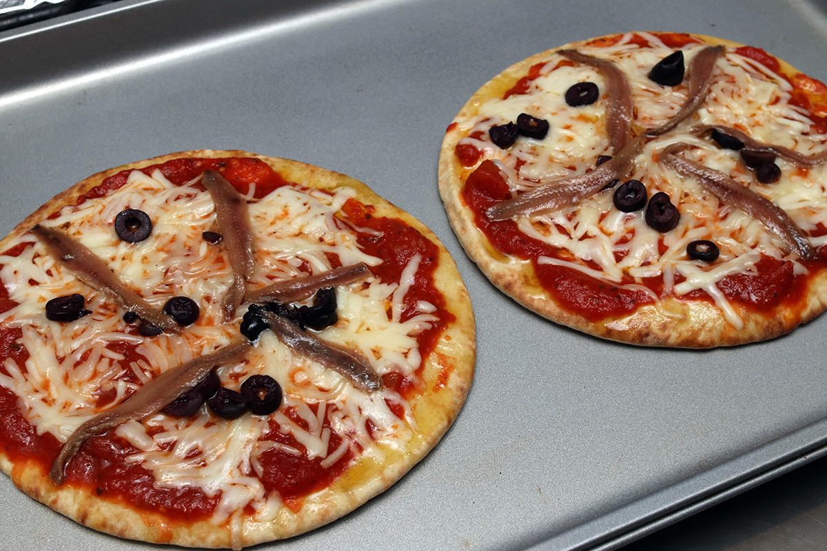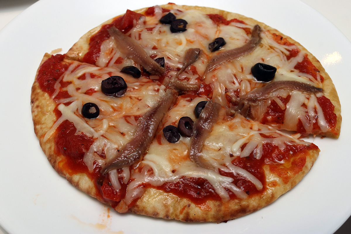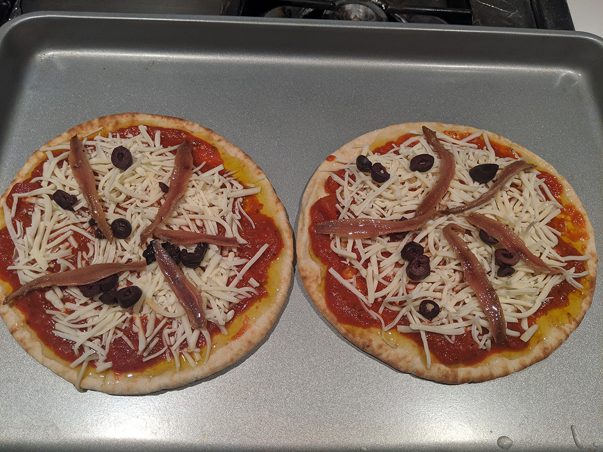 for dinner i made pita bread pizza again, this time with larger pita breads and a lower oven temperature so i wouldn't scorch the pizza (last time i used broil, too hot). for toppings i cut up some olives and put some anchovies. i love anchovies but only on pizzas. i baked them at 400°F for 7 minutes. the pita bread was still soft (like pita), not like the crispier flat-bread crust of last time. i think i put too much tomato sauce because it made the pizza a little soggy; next time just a tiny bit of sauce. it was filling dinner nonetheless.