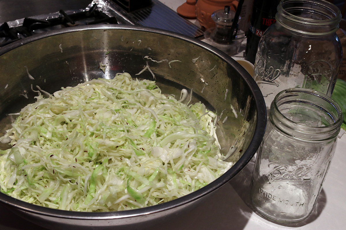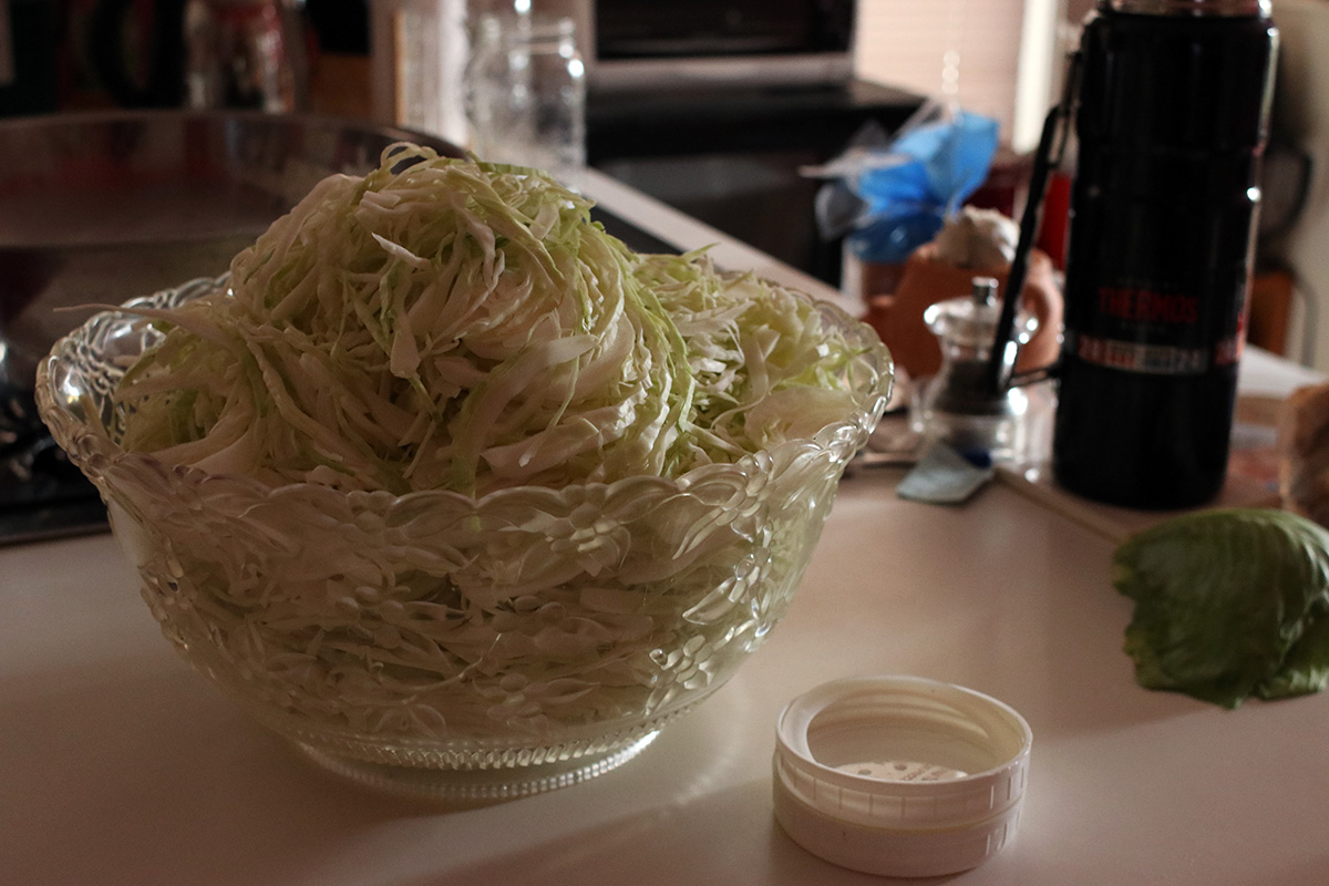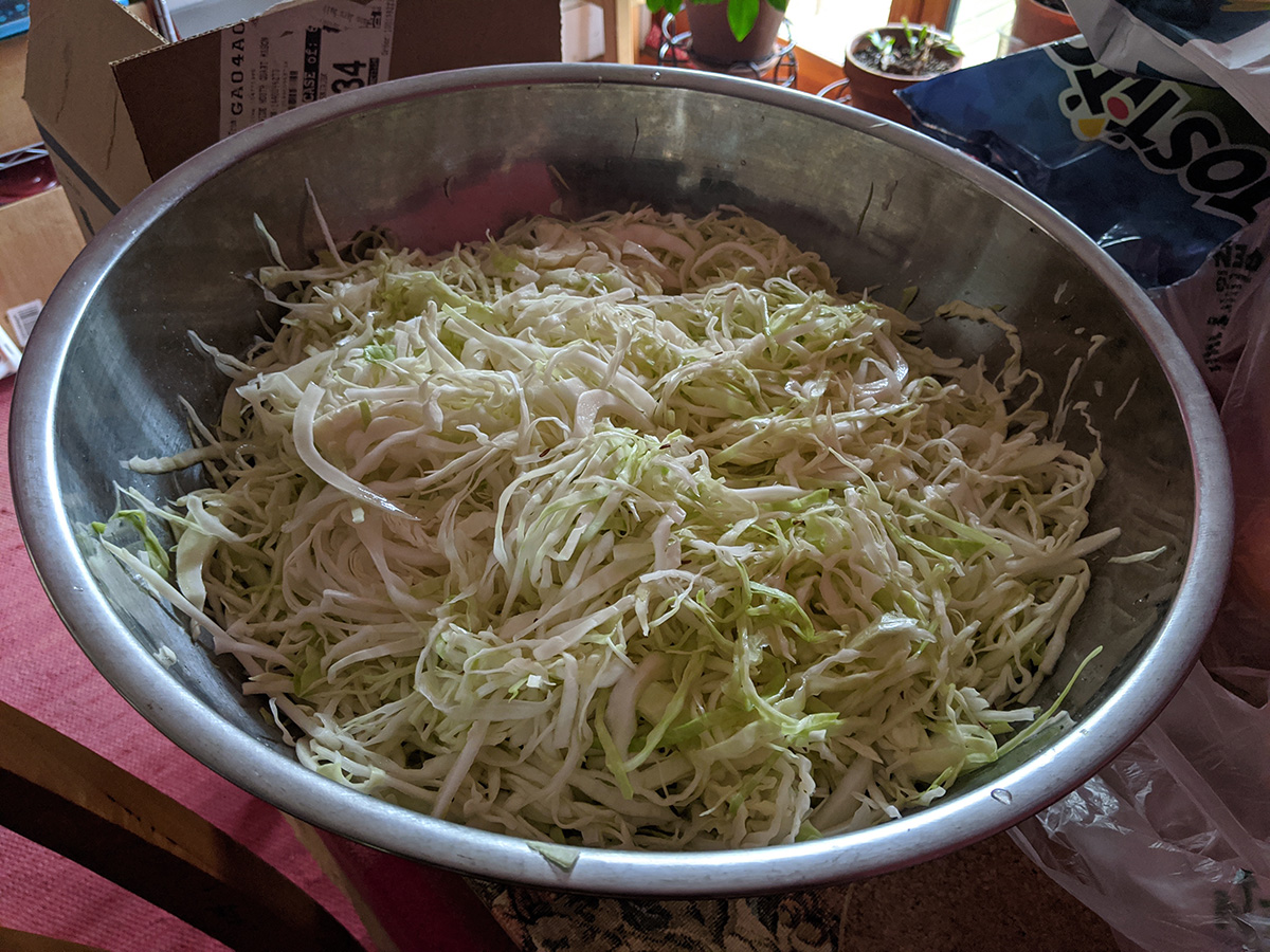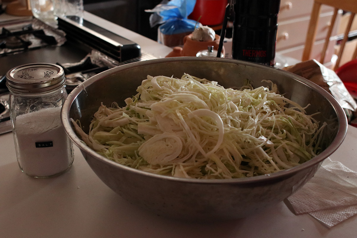 first project was to turn the two cabbages i bought weeks ago into sauerkraut. the leaves on the bottom were starting to turn yellow and brown, i had to use use up the cabbages before they went bad. i cut the cabbages into quarters, removed the cores, before hand slicing them as thin as possible. i ended up with 5.13 lbs. of sliced cabbage, which i had to transfer from the punch bowl into a larger stainless steel mixing bowl. using the ratio of 1 tbsp of salt to 1.75 lbs. of cabbage (or 800g), i ended up sprinkling 3 tbsp of kosher salt onto the cabbage. recipe also called for caraway seeds, i barely had a tablespoon left, so i sprinkled everything into the mix.