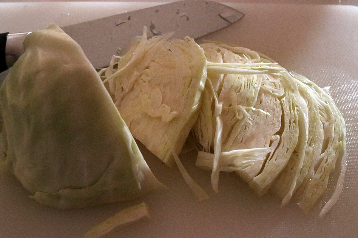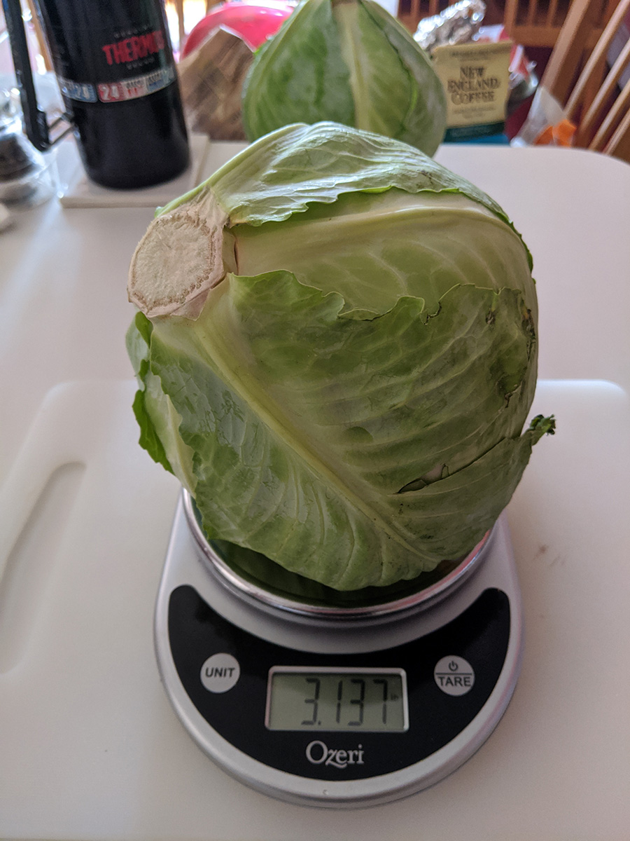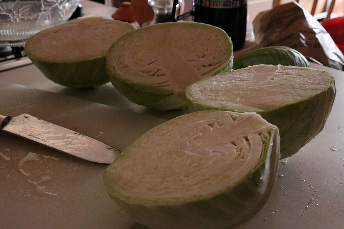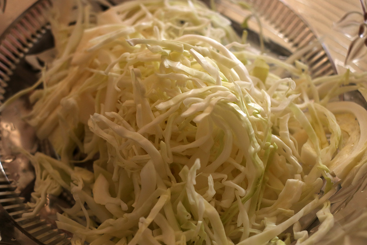 first project was to turn the two cabbages i bought weeks ago into sauerkraut. the leaves on the bottom were starting to turn yellow and brown, i had to use use up the cabbages before they went bad. i cut the cabbages into quarters, removed the cores, before hand slicing them as thin as possible. i ended up with 5.13 lbs. of sliced cabbage, which i had to transfer from the punch bowl into a larger stainless steel mixing bowl. using the ratio of 1 tbsp of salt to 1.75 lbs. of cabbage (or 800g), i ended up sprinkling 3 tbsp of kosher salt onto the cabbage. recipe also called for caraway seeds, i barely had a tablespoon left, so i sprinkled everything into the mix.