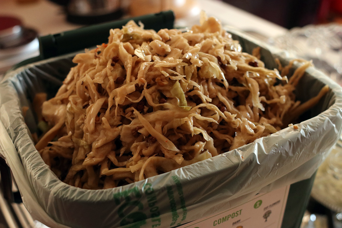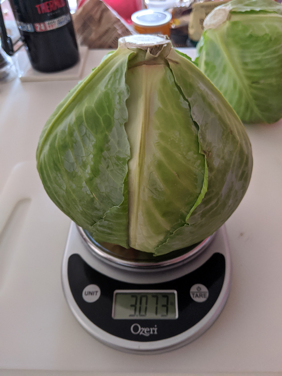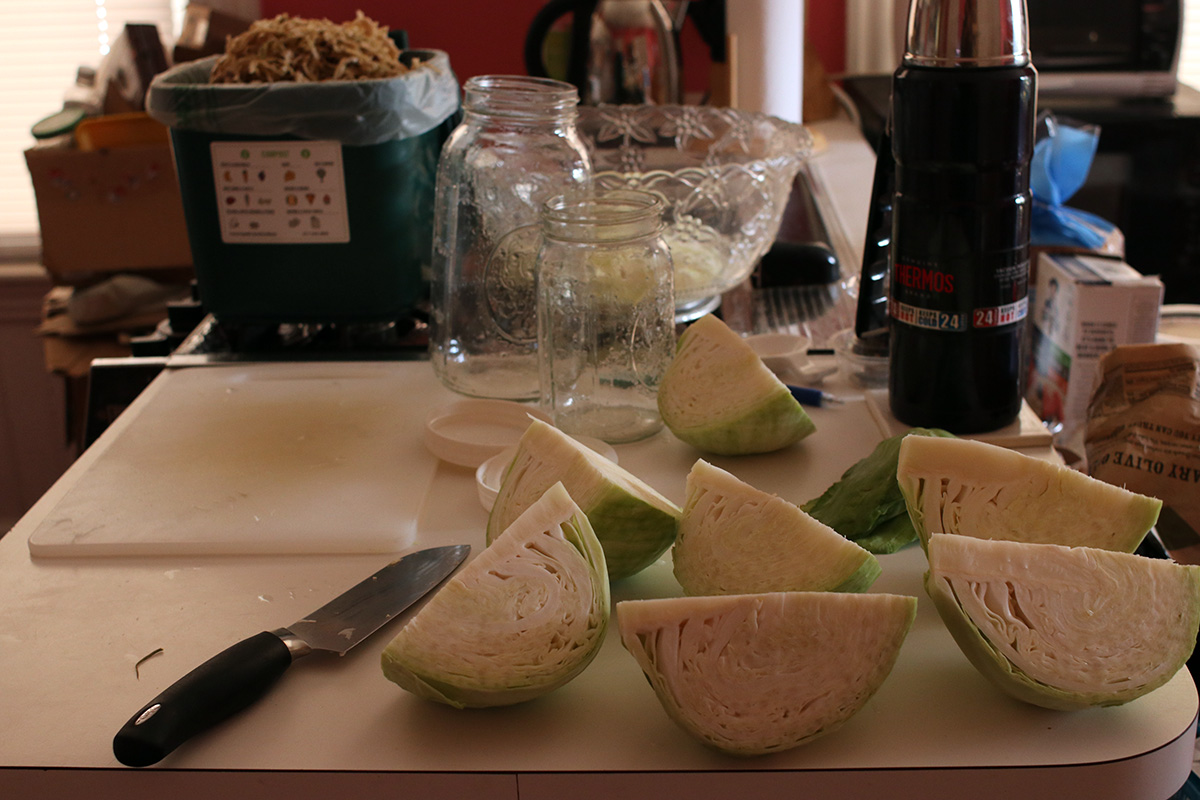 i was looking for the proper size containers to hold my sauerkraut. i have a bunch of wide-mouth quart size jars but i only have 2 lids with fermenting airlocks so i can only really do 2 jars, and all the sauerkraut wouldn't be able to fit. i do have old jars of sauerkraut in the fridge that i ended up throwing out just so i could reuse the jar. one was a quart size, the other was a half gallon, a real fermentation workhorse. the old sauerkraut were brown and rather dry looking. one of them was a jar of sichuan paocai inspired sauerkraut i made. all of that would be going to the compost bin.