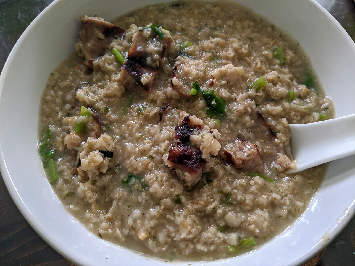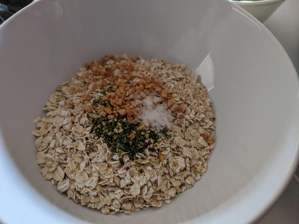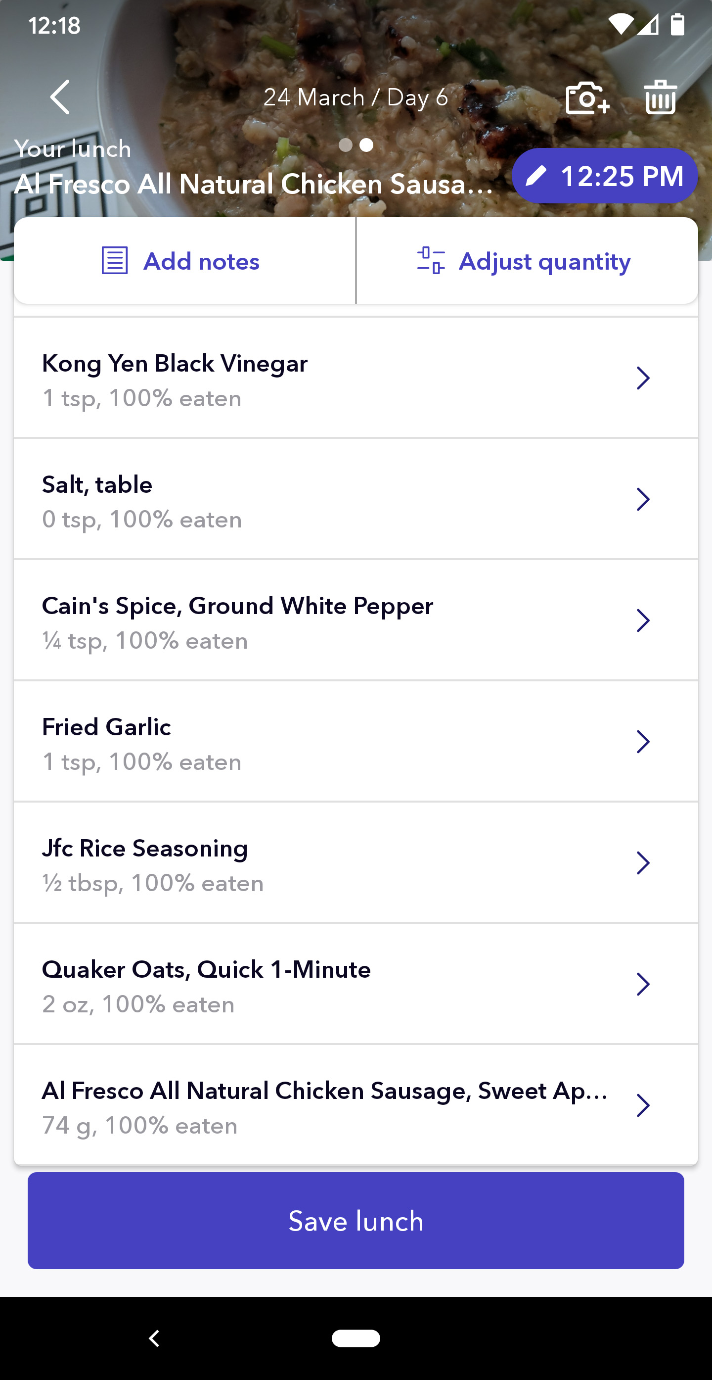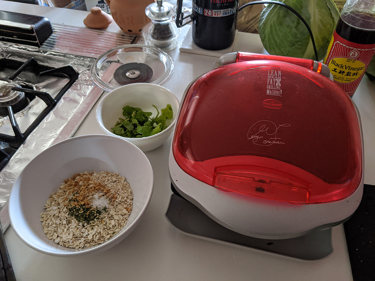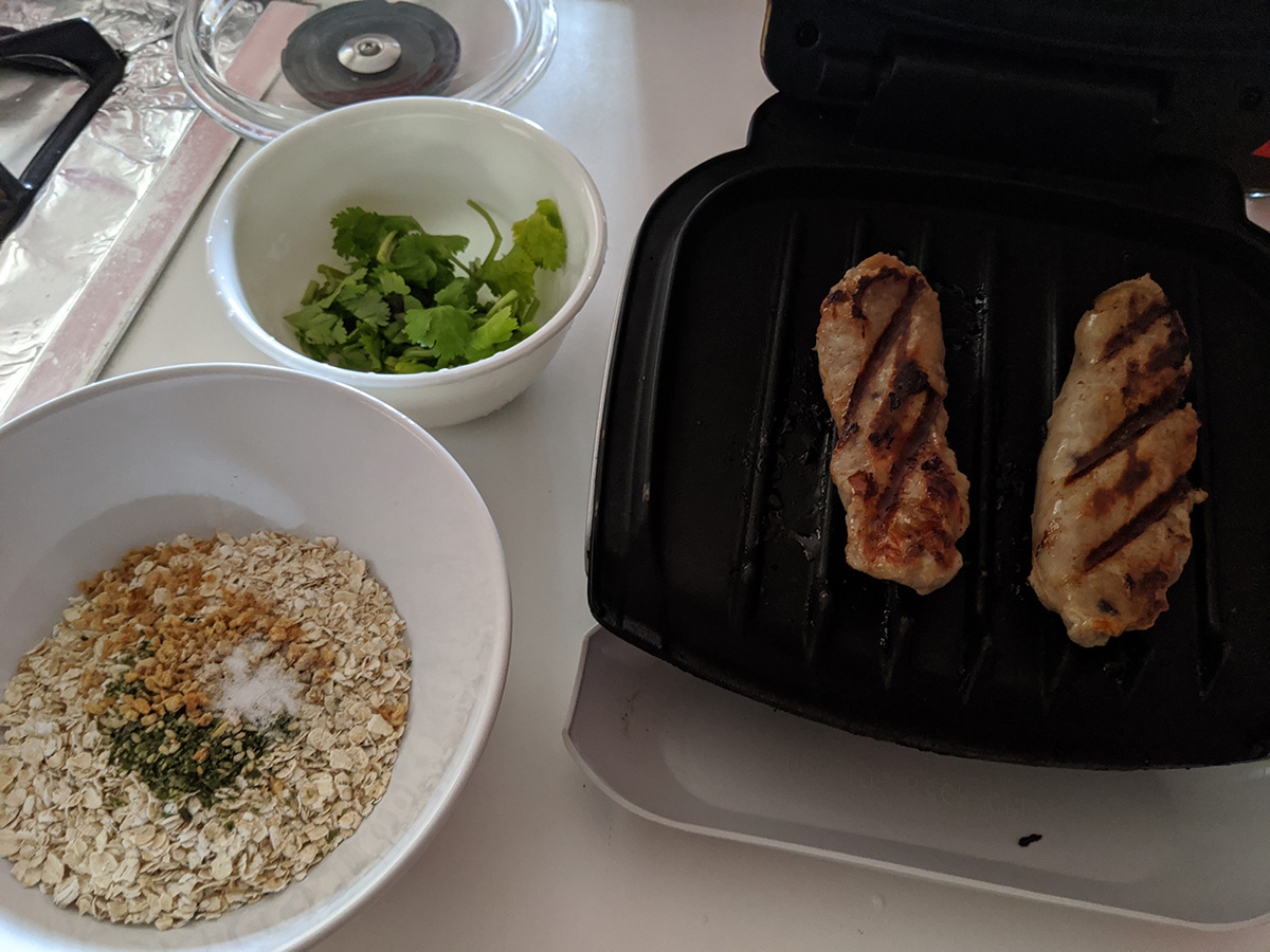 i was already preparing my lunch before my fast was even over, nice to be able to eat a normal lunch for a change. i was making my chicken sausage oatmeal, defrosted a frozen sausage overnight. unlike the refrigerated sausages i normally get which are already pre-cooked, these frozen ones (same brand) were actually raw. my trusty foreman grille made short work of cooking the sausage once i sliced it in half length-wise.